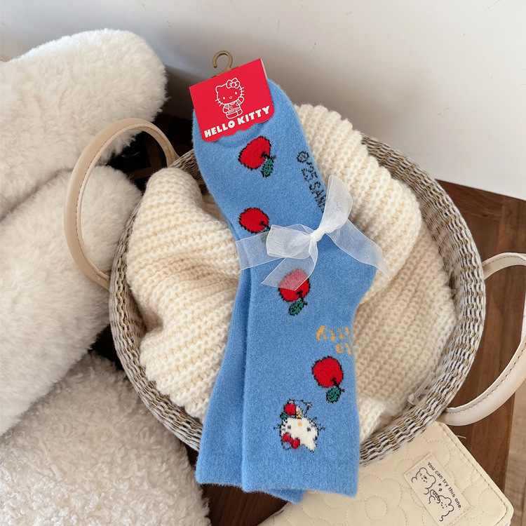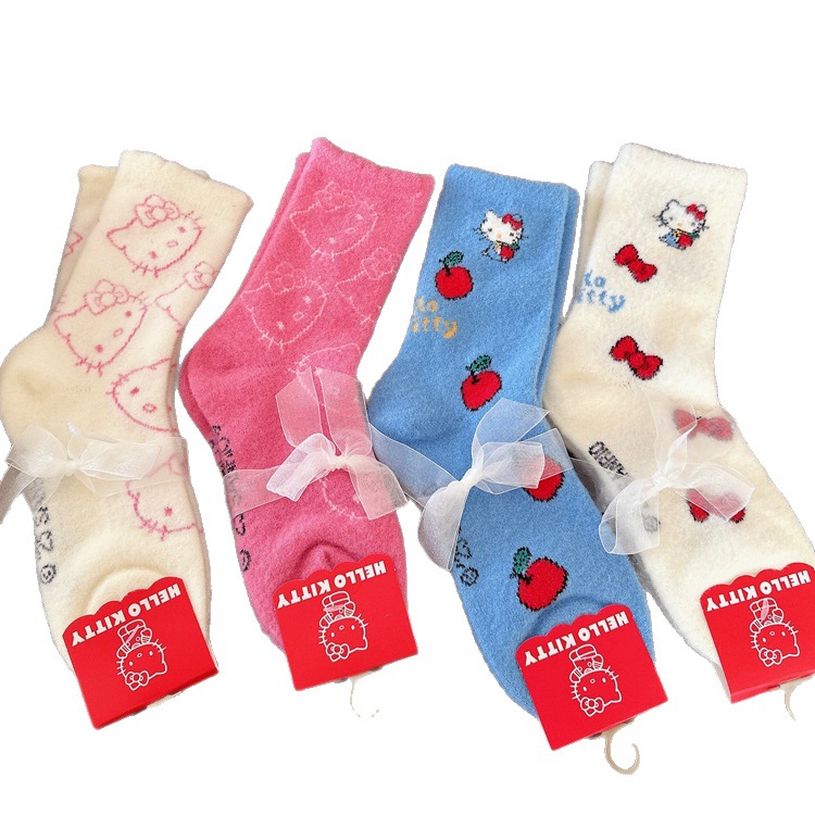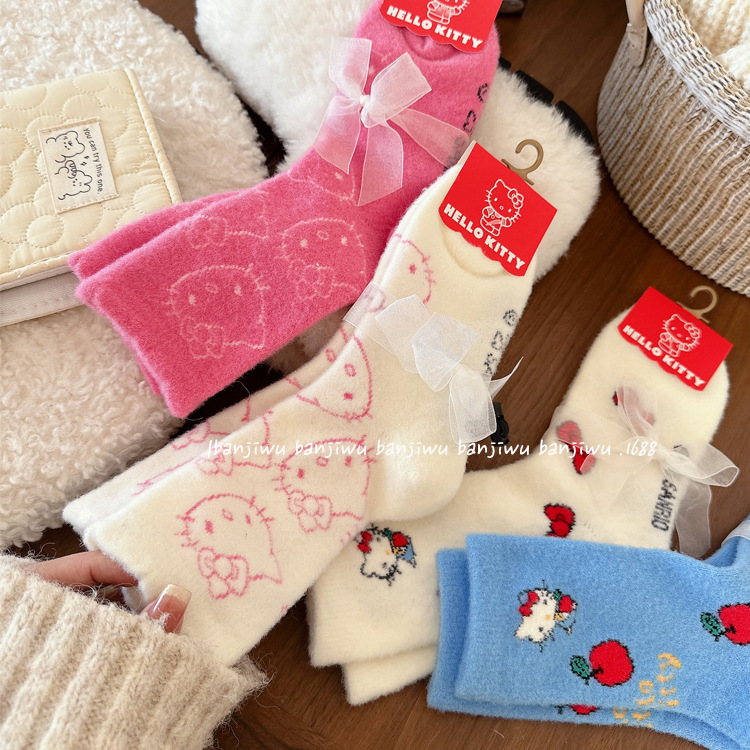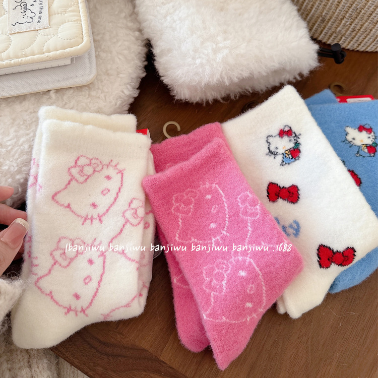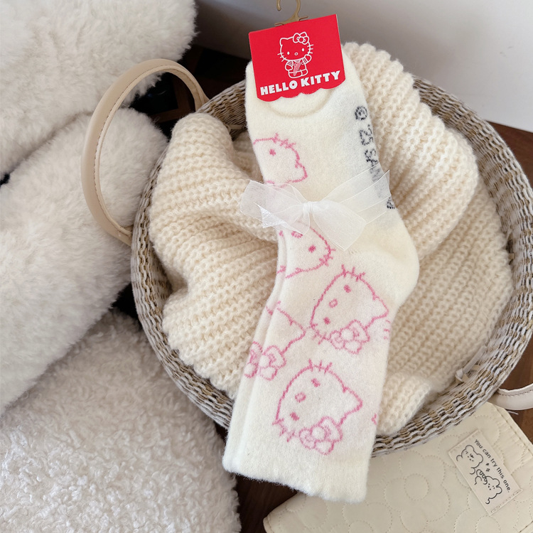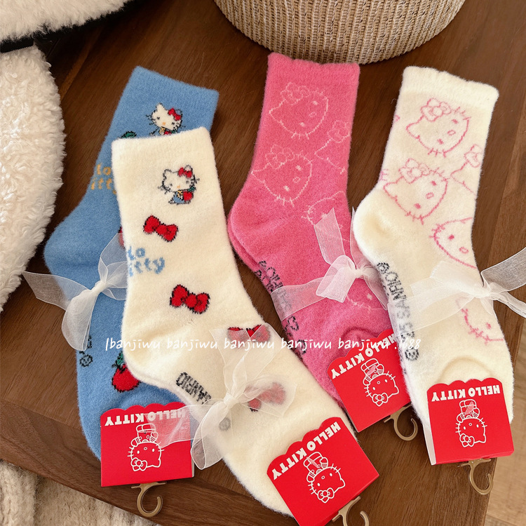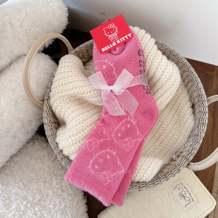 珊瑚绒袜子女中筒袜冬季加厚保暖地板袜hellokitty联名家居睡眠袜