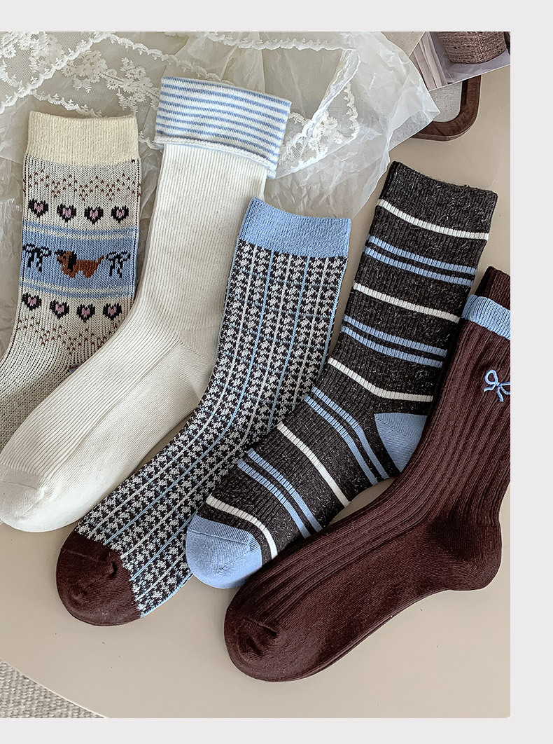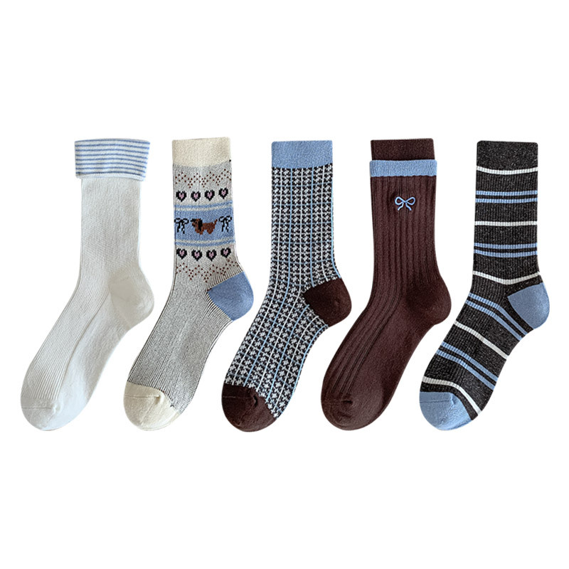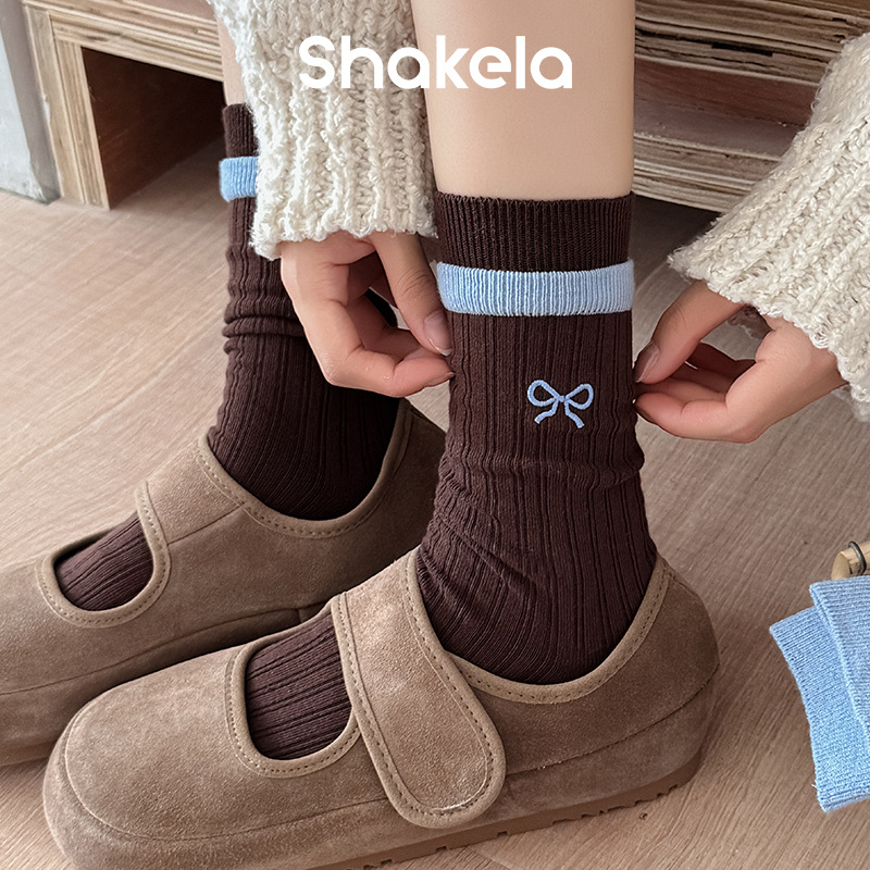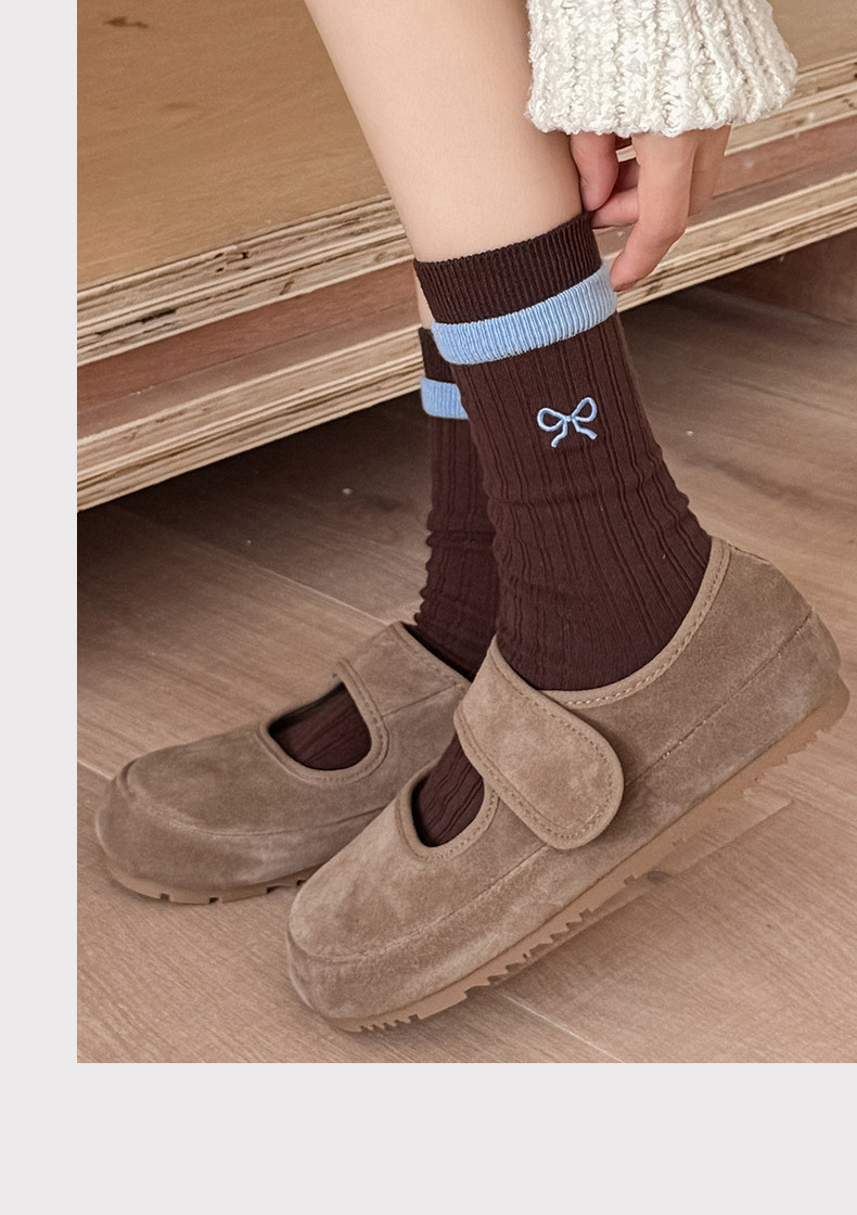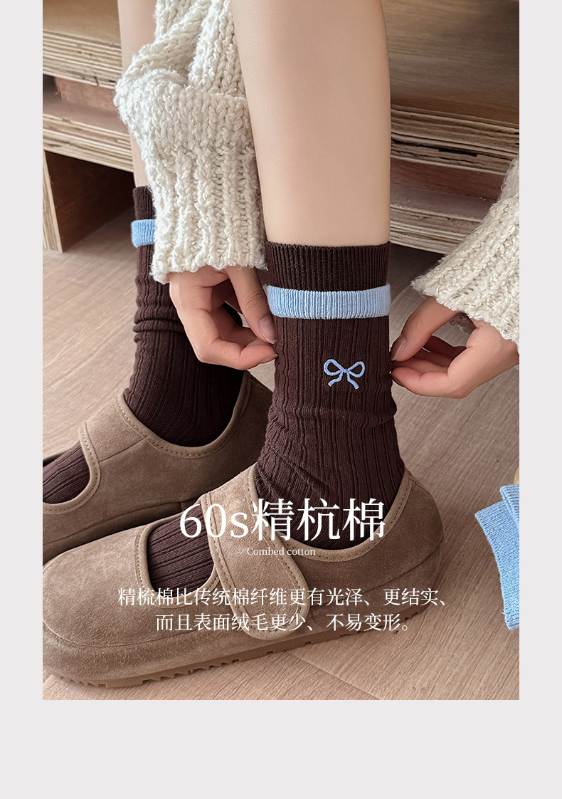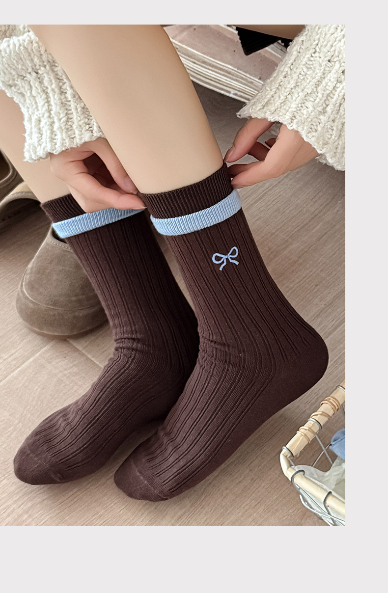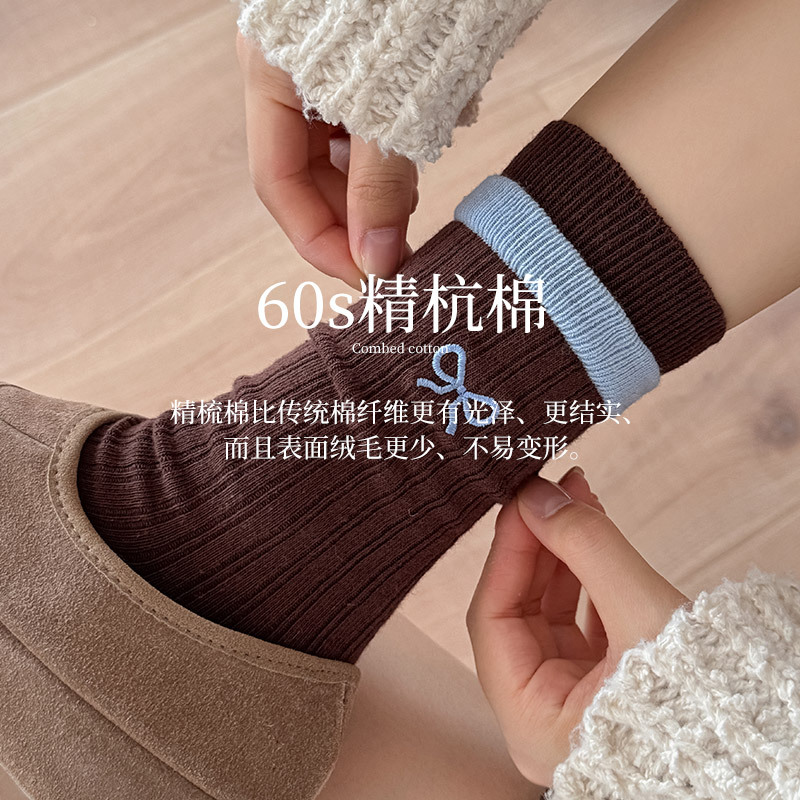 秋冬新款韩系刺绣中筒袜双针双路学院风蝴蝶结条纹蓝咖系列堆堆袜