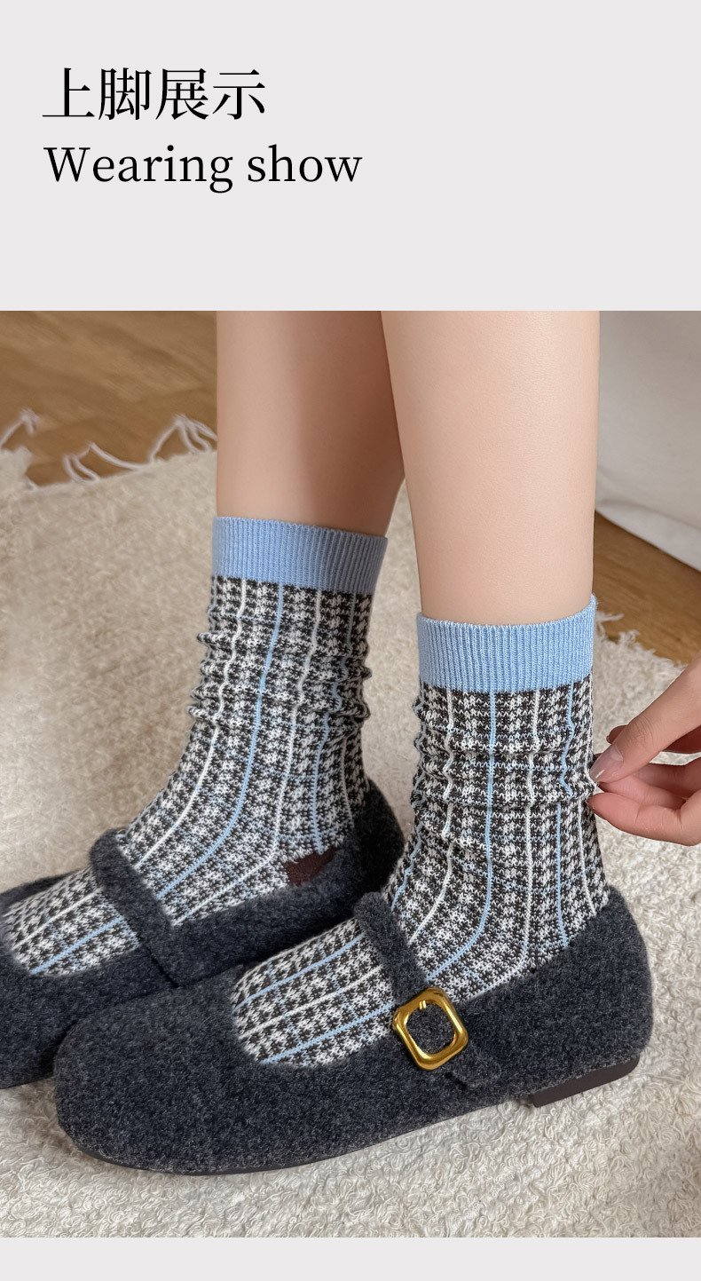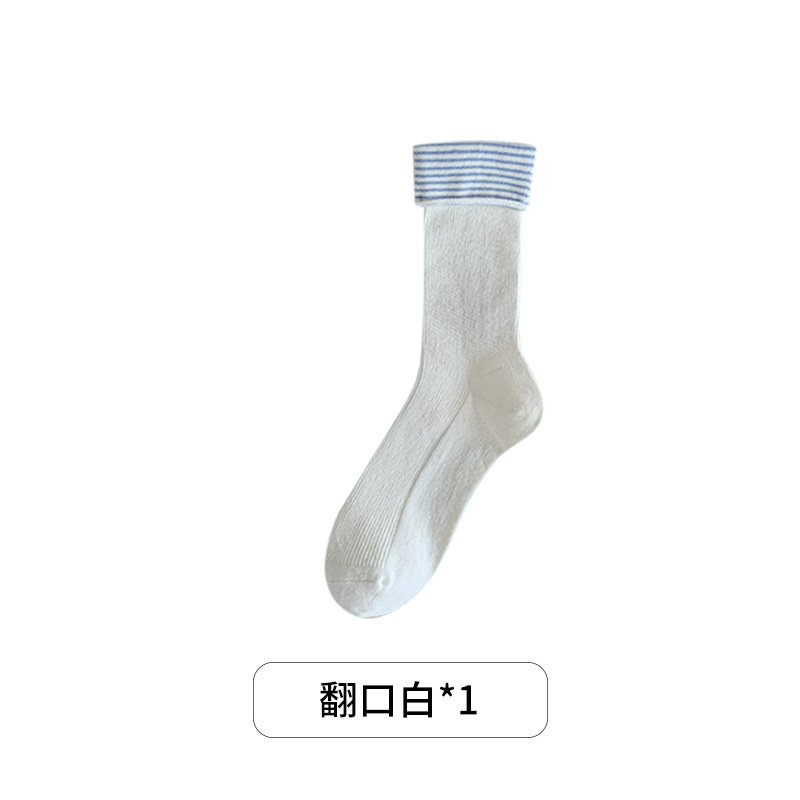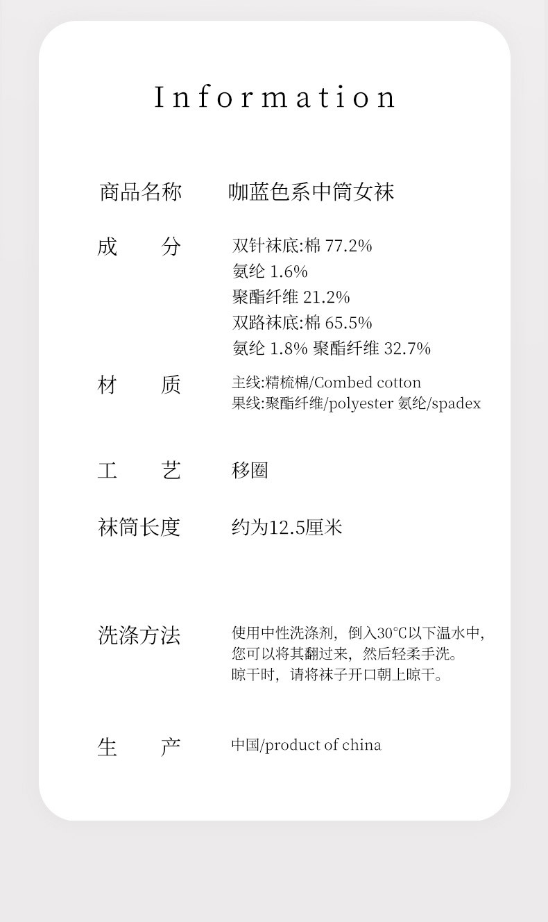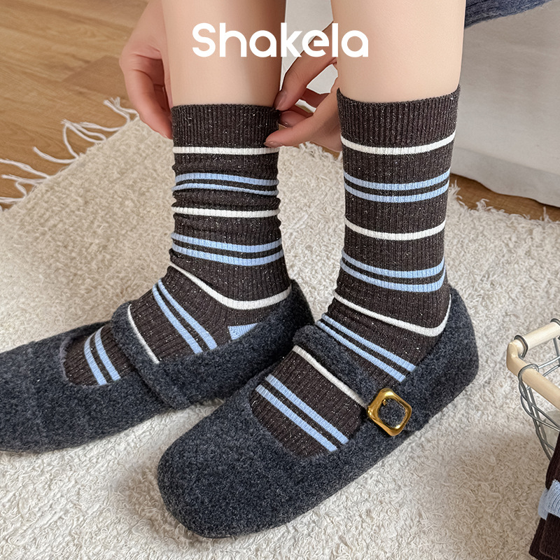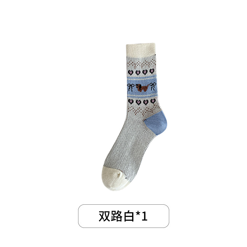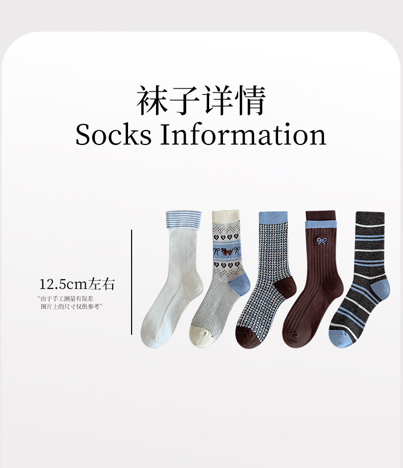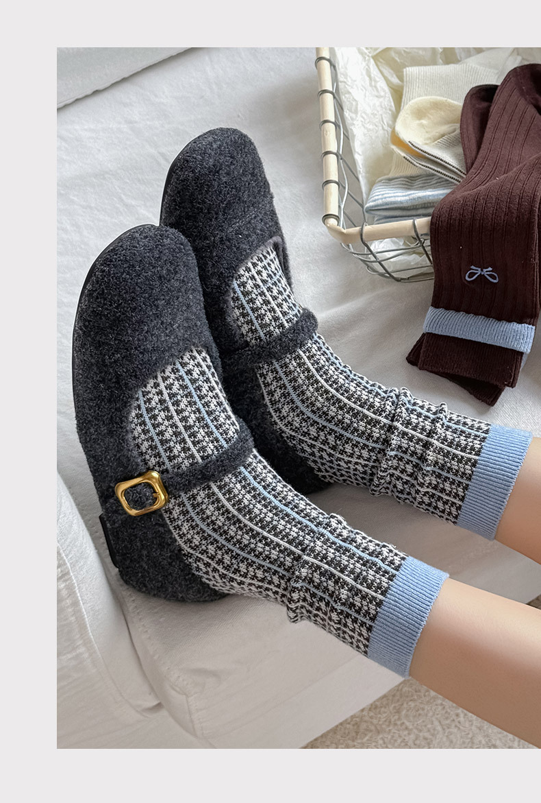 秋冬新款韩系刺绣中筒袜双针双路学院风蝴蝶结条纹蓝咖系列堆堆袜