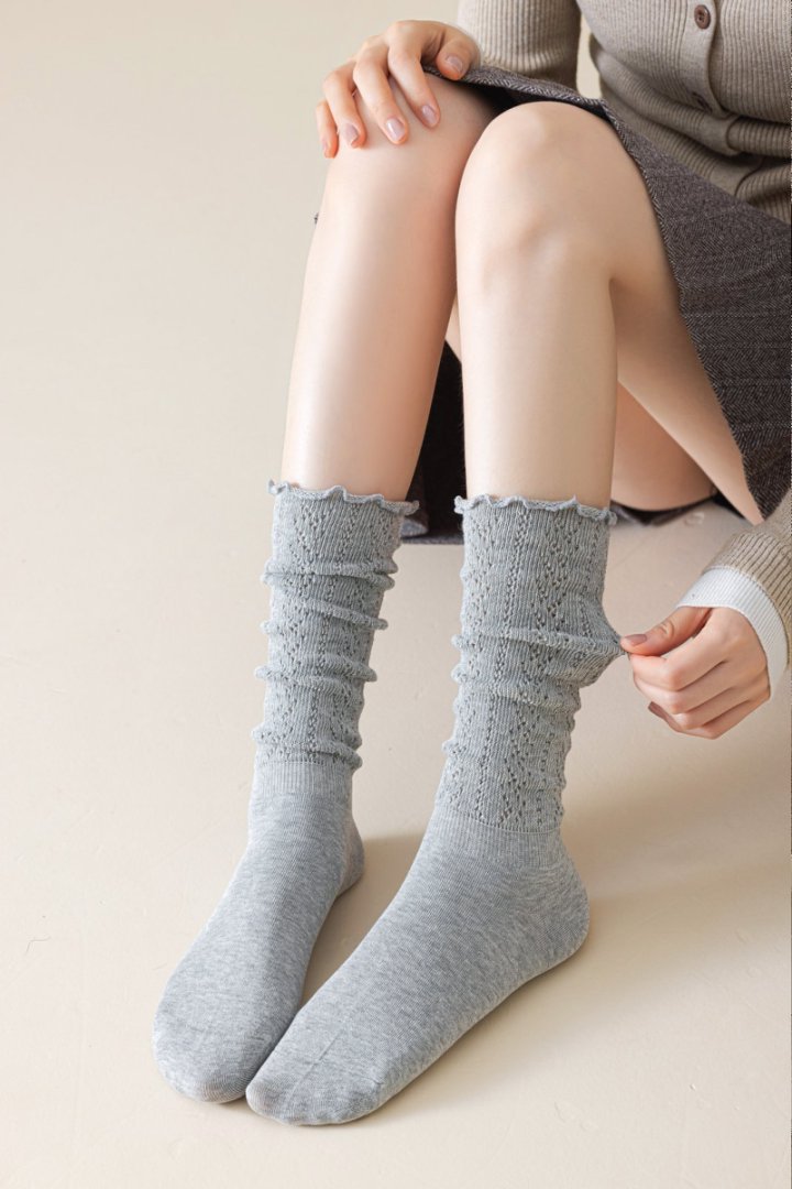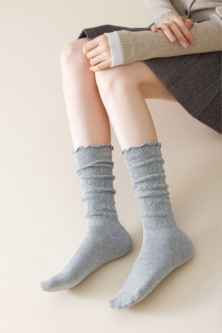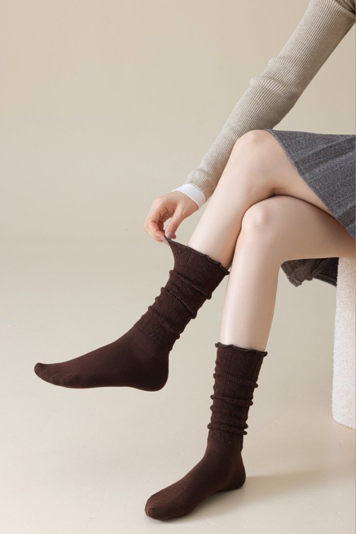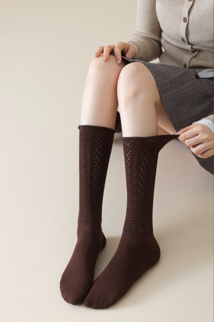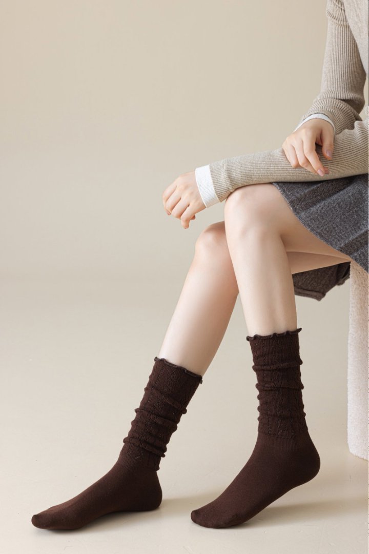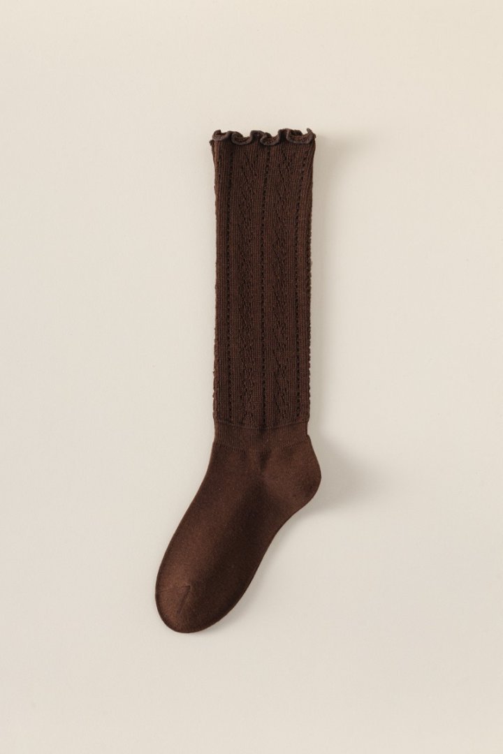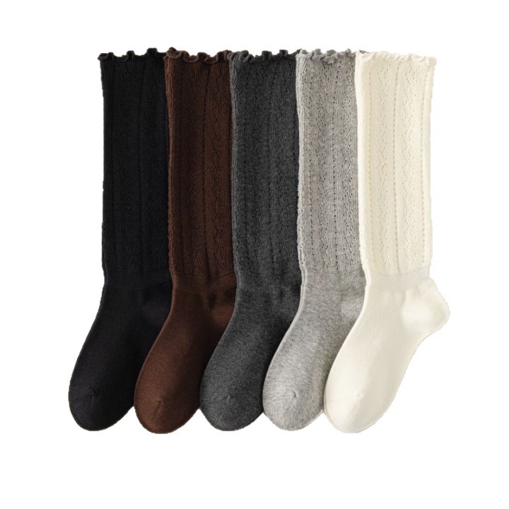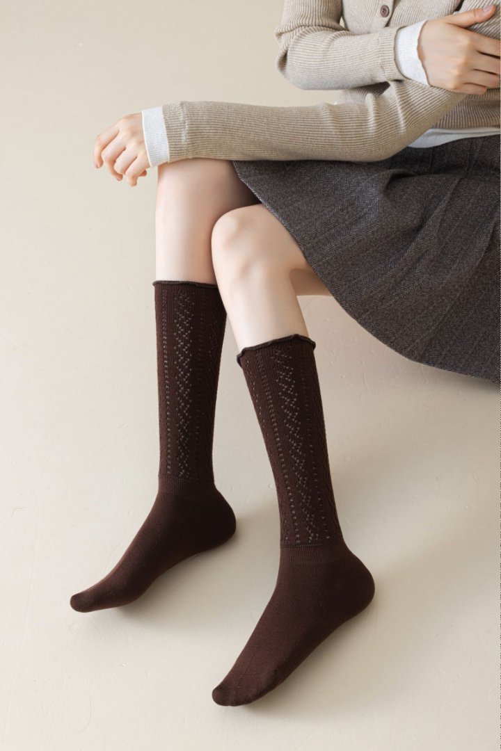 堆堆袜子女秋冬木耳边镂空长筒袜镂空小腿袜配阿甘鞋日系咖色长袜