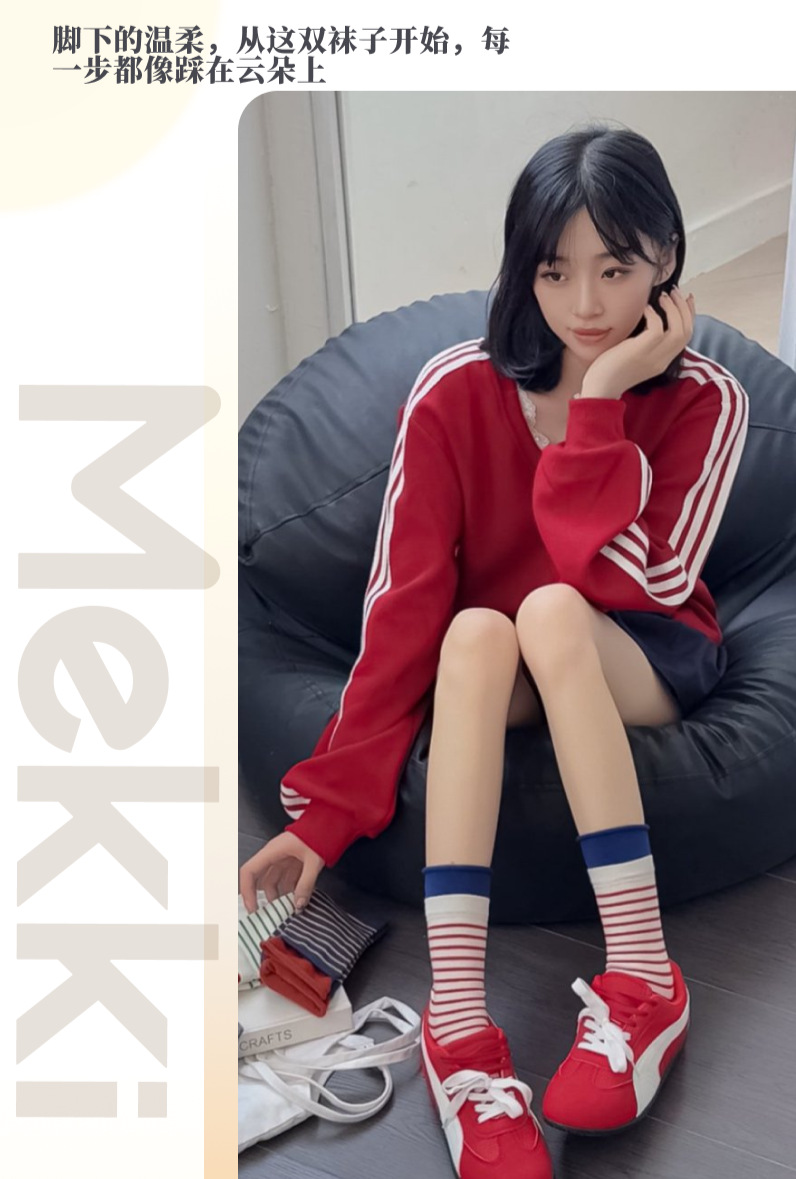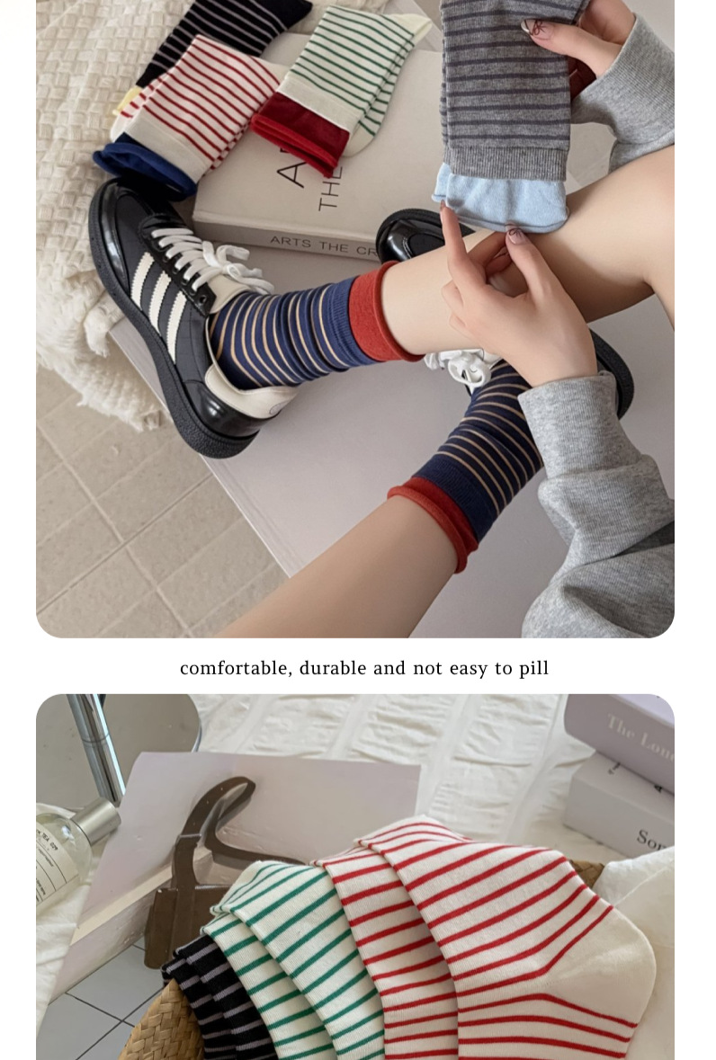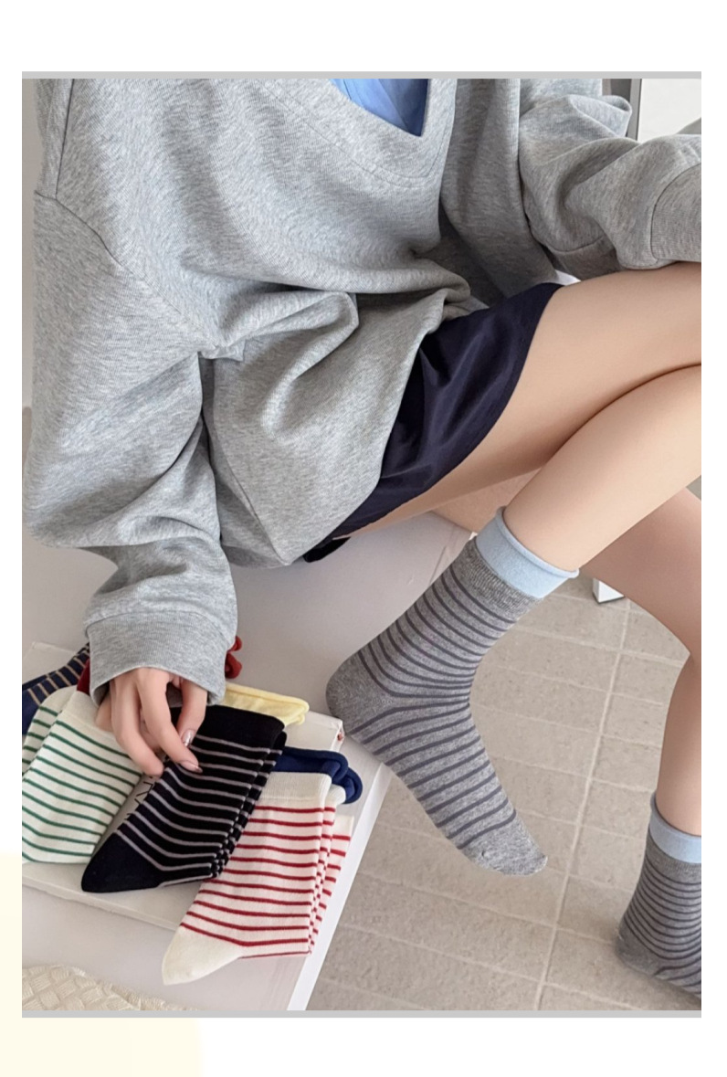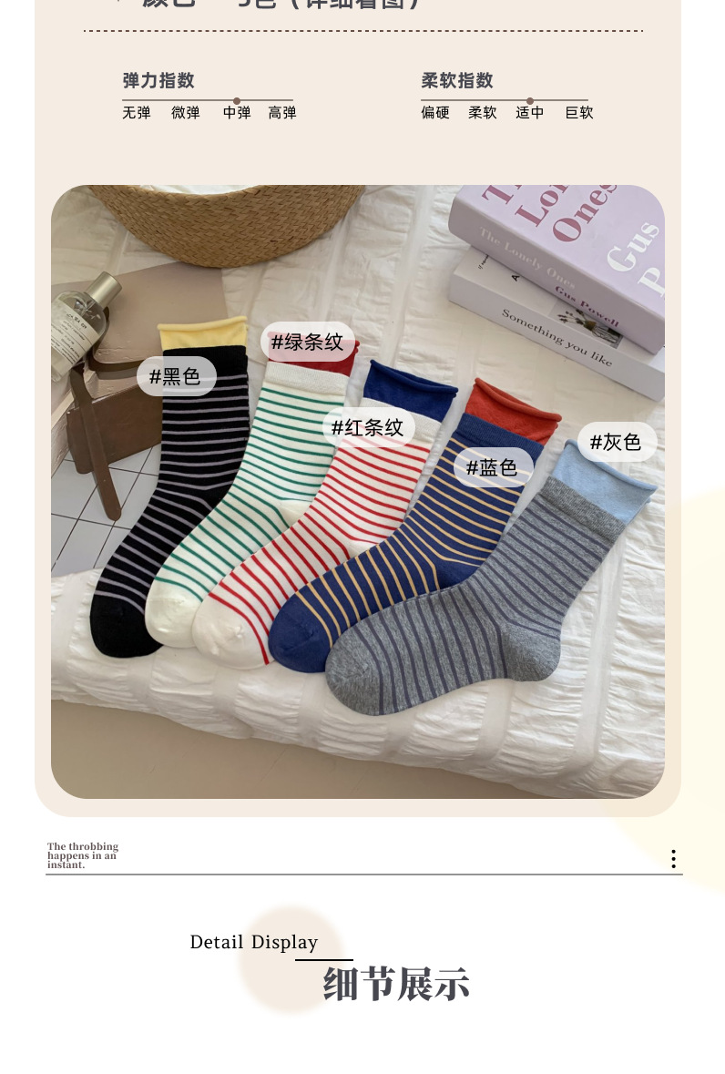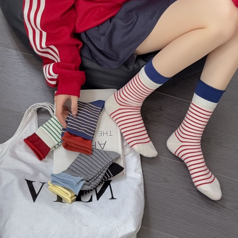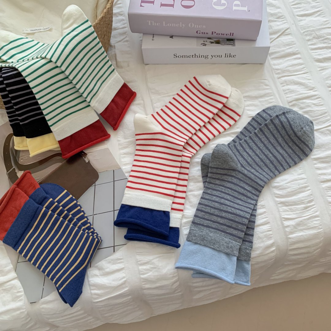 Mekki秋季新款潮流袜双罗口条纹撞色女袜透气精梳棉中筒诸暨袜子