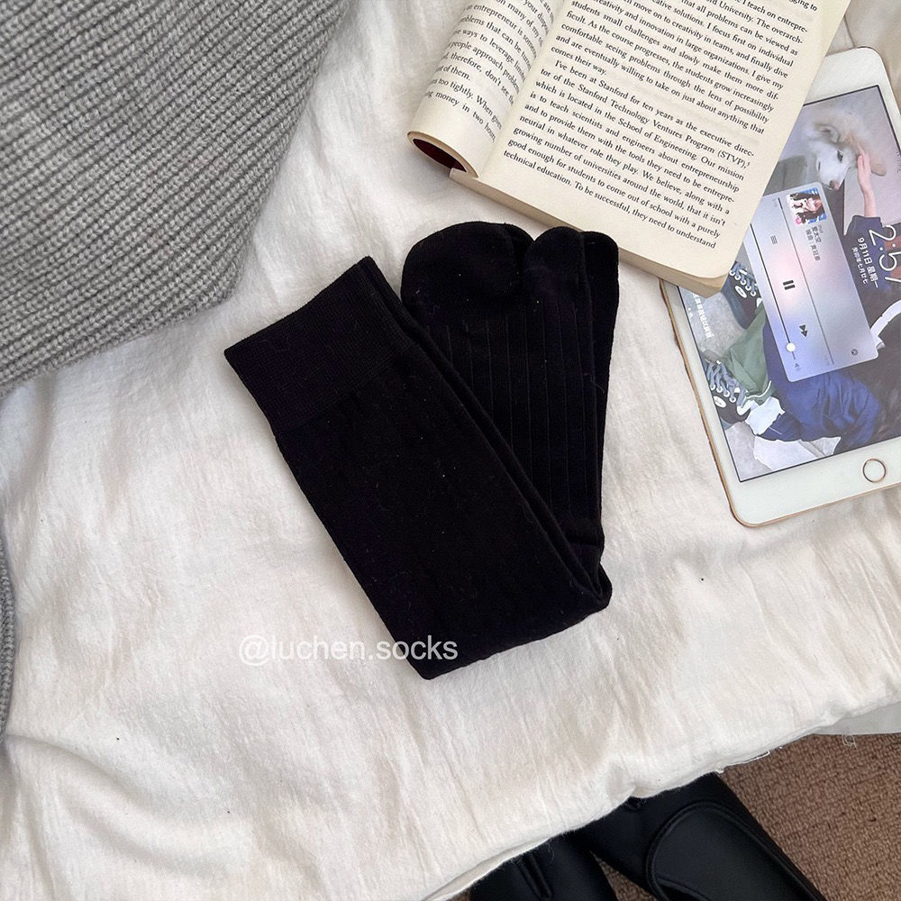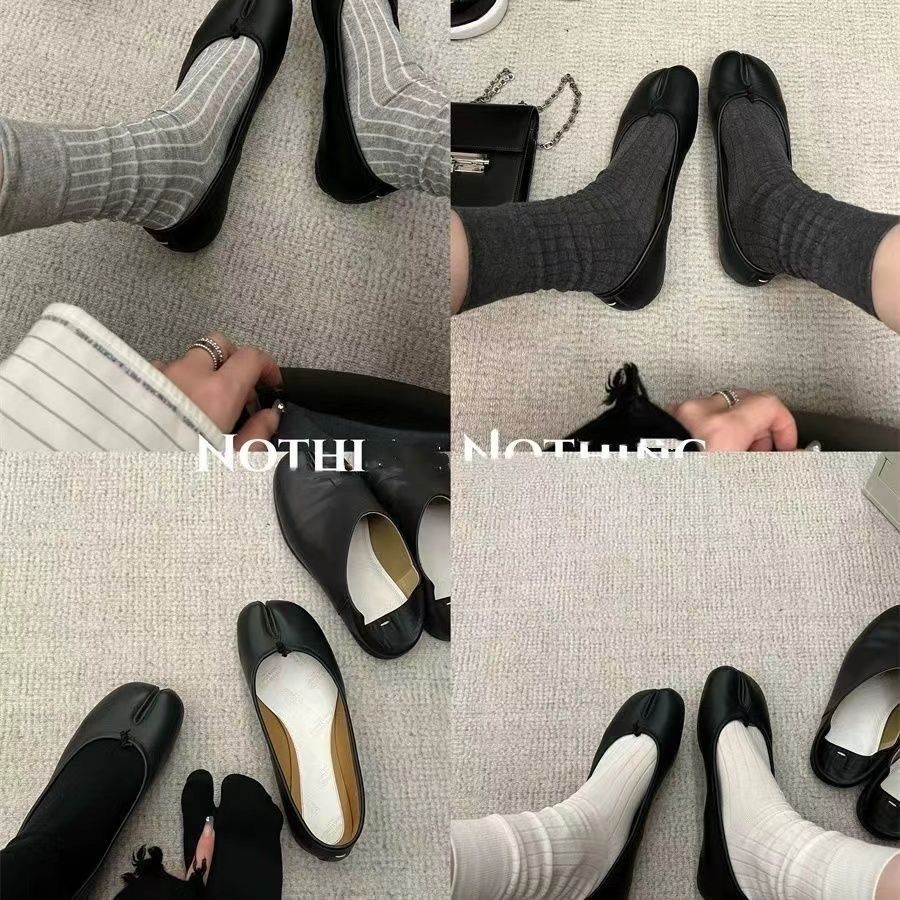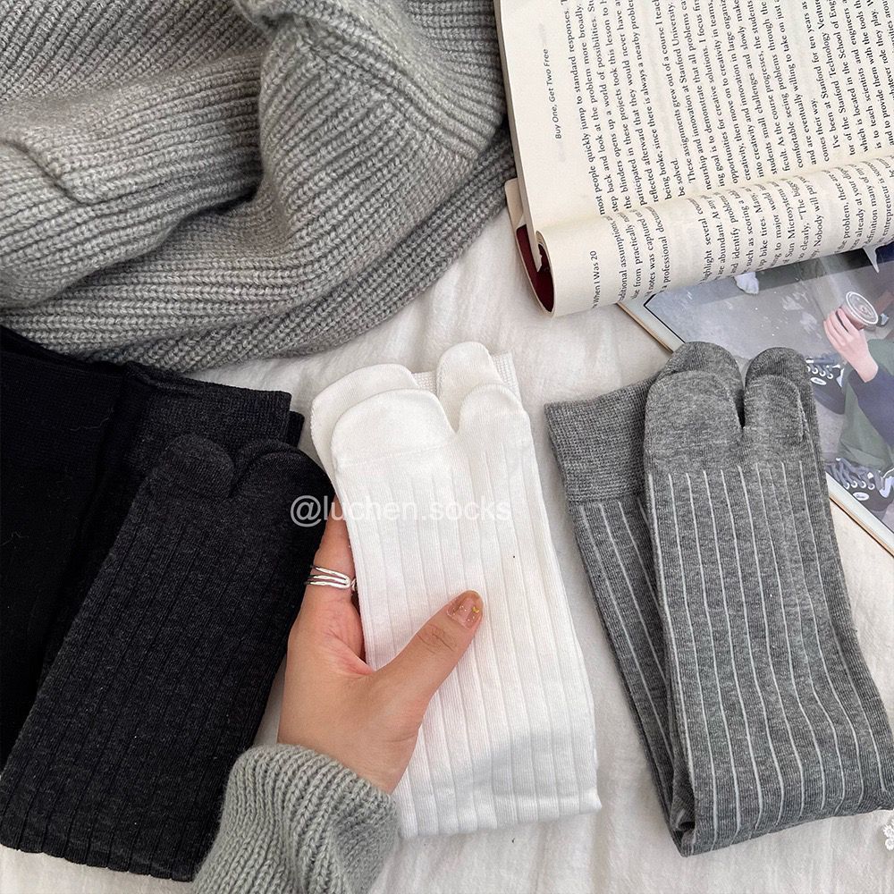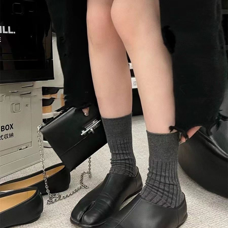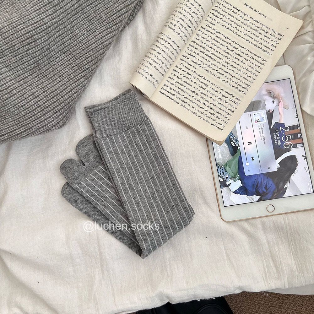 Tabi猪蹄分趾鞋女搭配“宽竖条纹无骨分趾袜女秋冬灰袜子女中筒袜