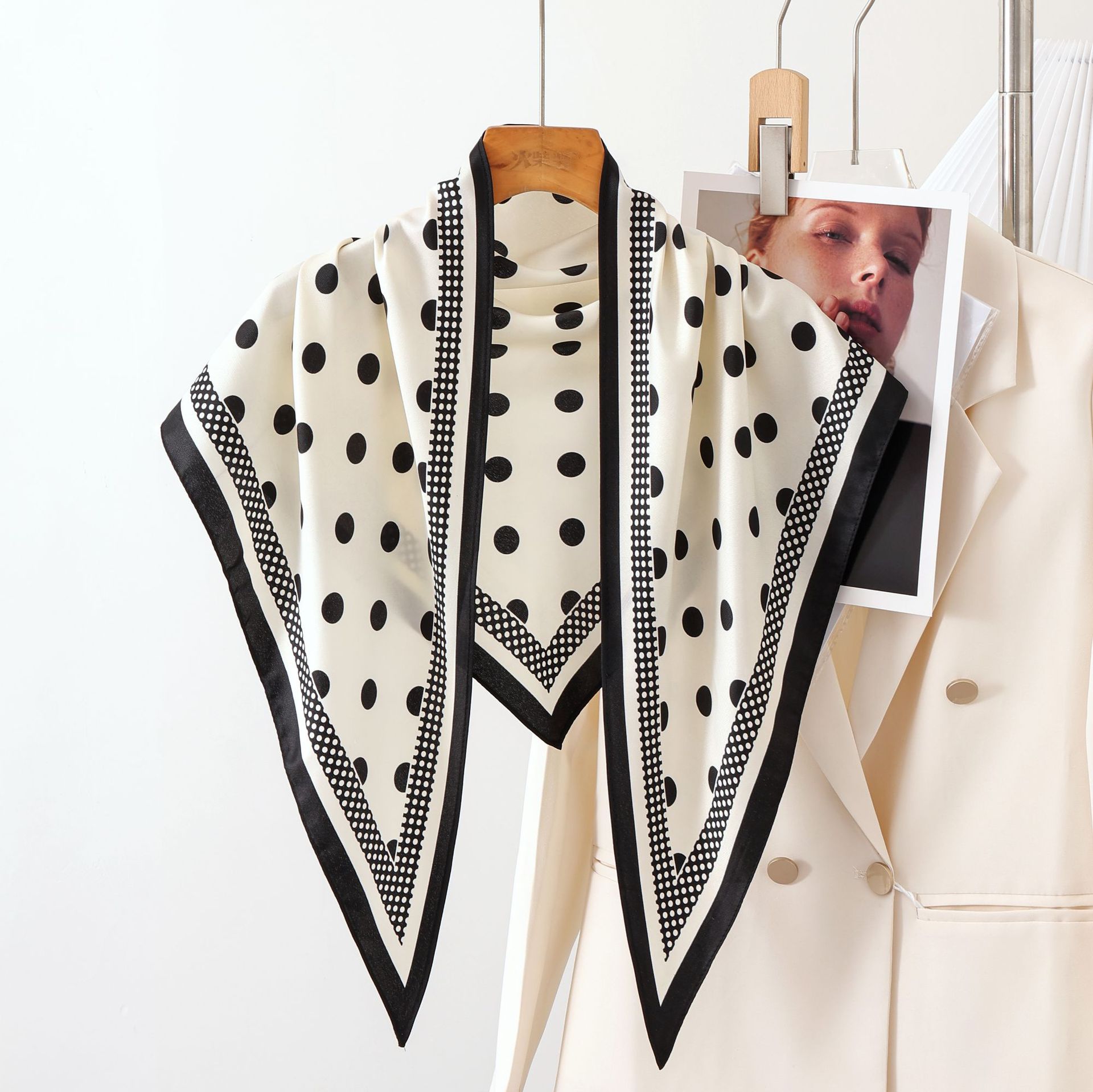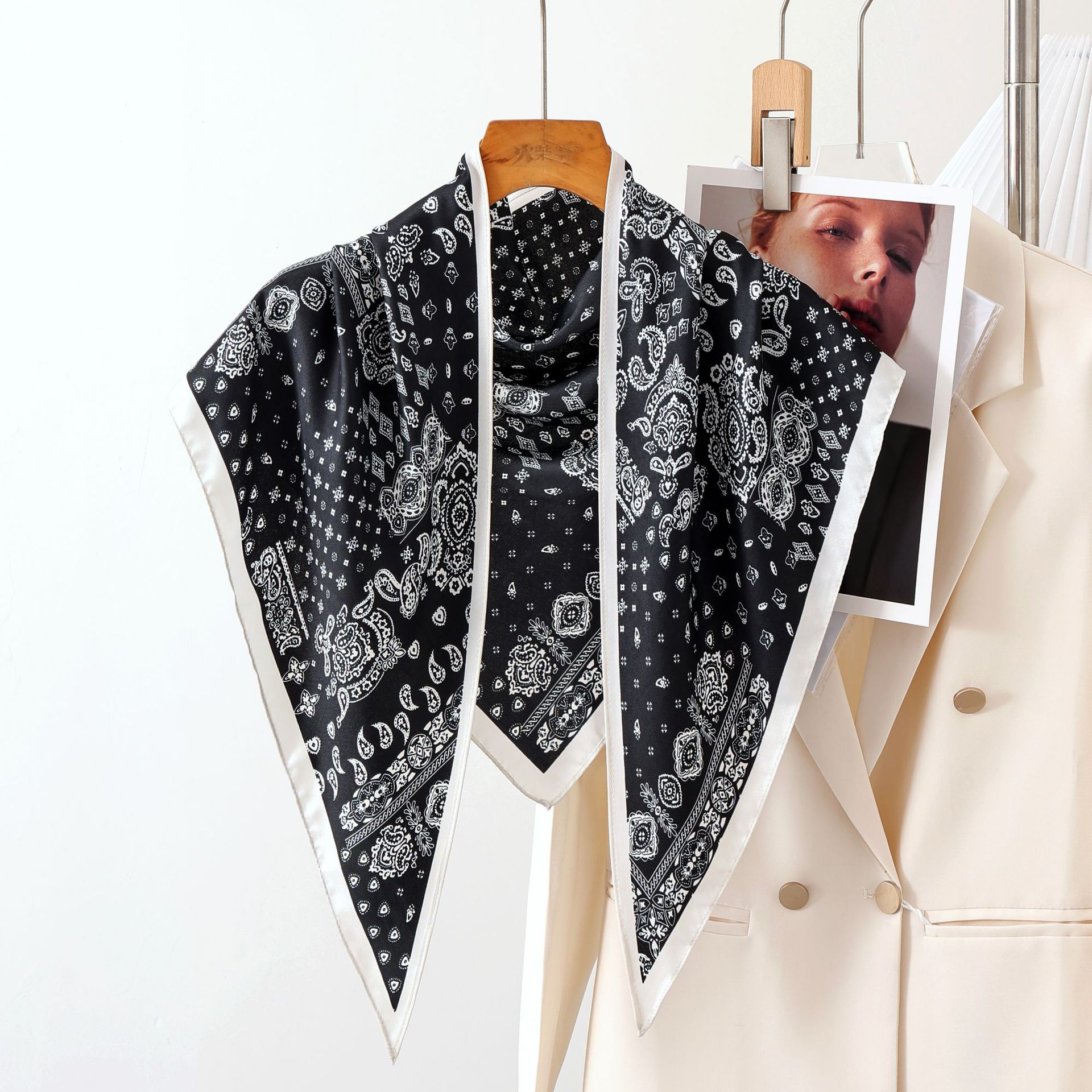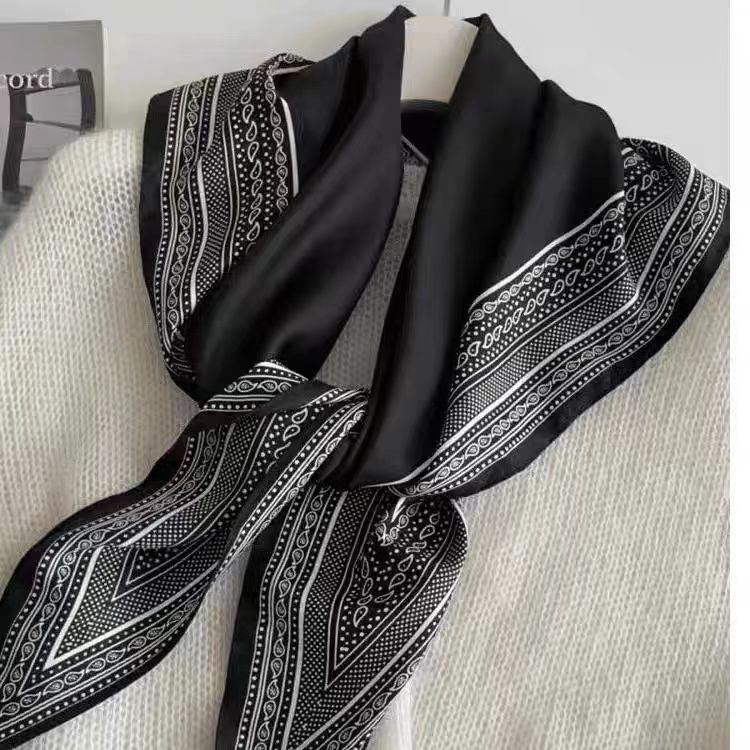 新款韩国原单复古简约黑白高级气质斜纹三角方巾披肩极简轻奢领巾