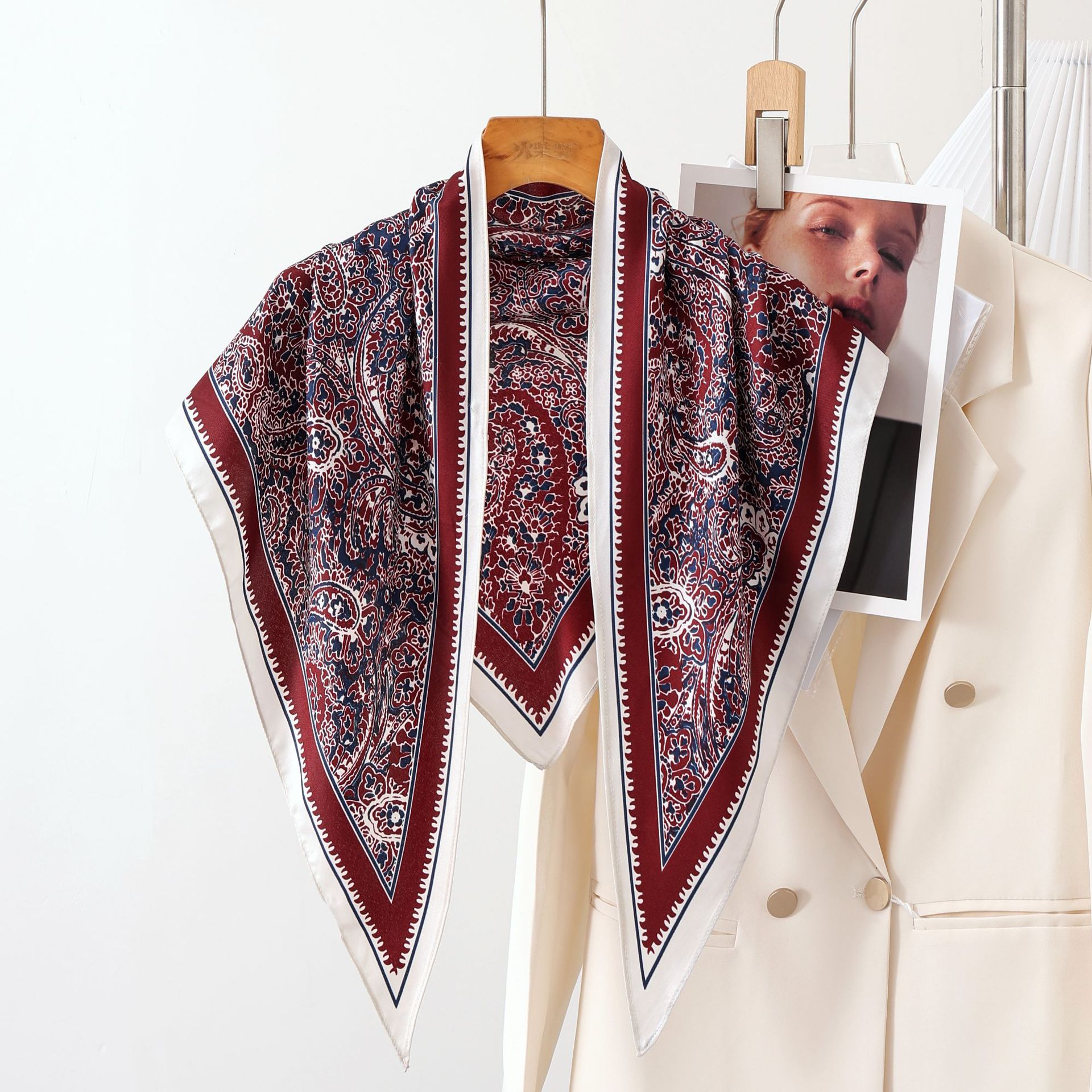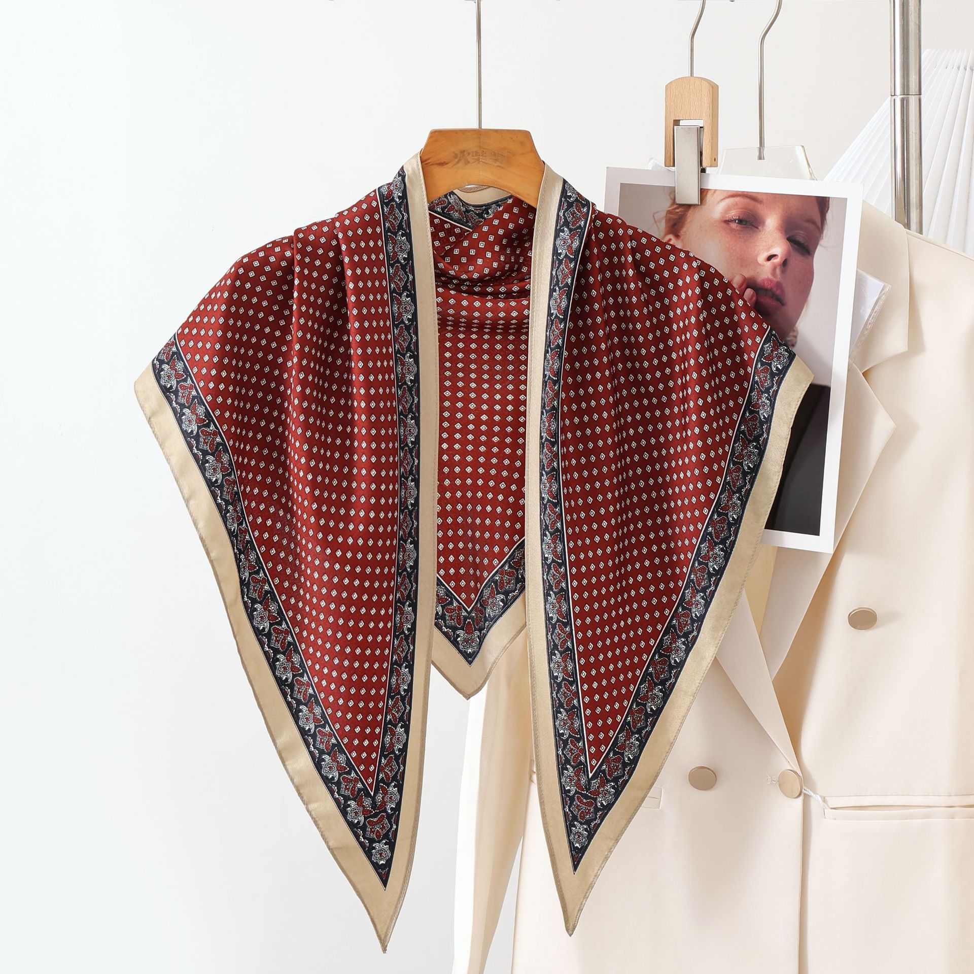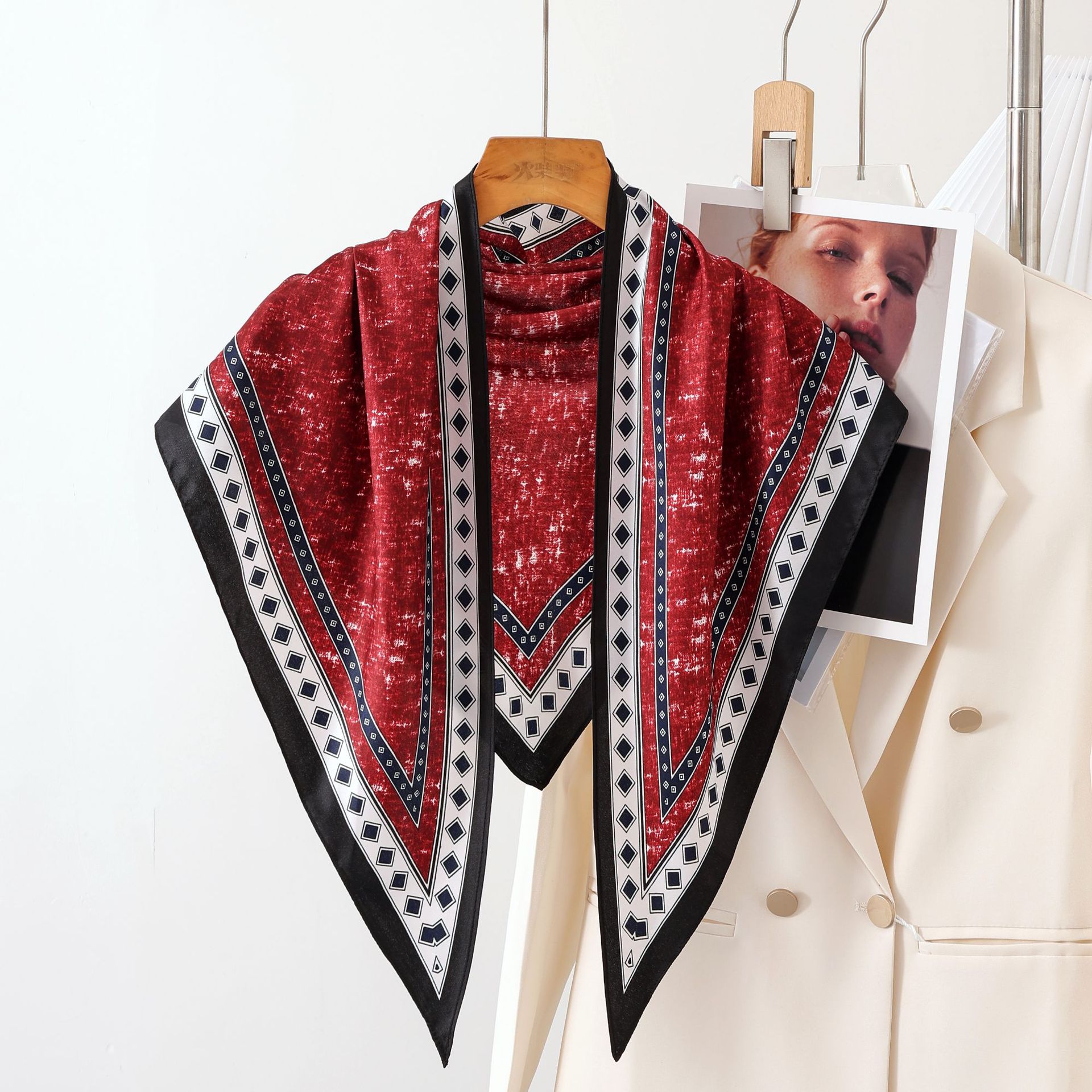 新款韩国原单复古简约黑白高级气质斜纹三角方巾披肩极简轻奢领巾