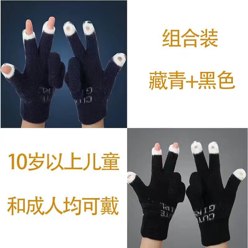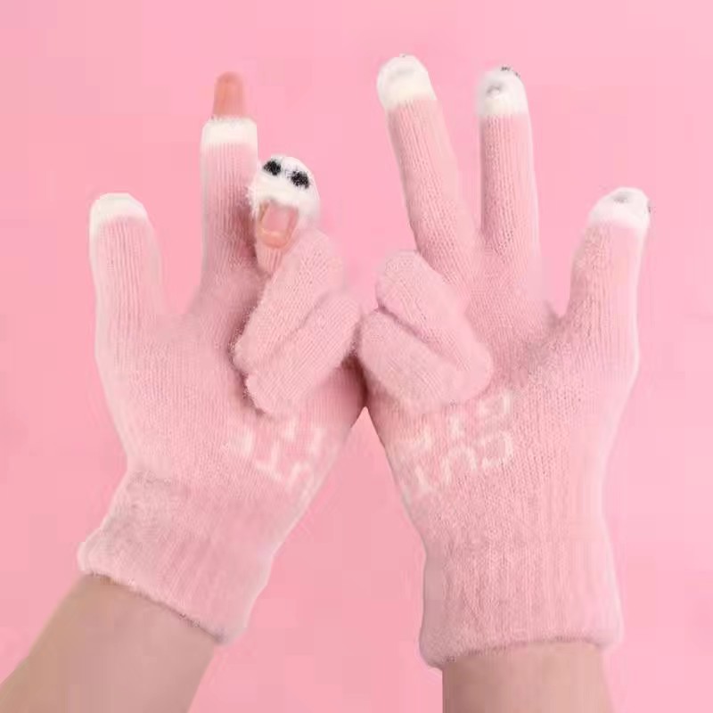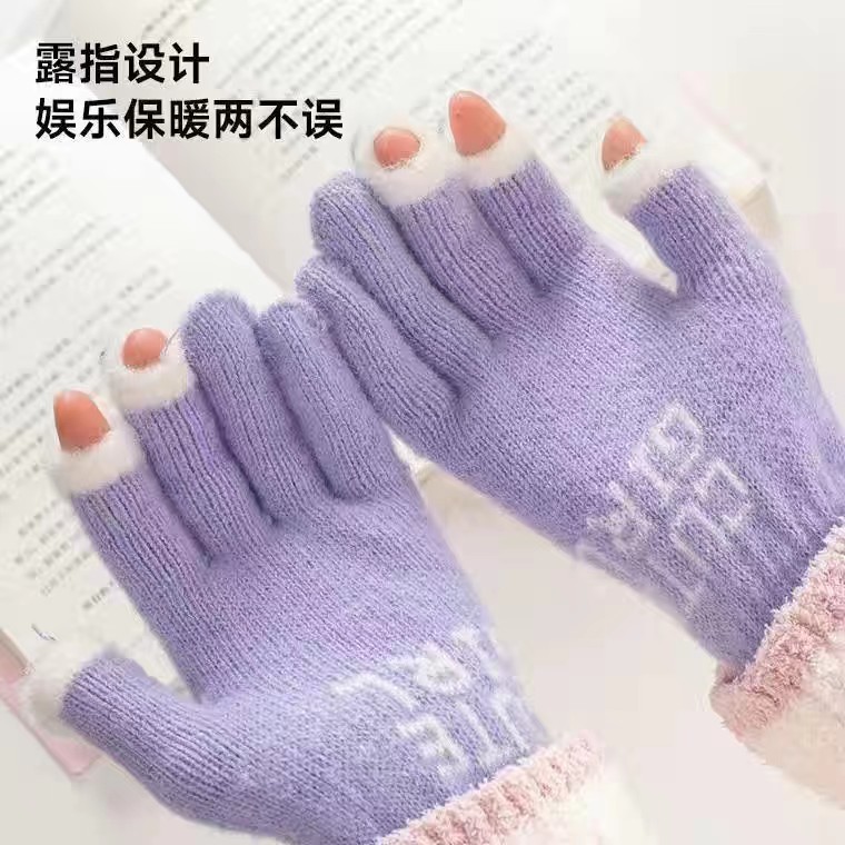 冬季保暖针织手套批发豆豆鱼可爱卡通手套女学生漏指触屏毛线手套