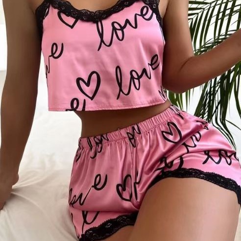欧美外贸女士可爱印花睡衣春夏季家居服时尚蕾丝拼接吊带套装批发