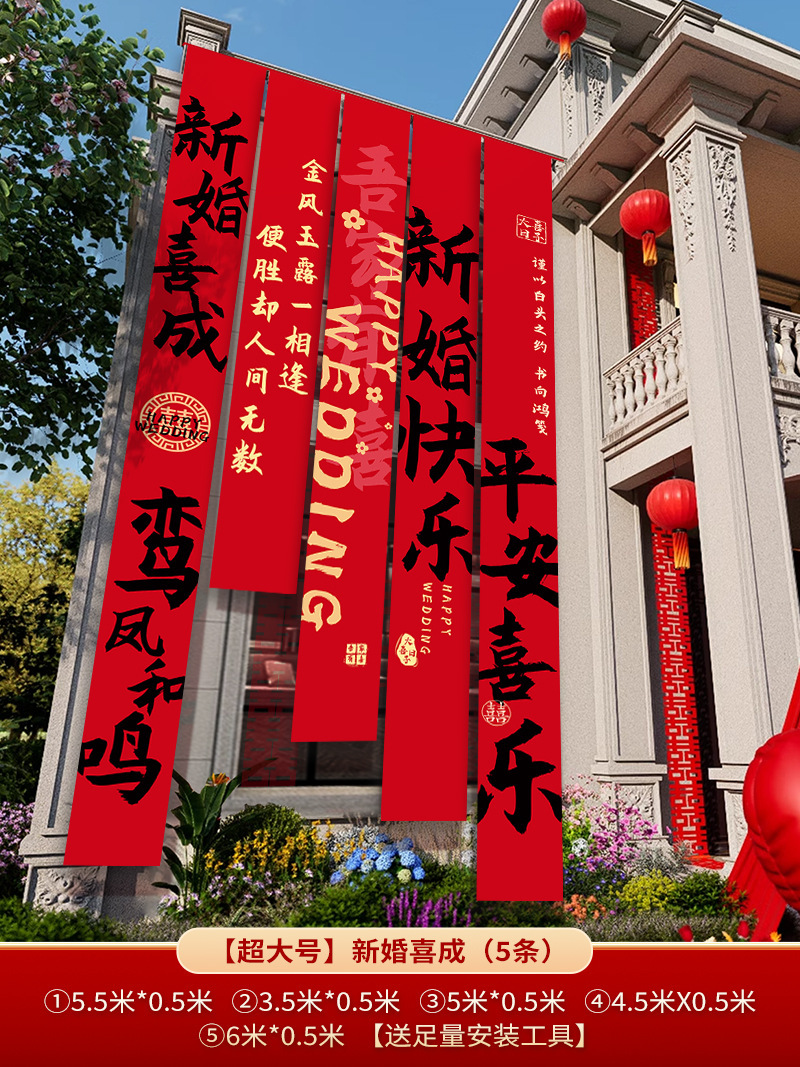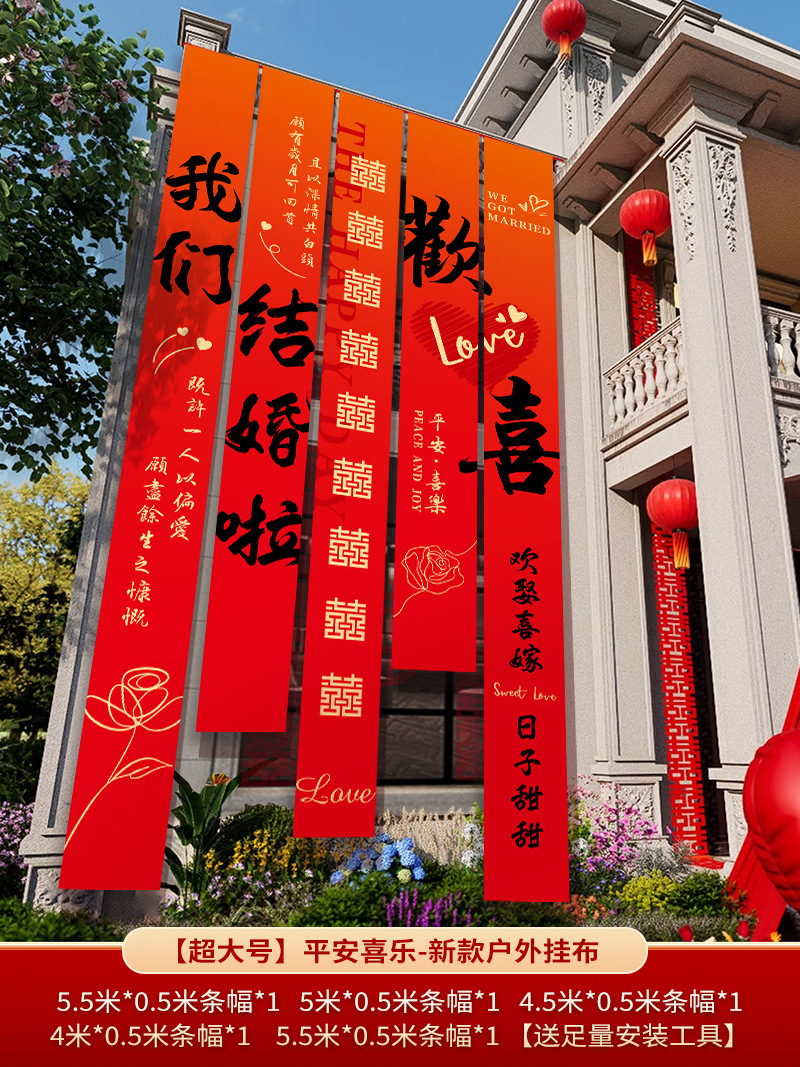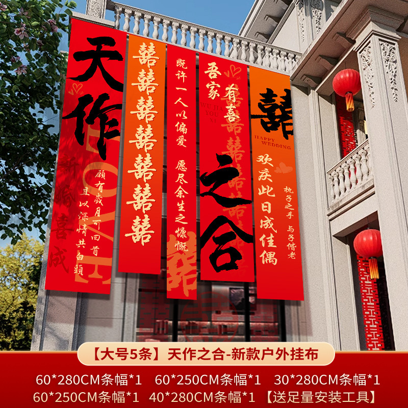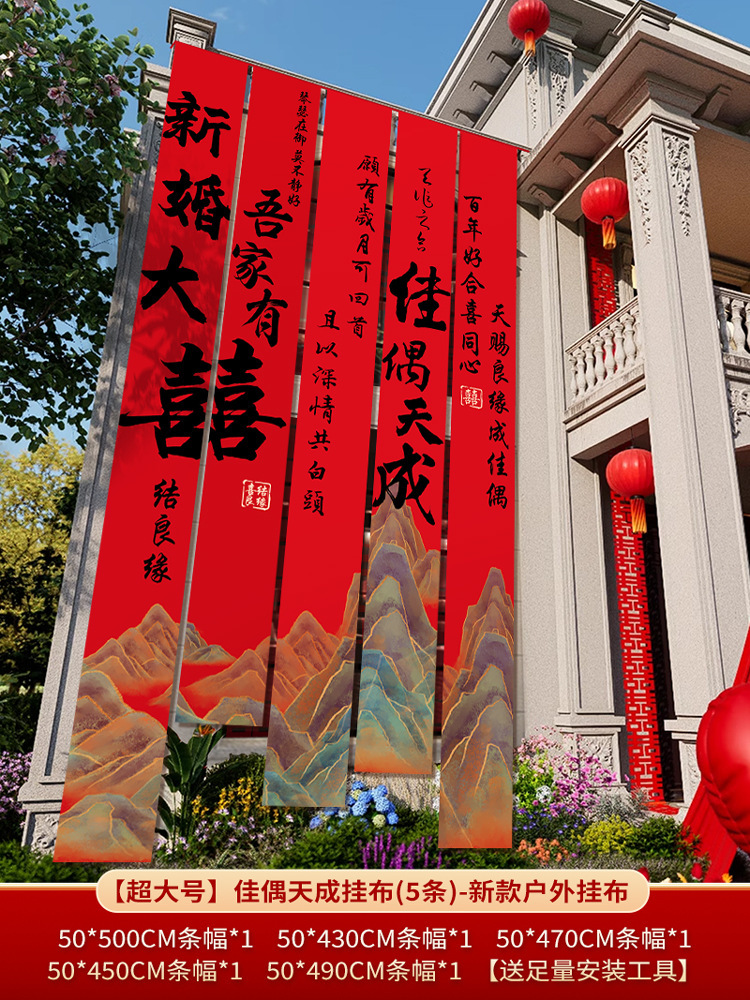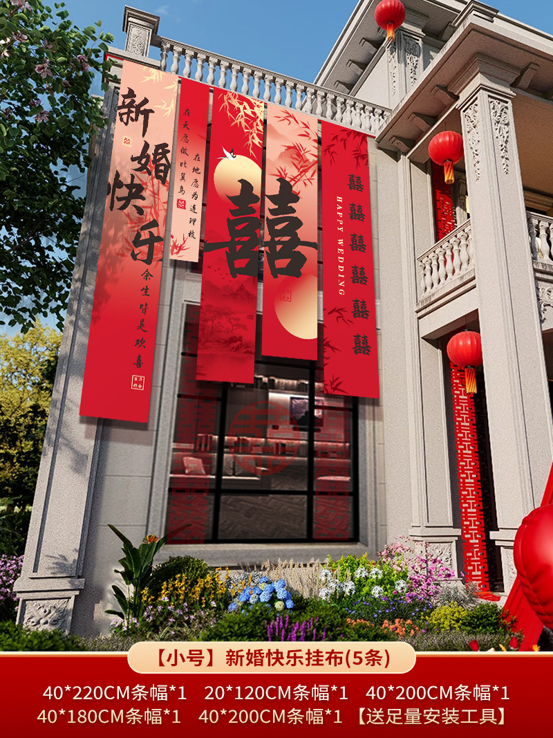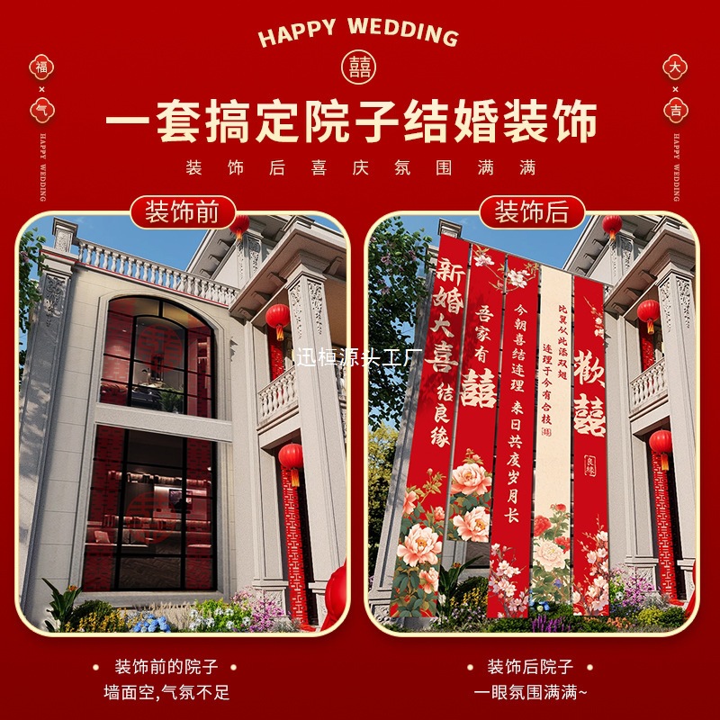 农村结婚院子装饰条幅挂布婚礼自建房室外庭院场景布置喜字横幅