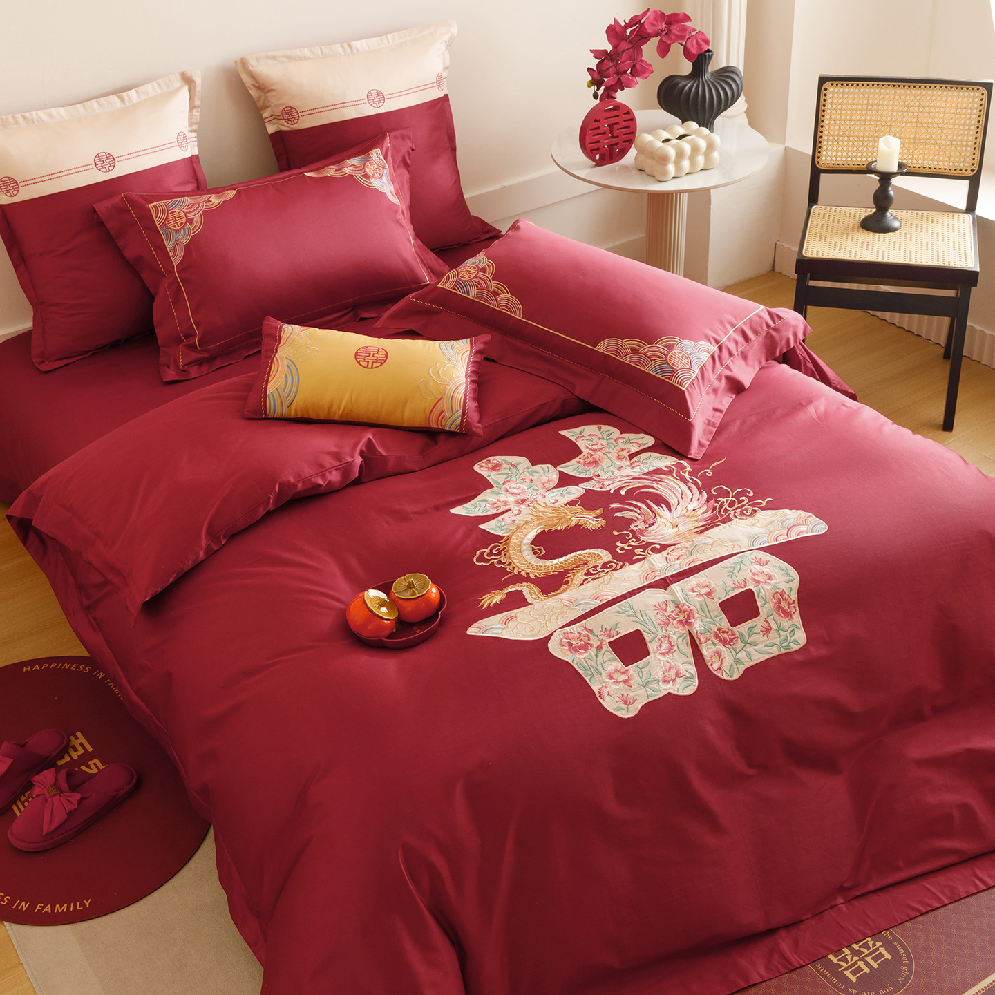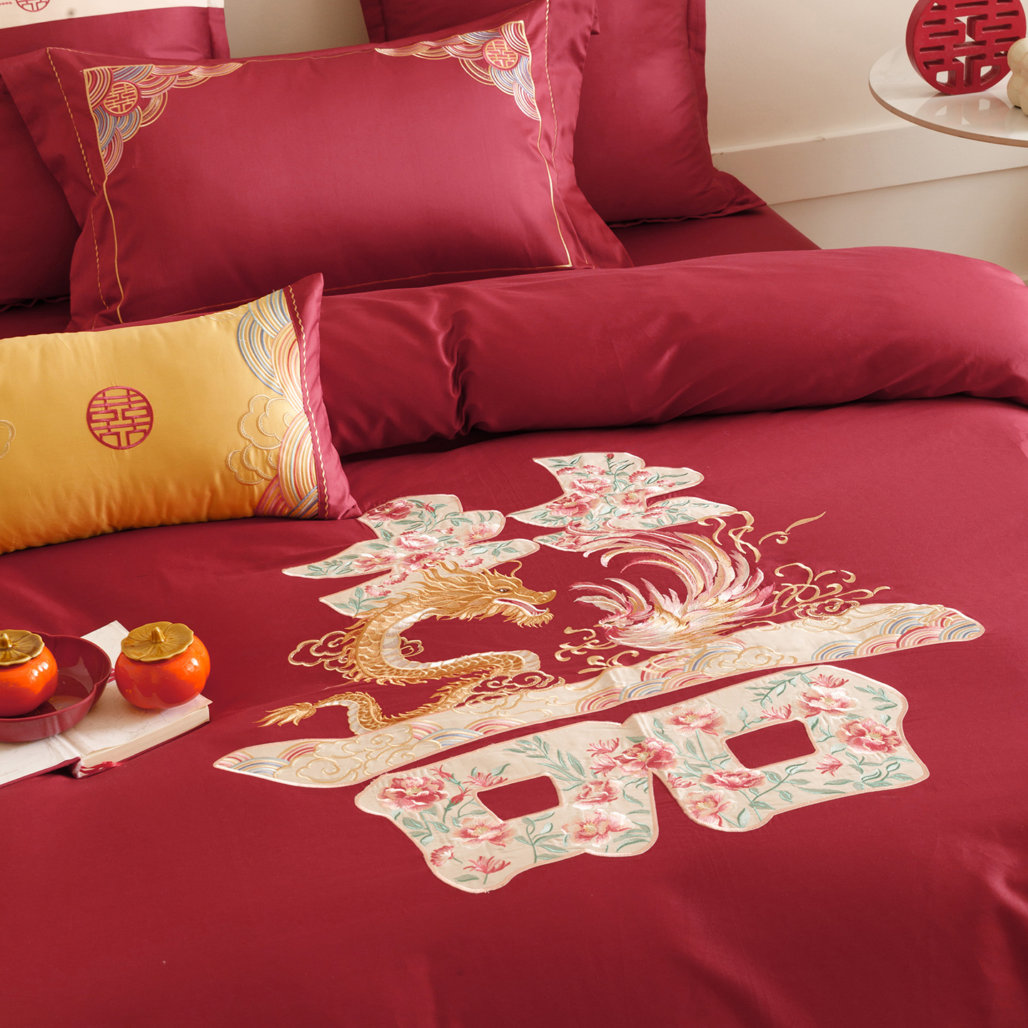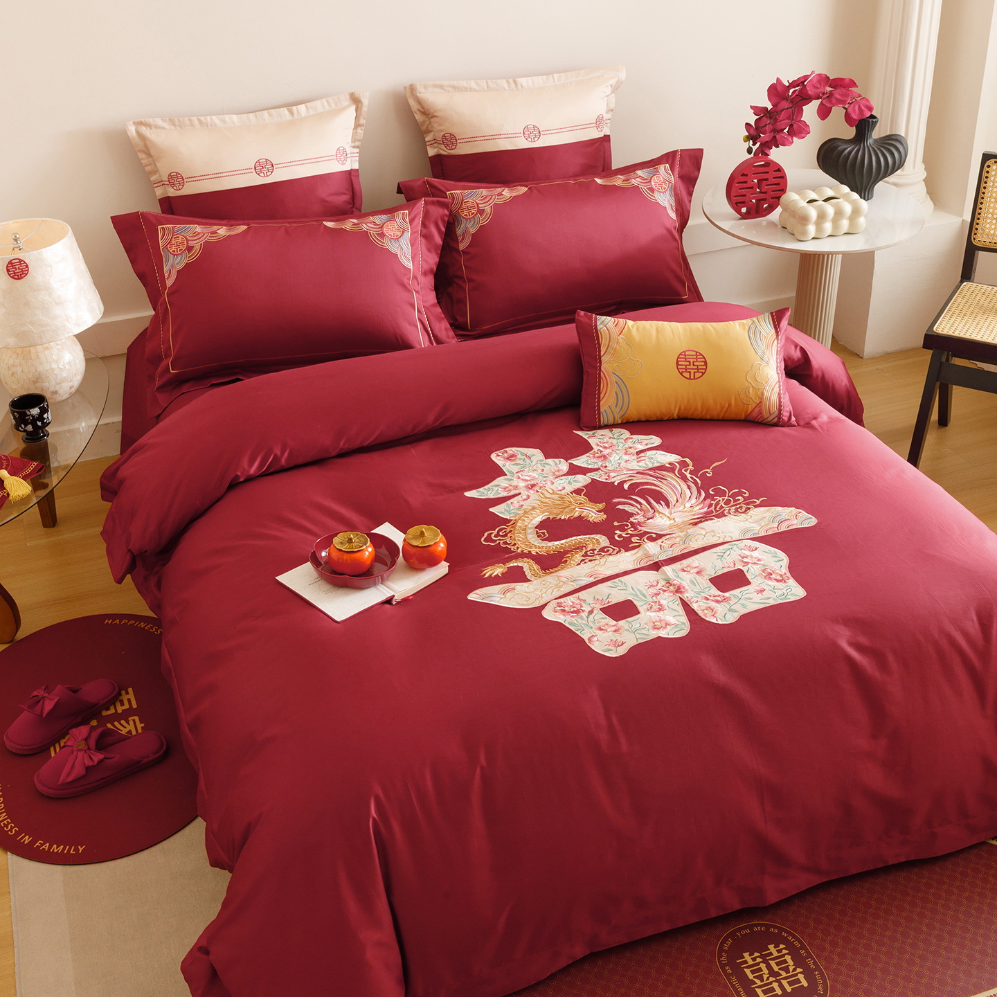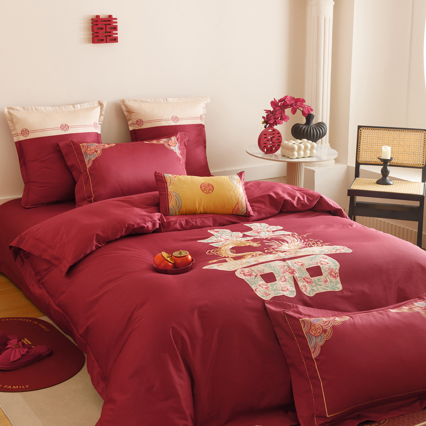 轻奢高级感全棉婚庆绣花红色喜庆结婚四件套婚房陪嫁喜被床上用品