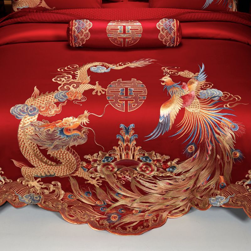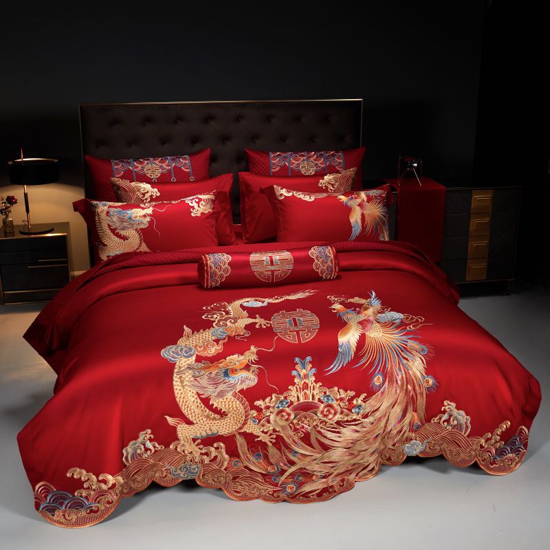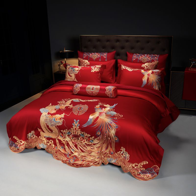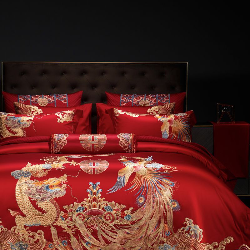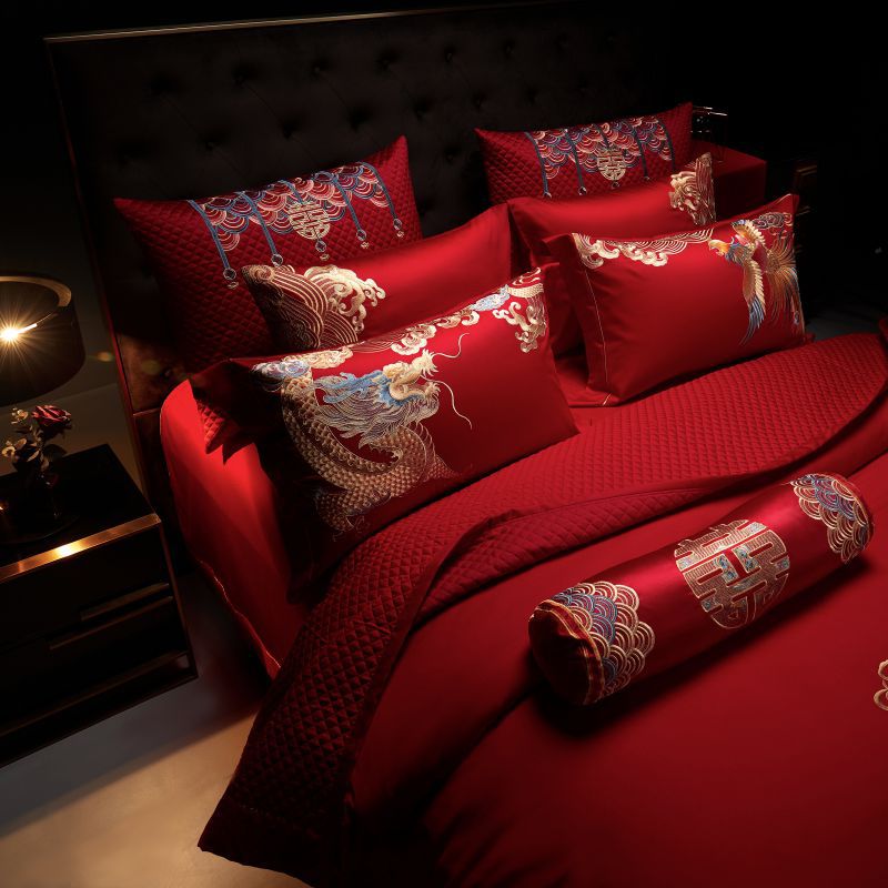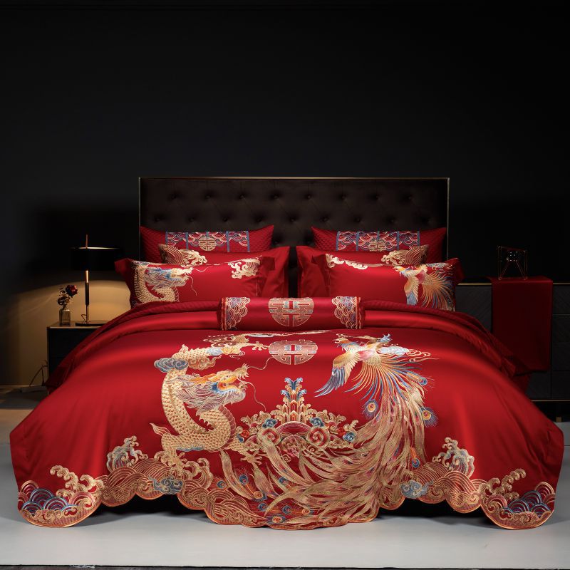 高定婚庆160S长绒棉刺绣红色结婚四件套全棉贡缎喜庆陪嫁喜被床品