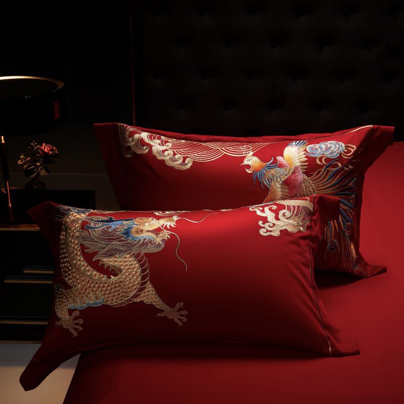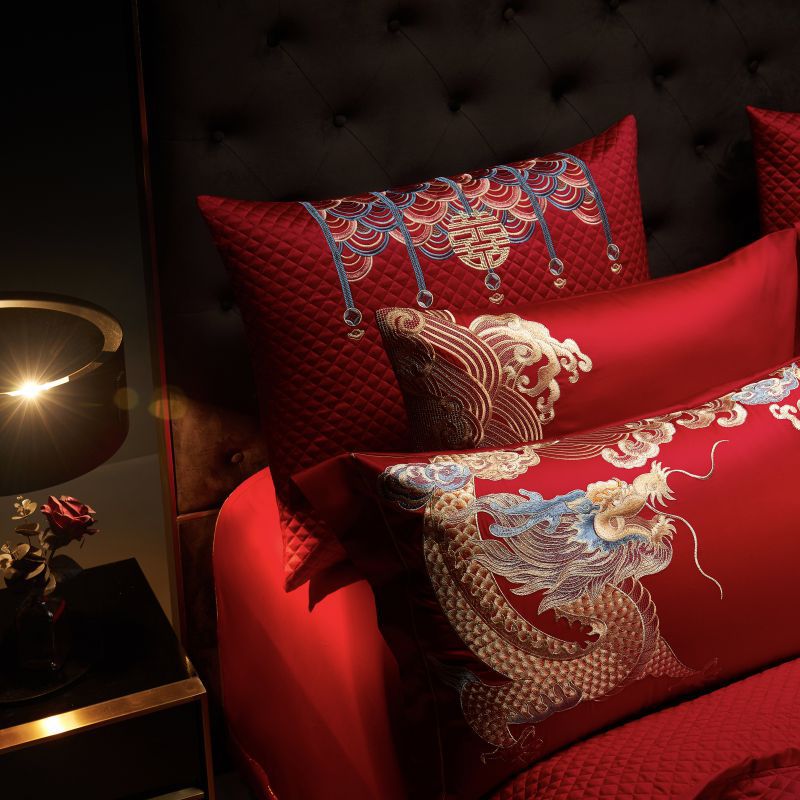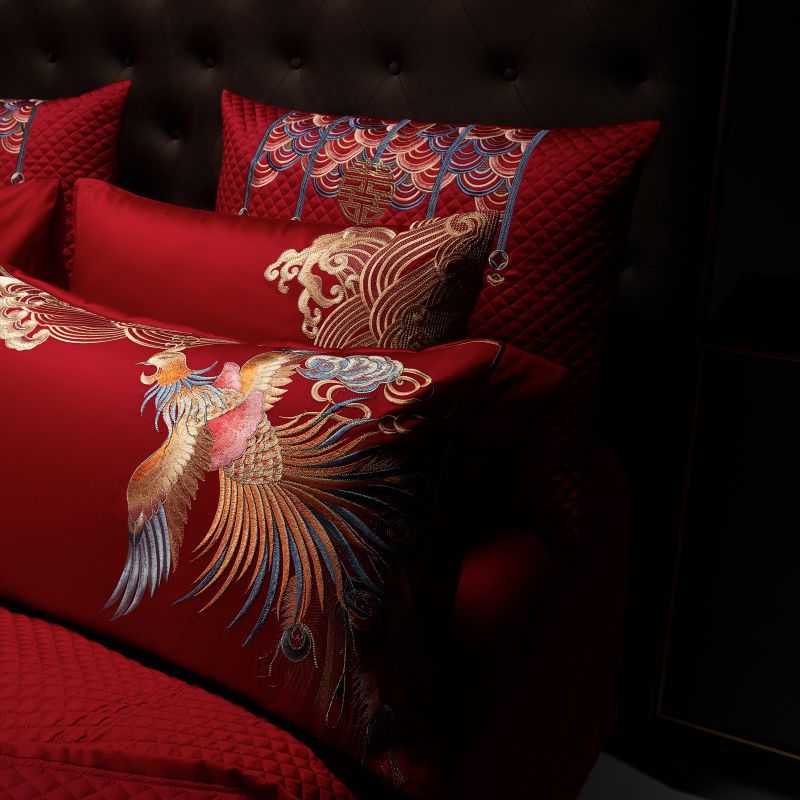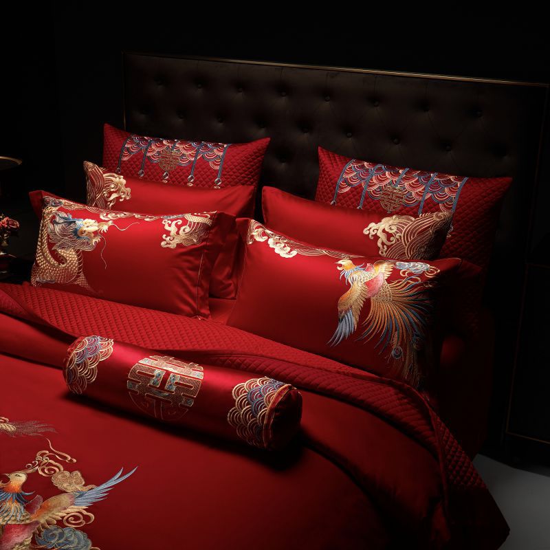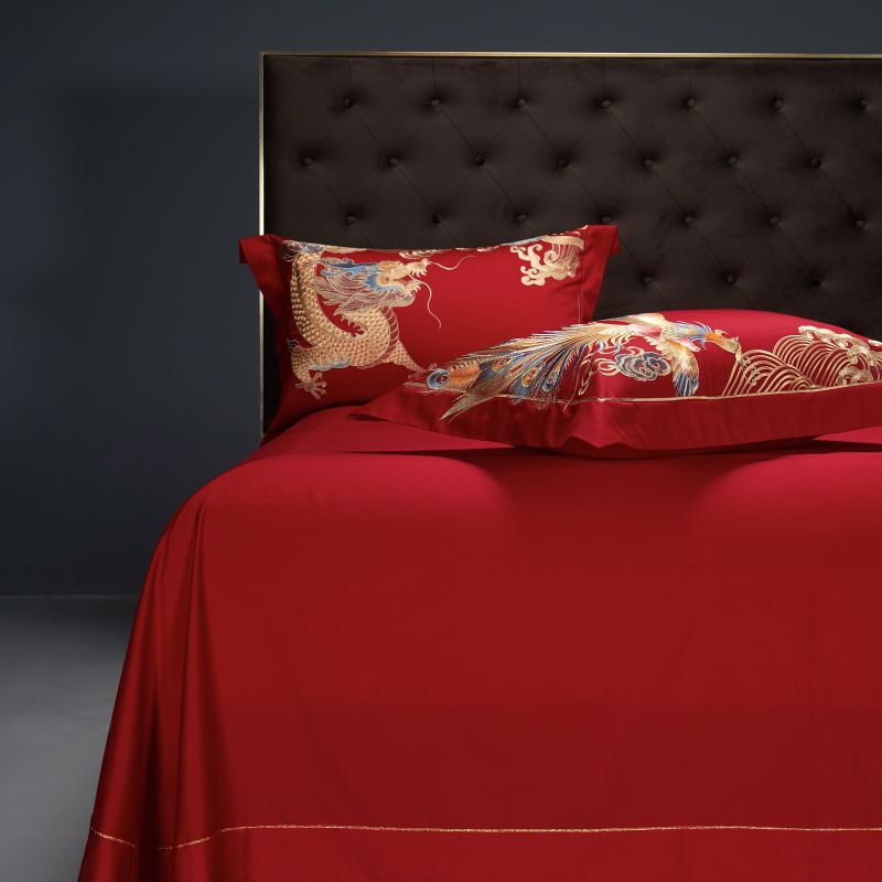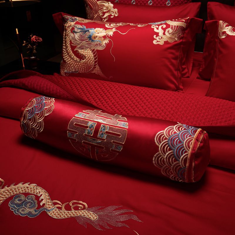 高定婚庆160S长绒棉刺绣红色结婚四件套全棉贡缎喜庆陪嫁喜被床品