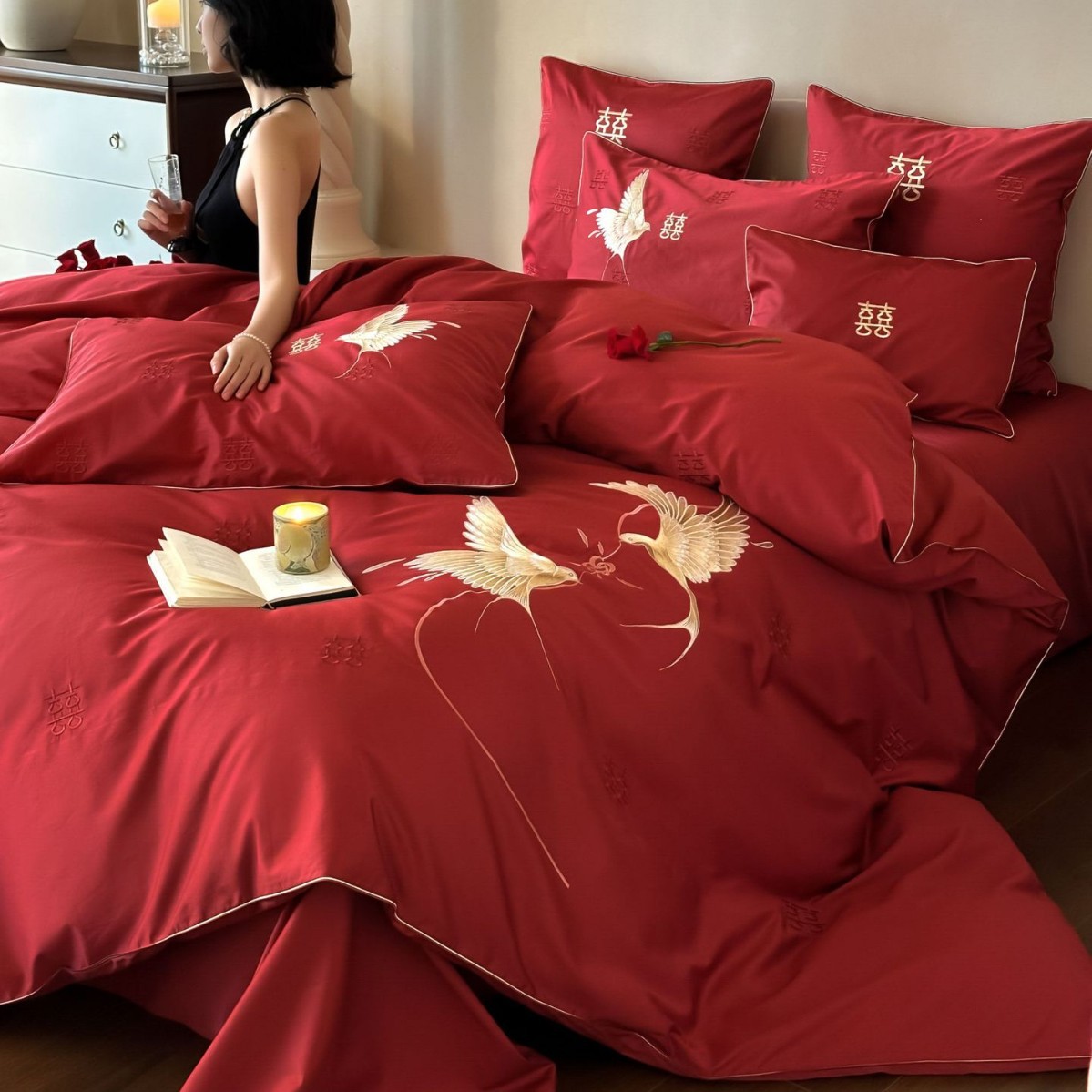 喜上眉梢丨结婚喜庆澳棉纯棉四件套双喜刺绣红色被套床单床上用品