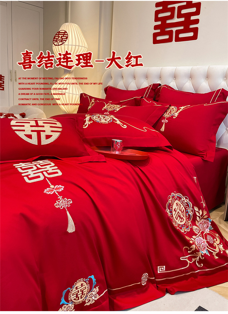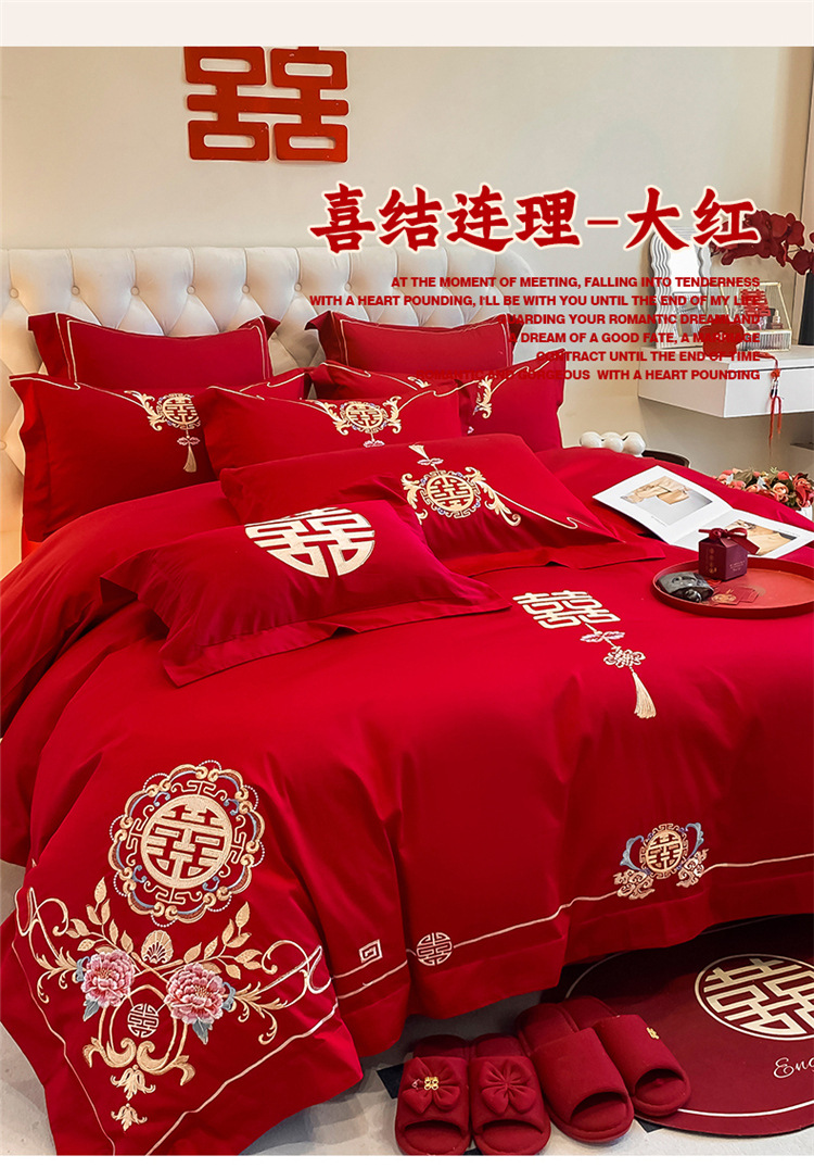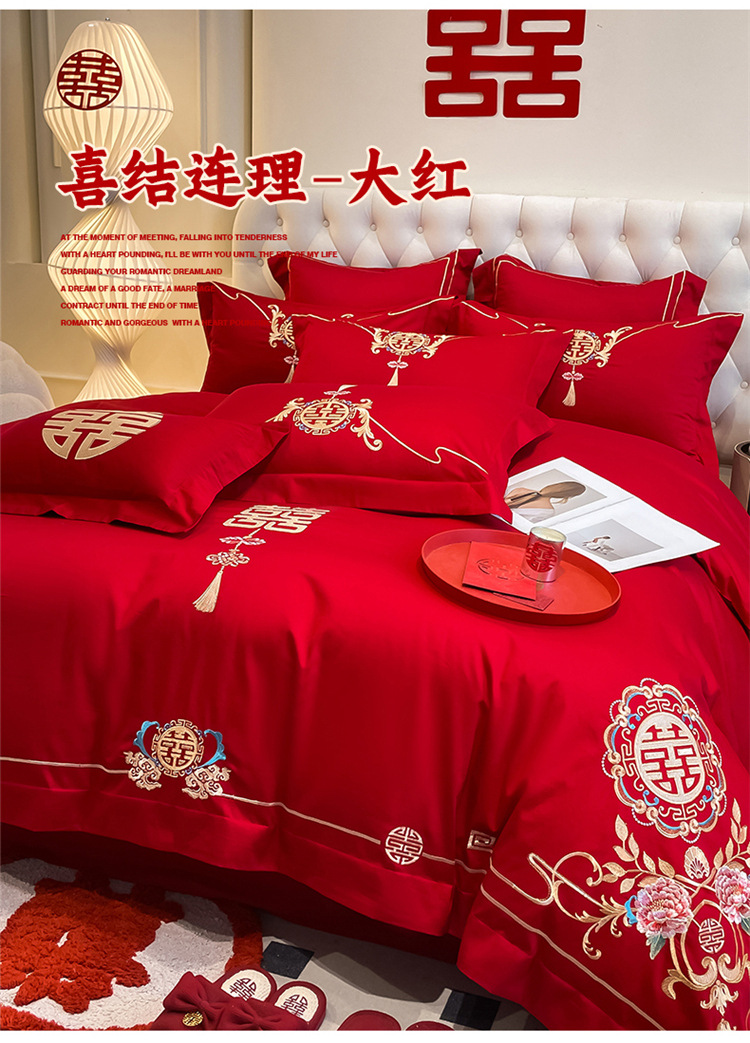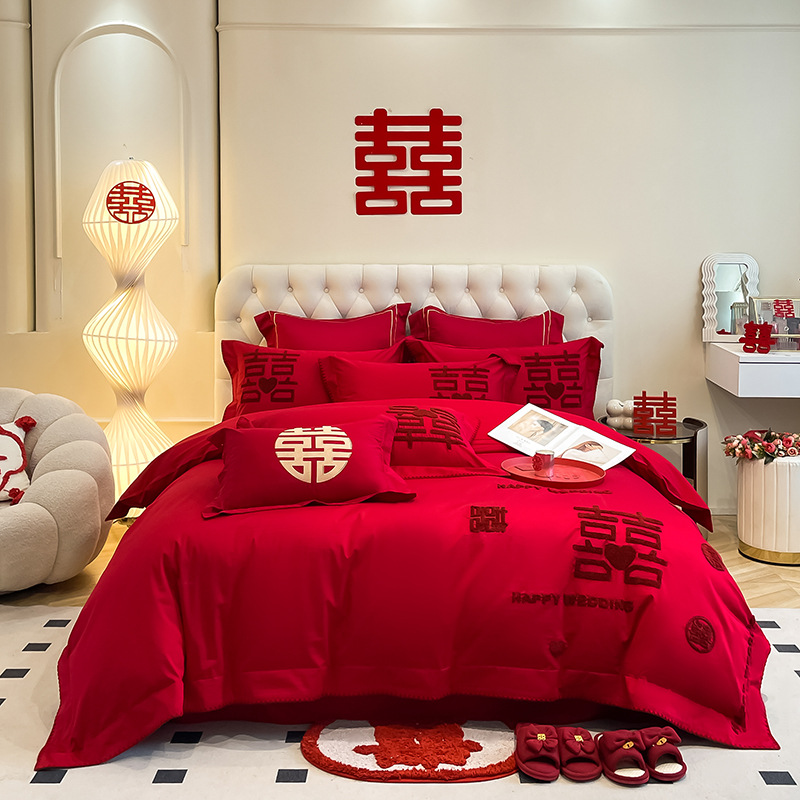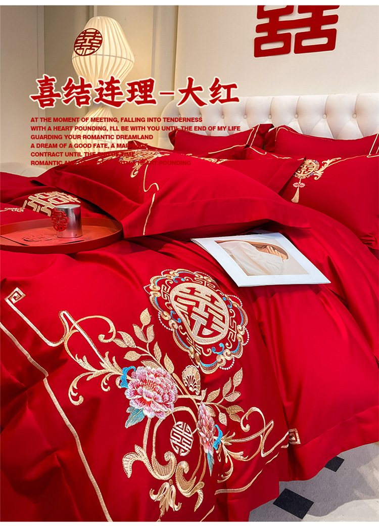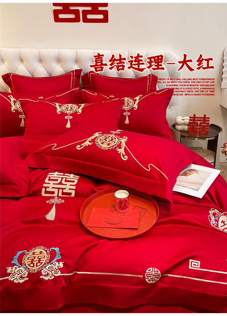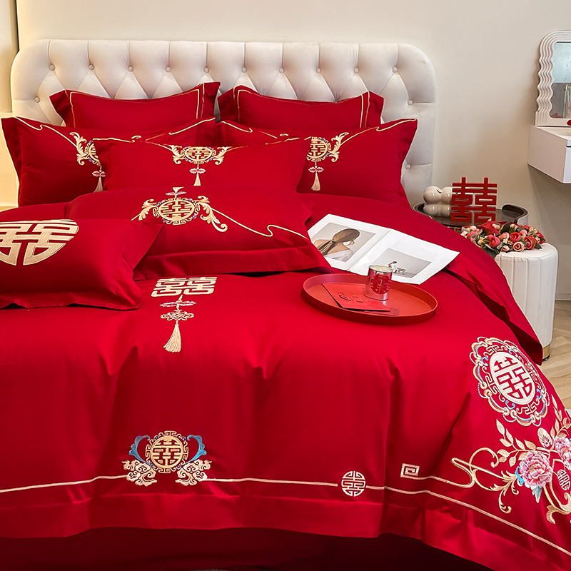 高档中式结婚四件套大红色婚庆纯棉被套婚房喜被新婚陪嫁床上用品