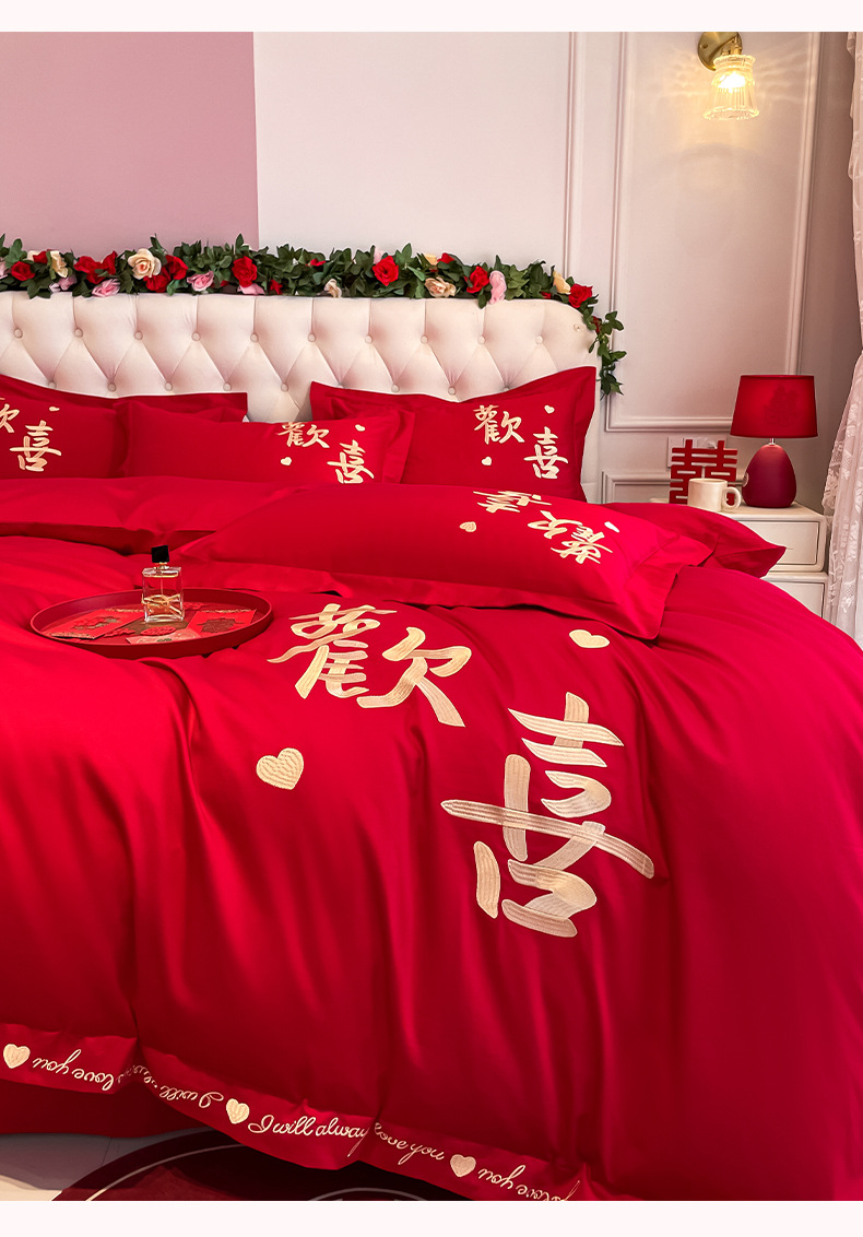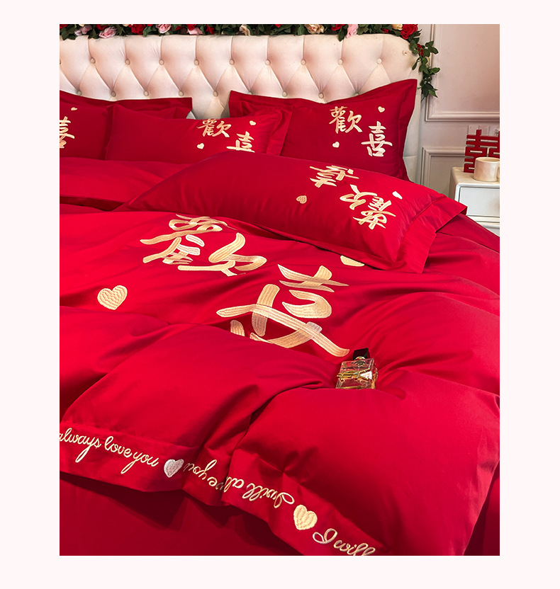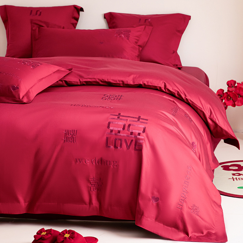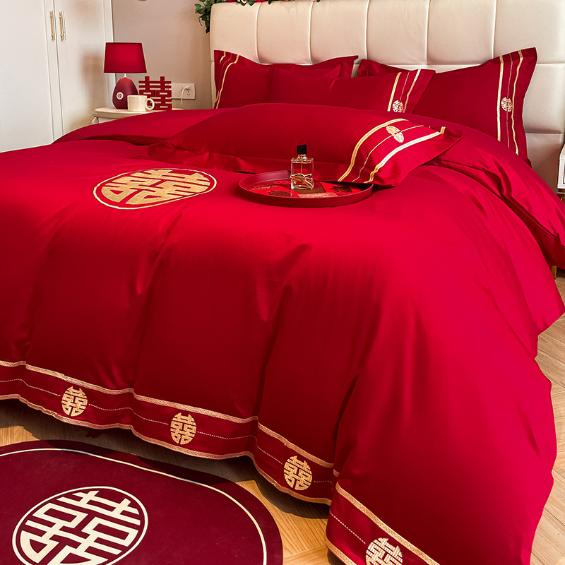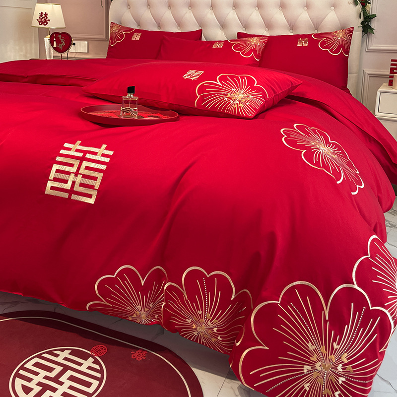 高档中式刺绣全棉婚庆四件套大红色床单被套纯棉陪嫁结婚床品