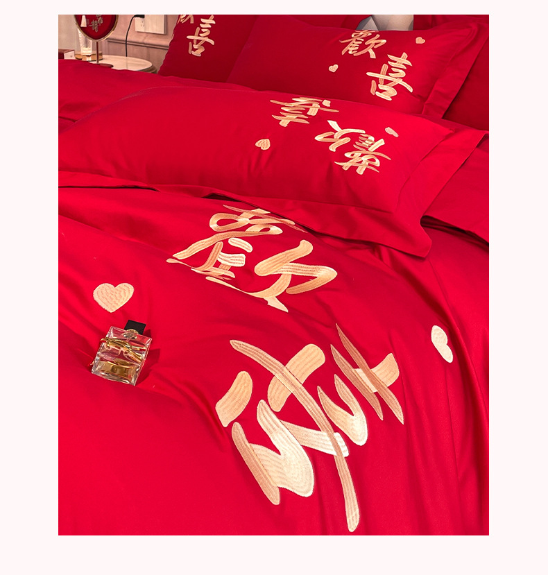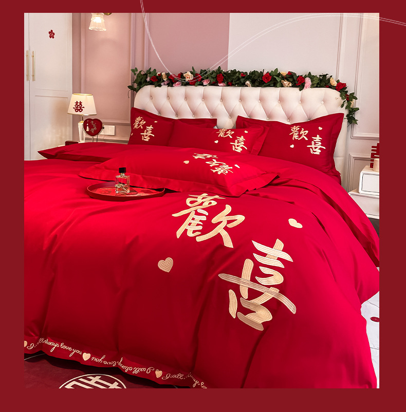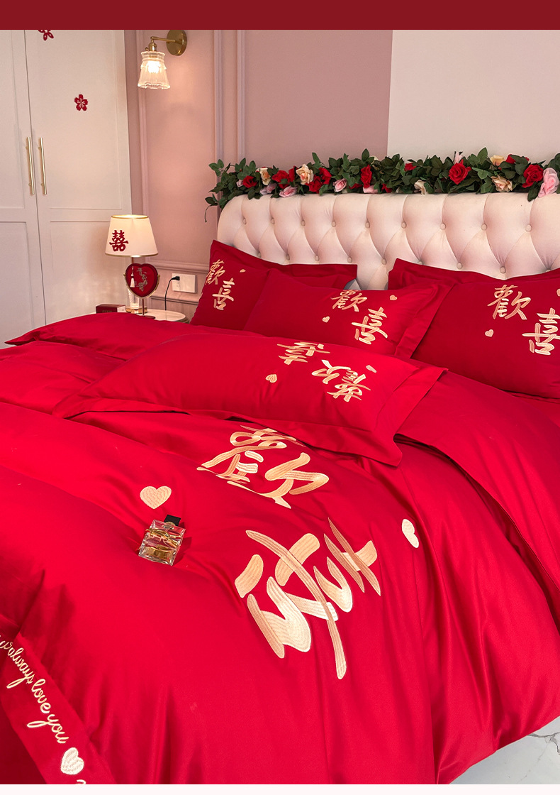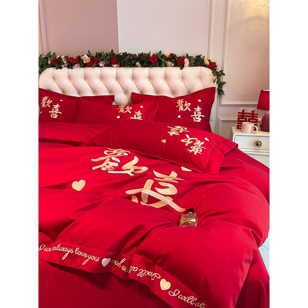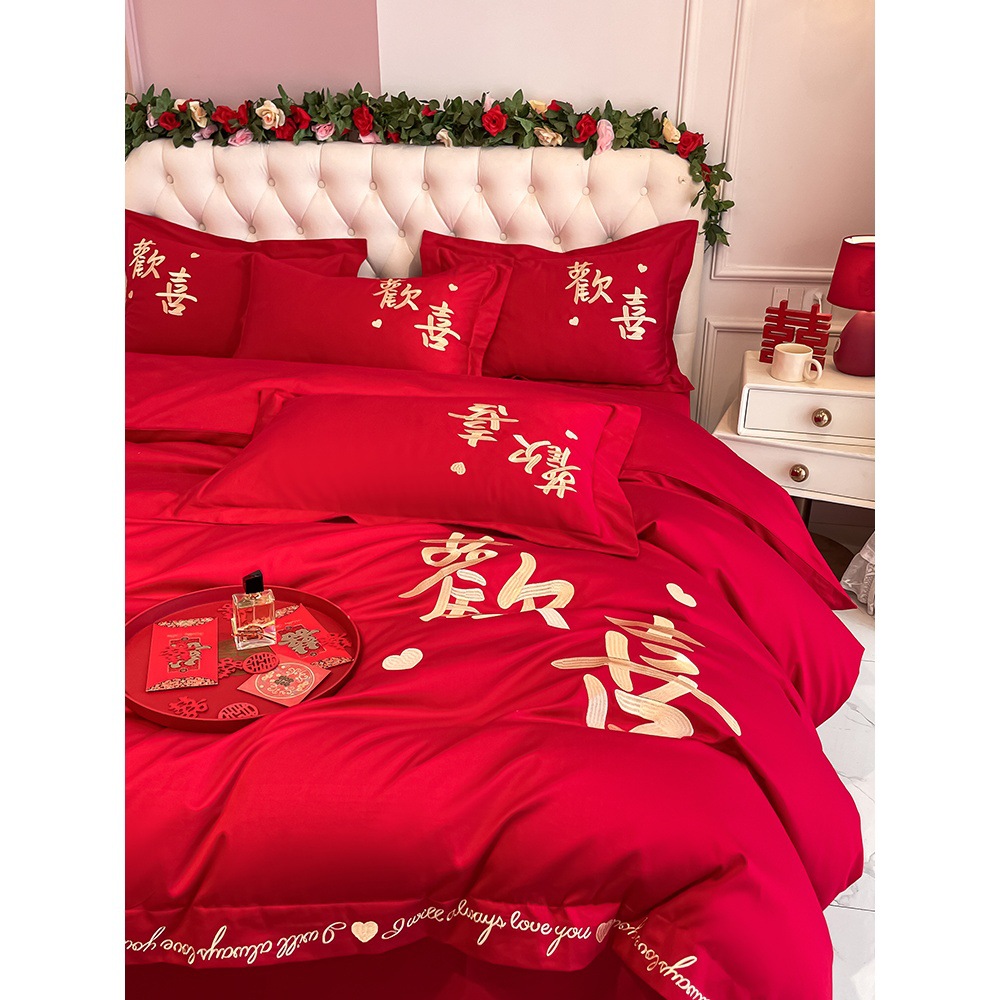 高档中式刺绣全棉婚庆四件套大红色床单被套纯棉陪嫁结婚床品