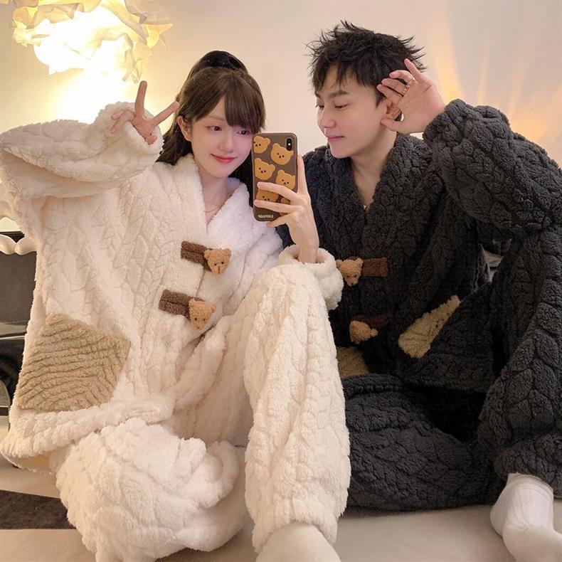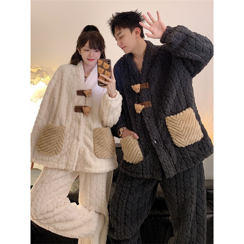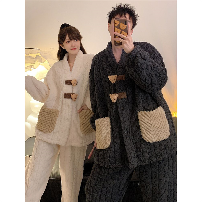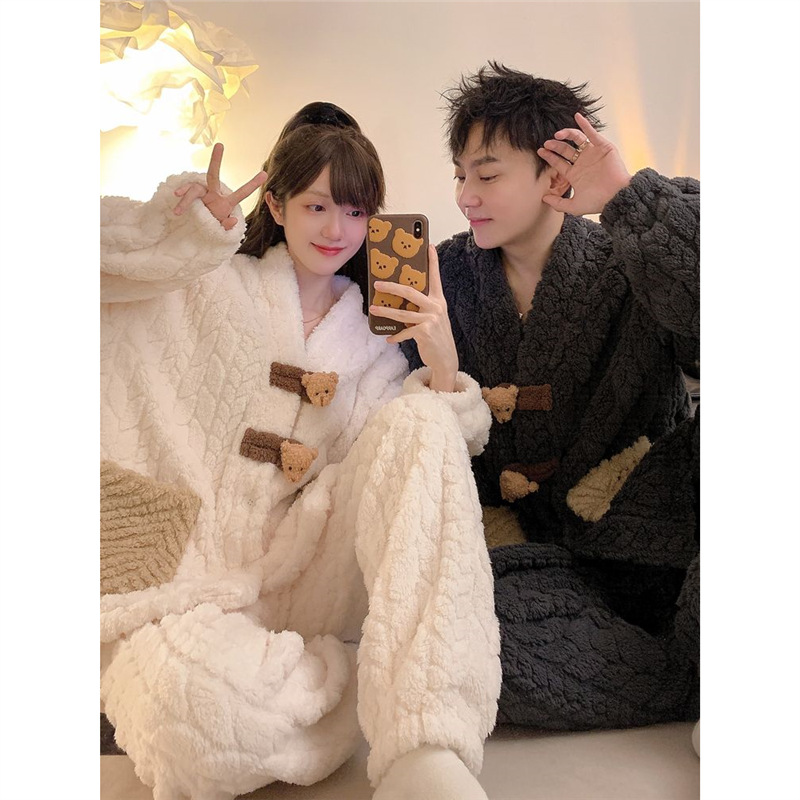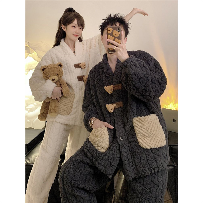 情侣睡衣女秋冬季加厚珊瑚绒2024新款韩版小熊男士冬天毛绒家居服