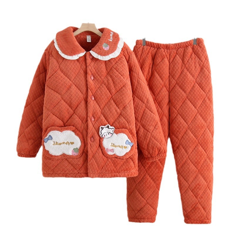 橘红牛奶绒三层夹棉女士睡衣冬季加厚加绒保暖春秋冬天款家居服