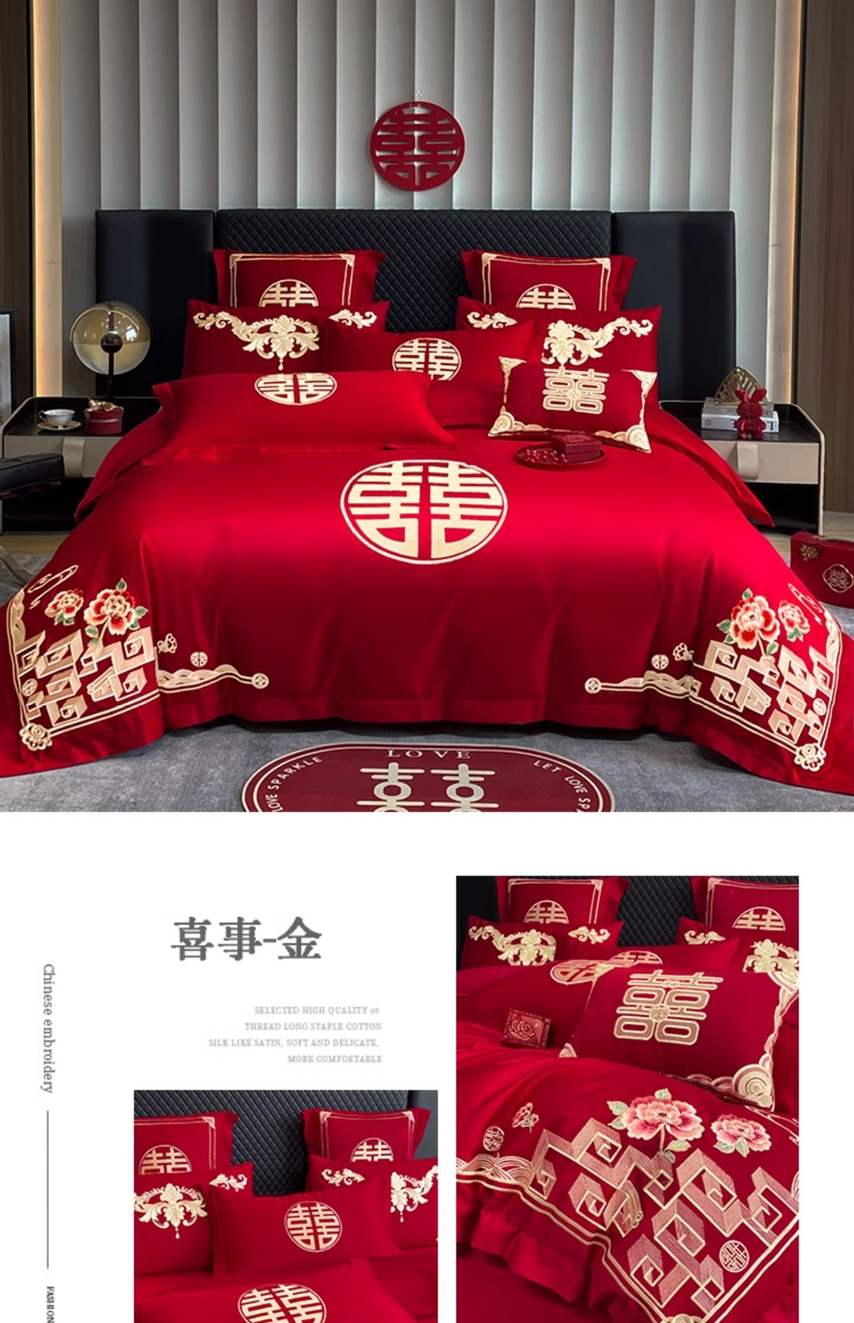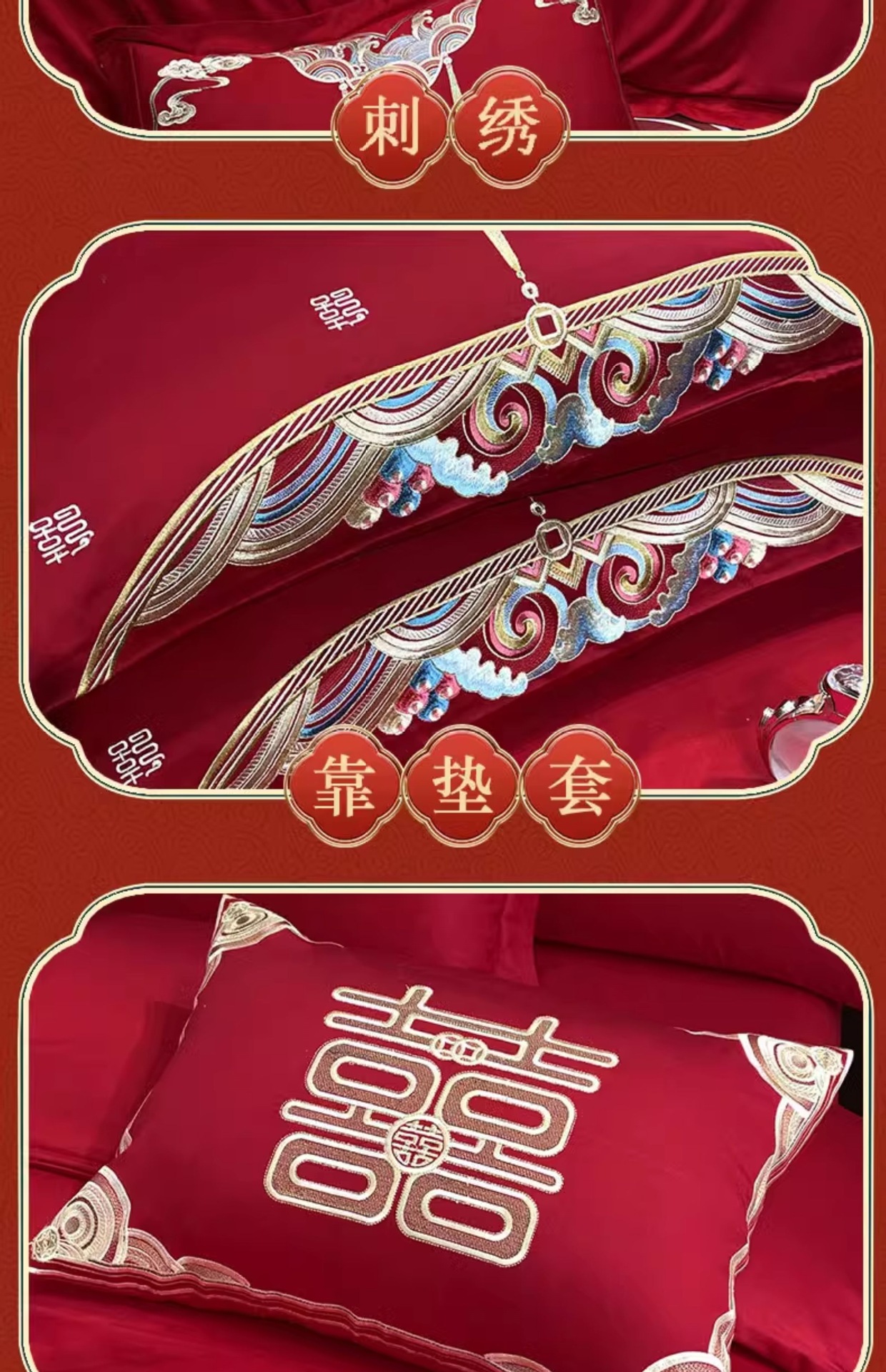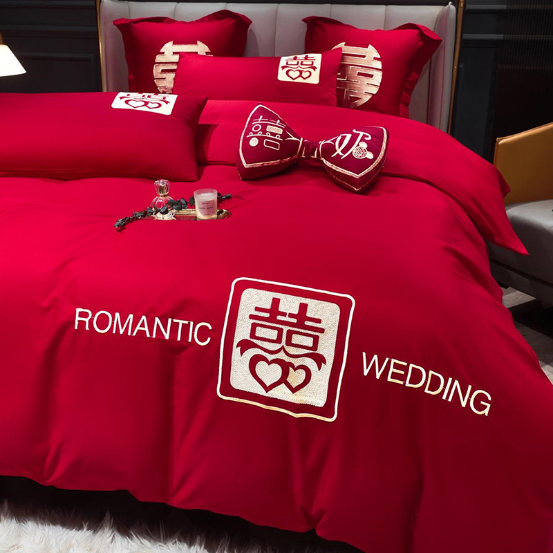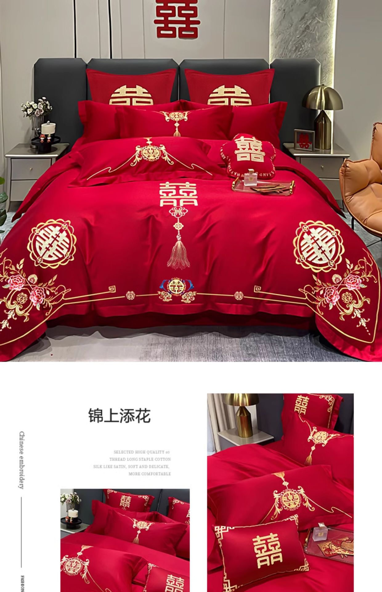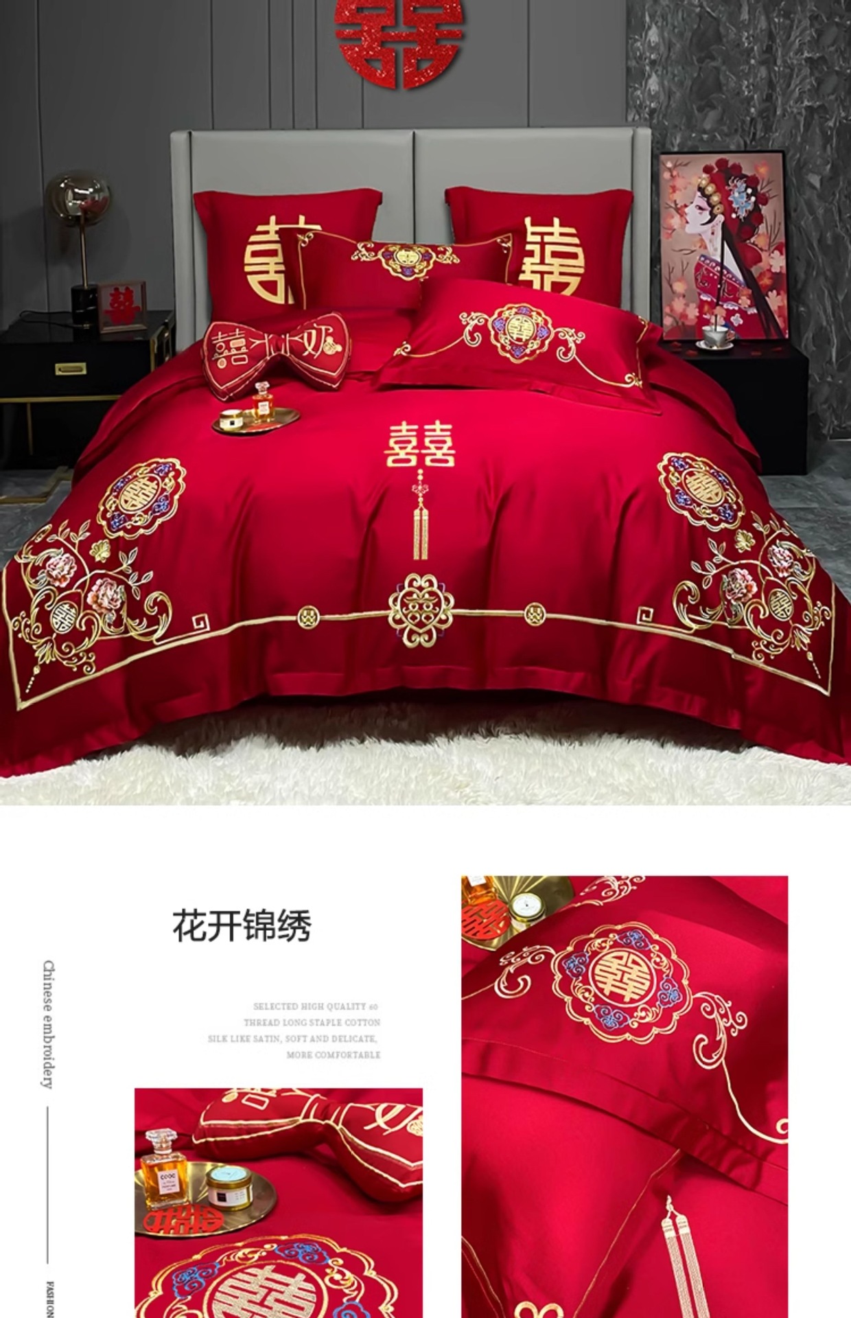 浪莎中式婚庆四件套红色刺绣婚房婚礼绣花喜被结婚被套床上用品