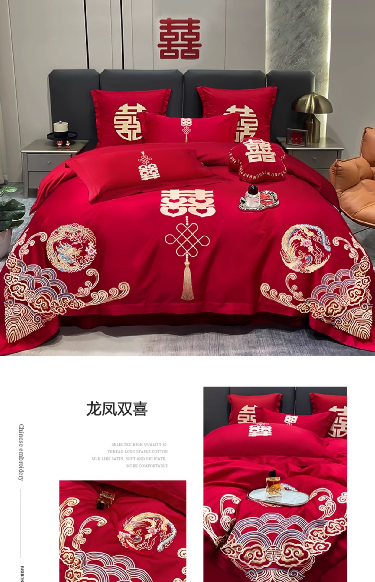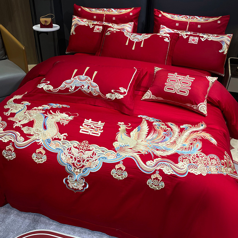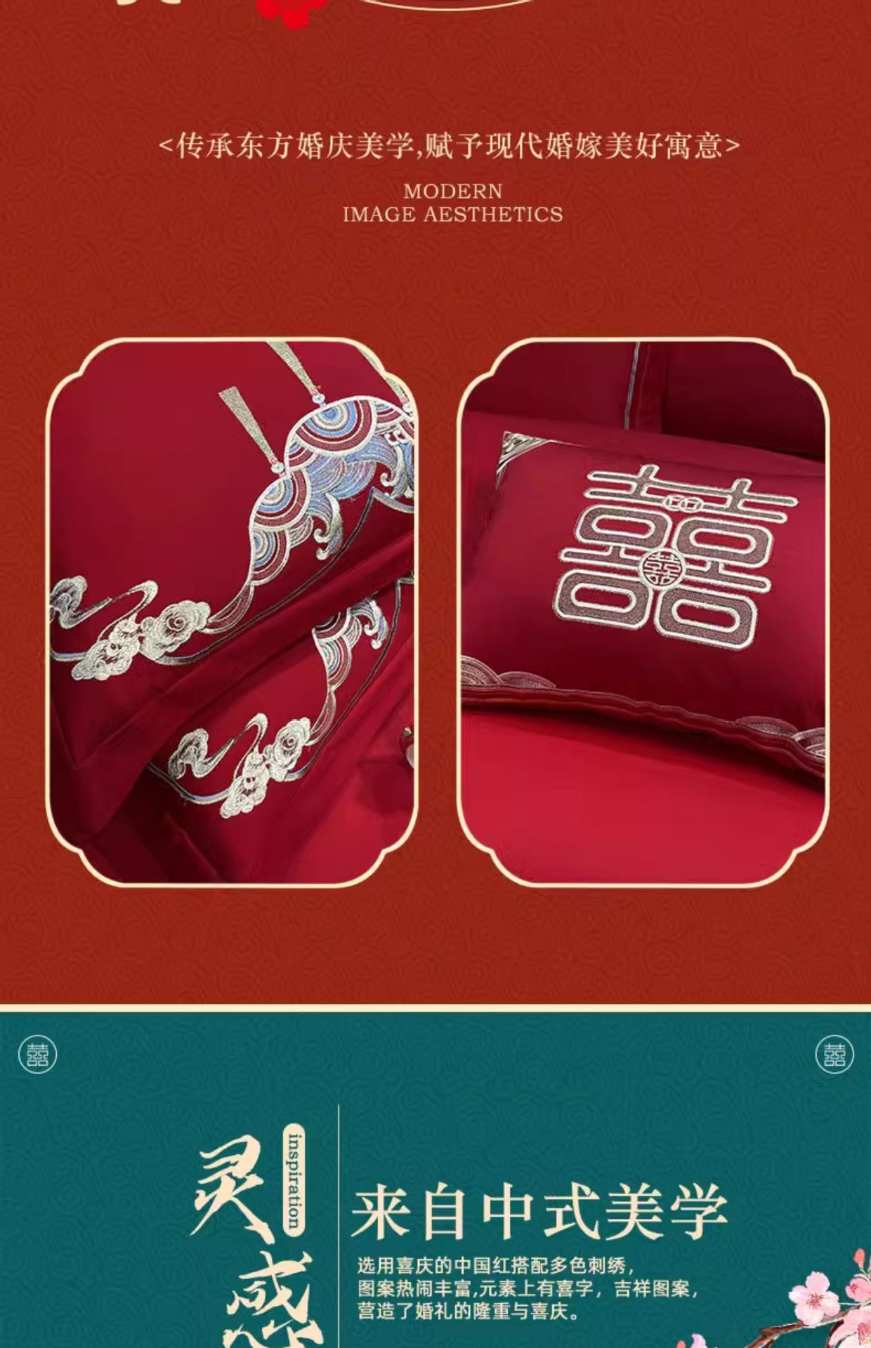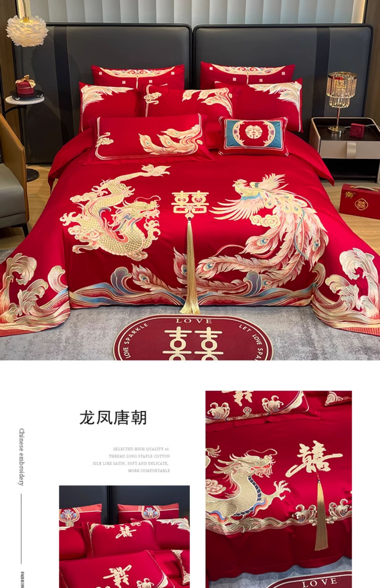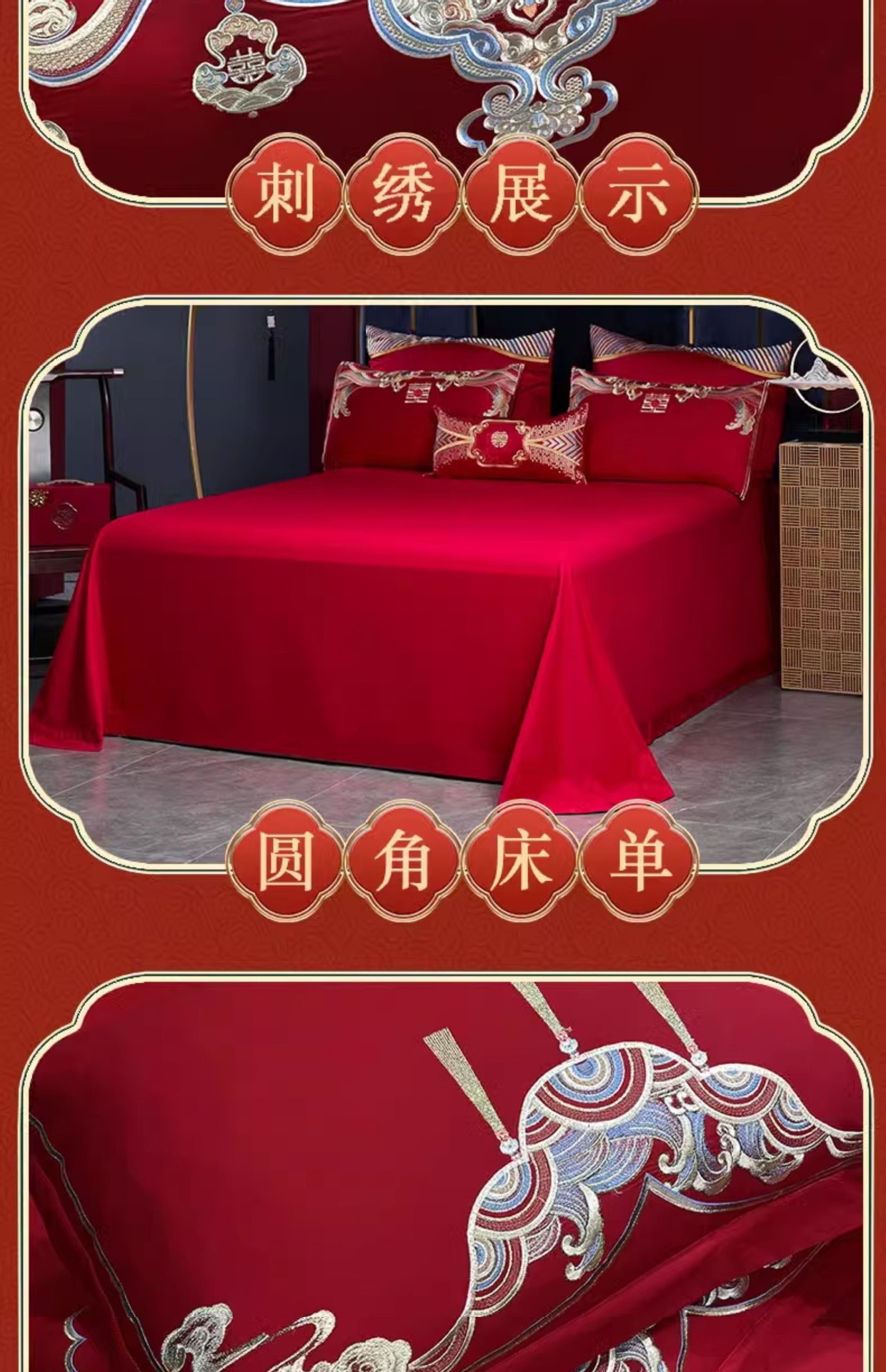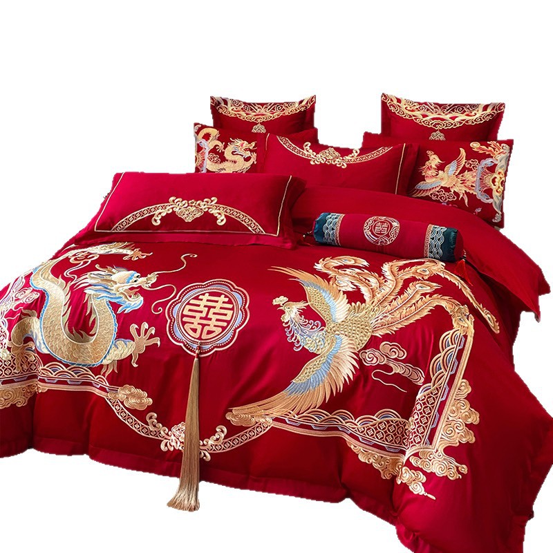 浪莎中式婚庆四件套红色刺绣婚房婚礼绣花喜被结婚被套床上用品