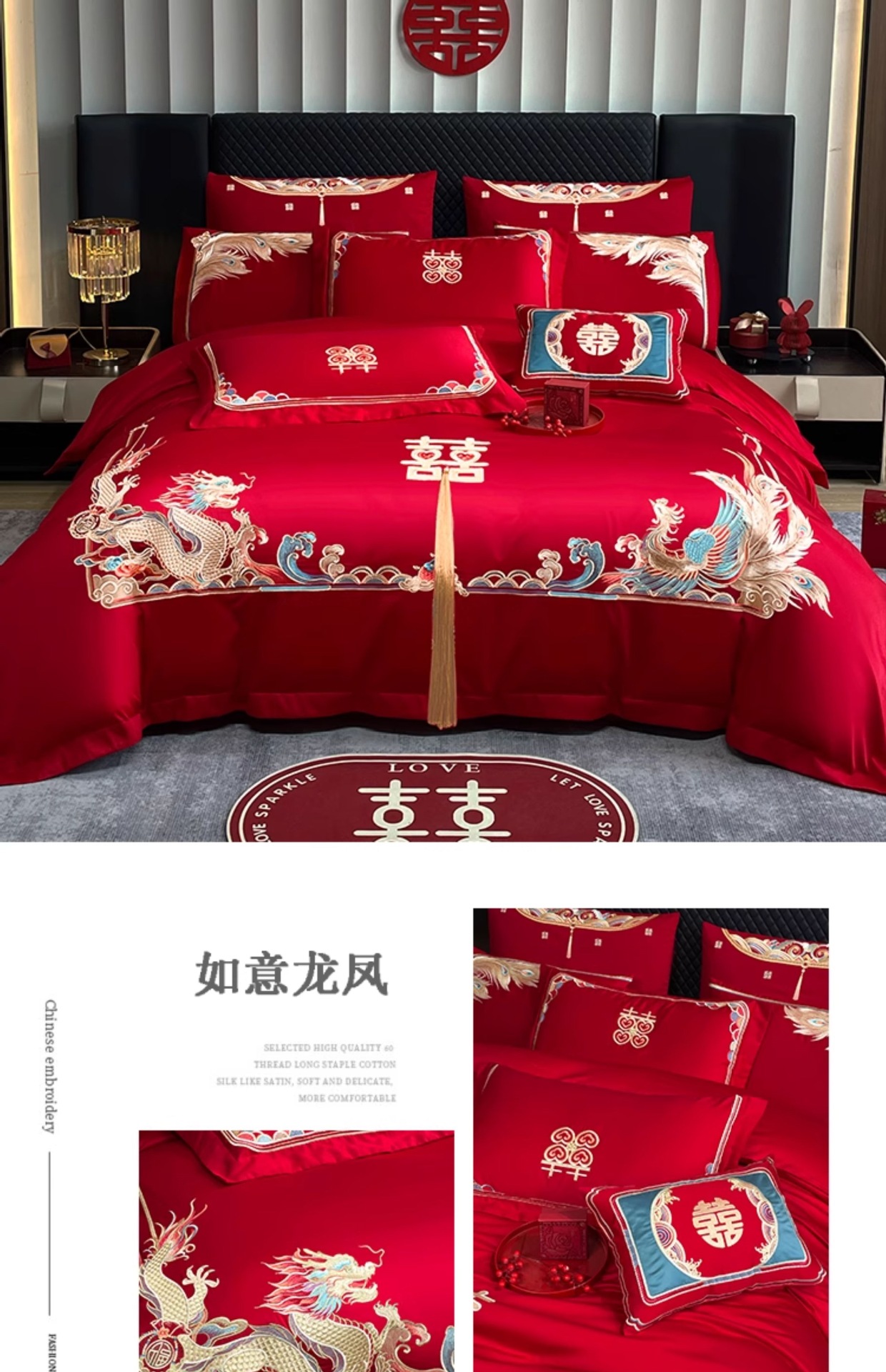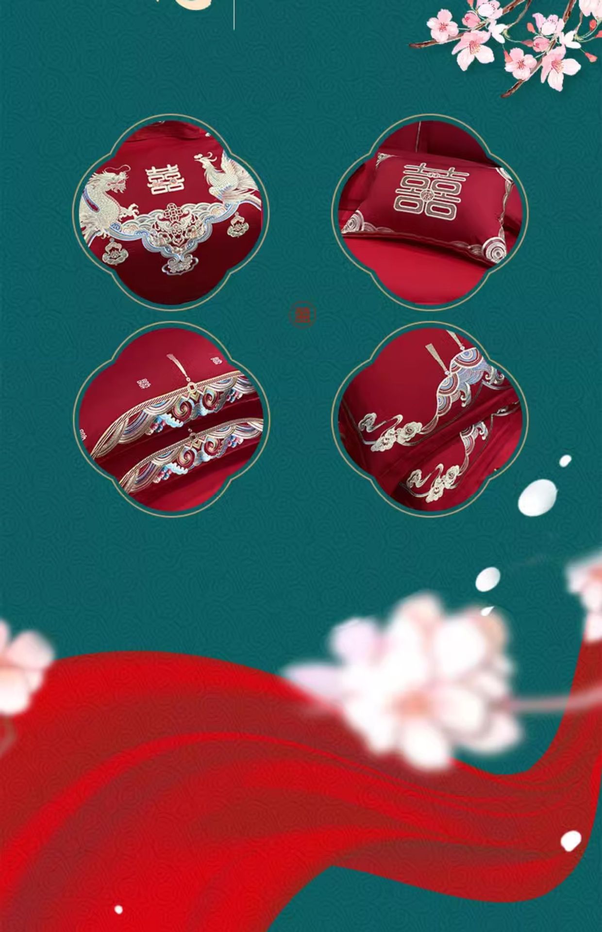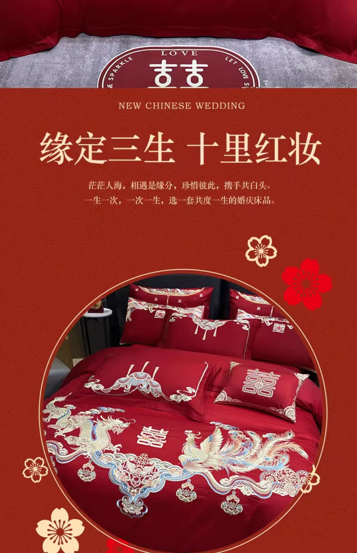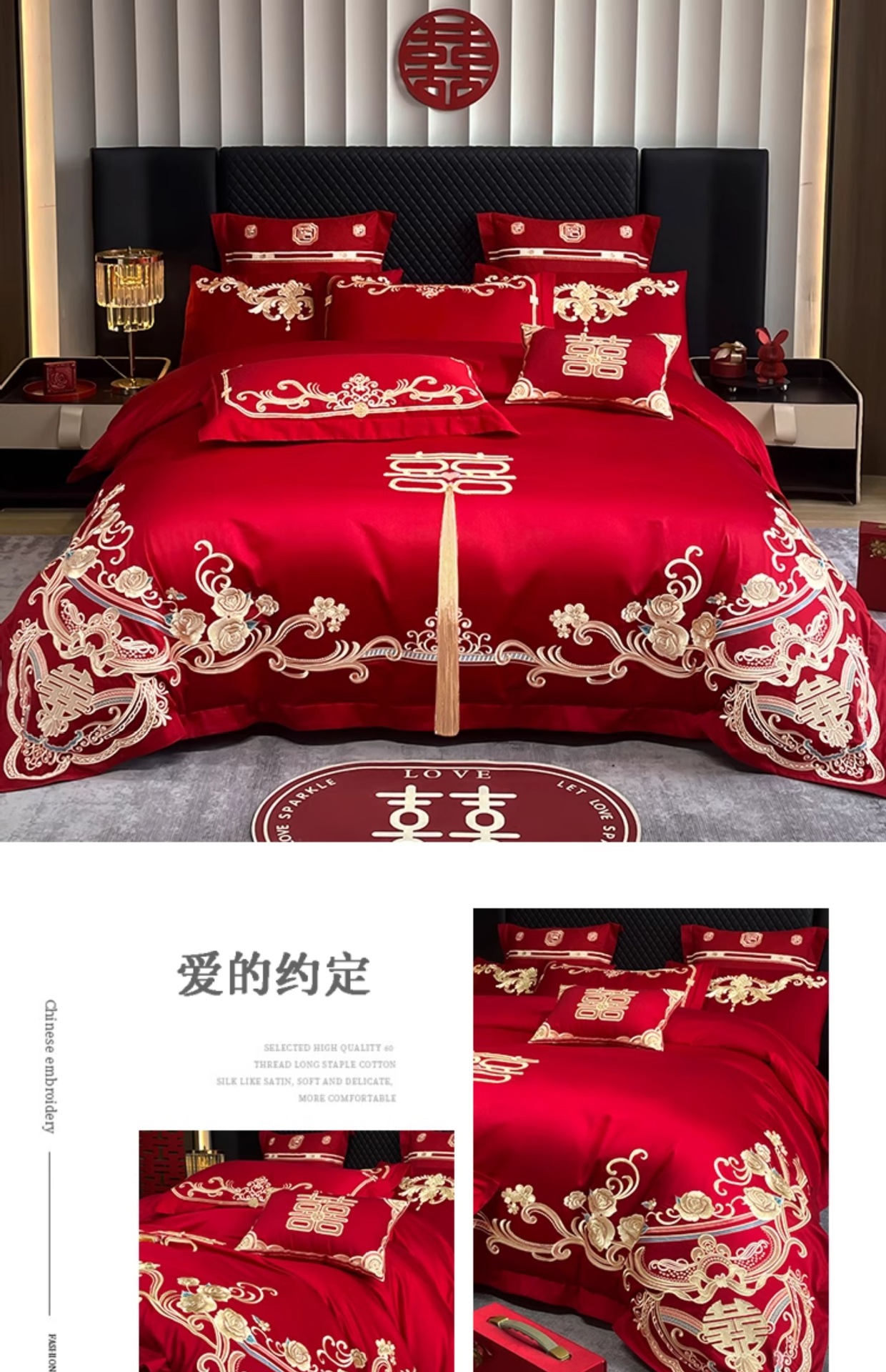 浪莎中式婚庆四件套红色刺绣婚房婚礼绣花喜被结婚被套床上用品