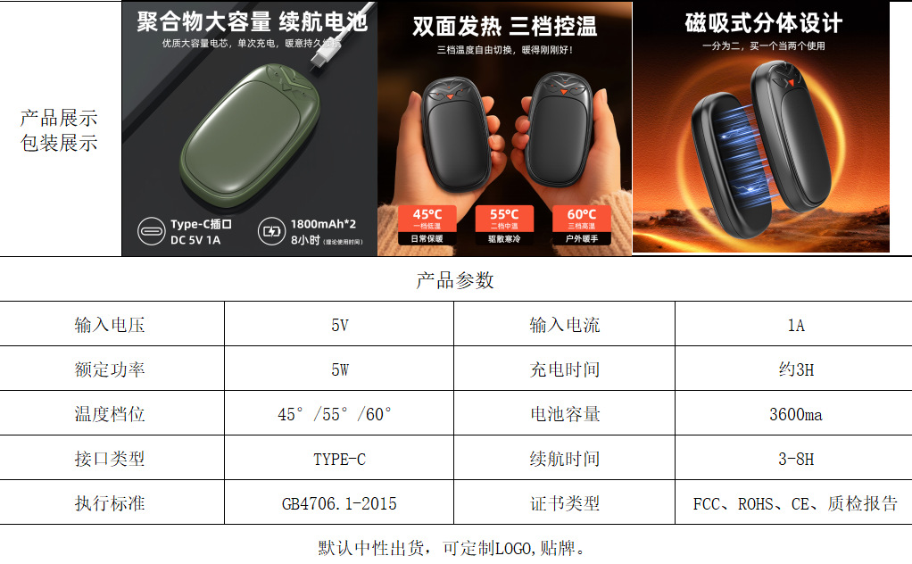 跨境分体式磁吸暖手宝二合一可充电调节高温防爆便携小巧冬季礼品