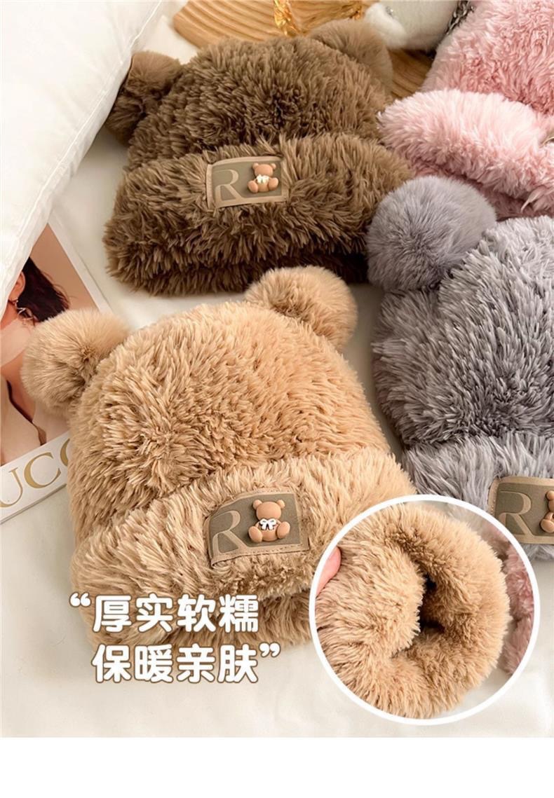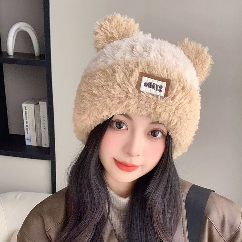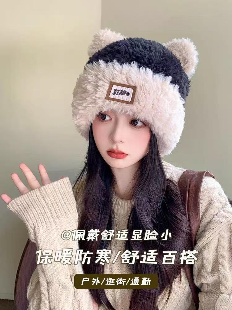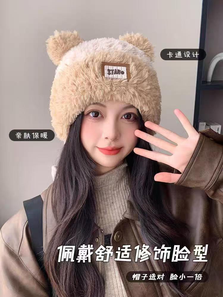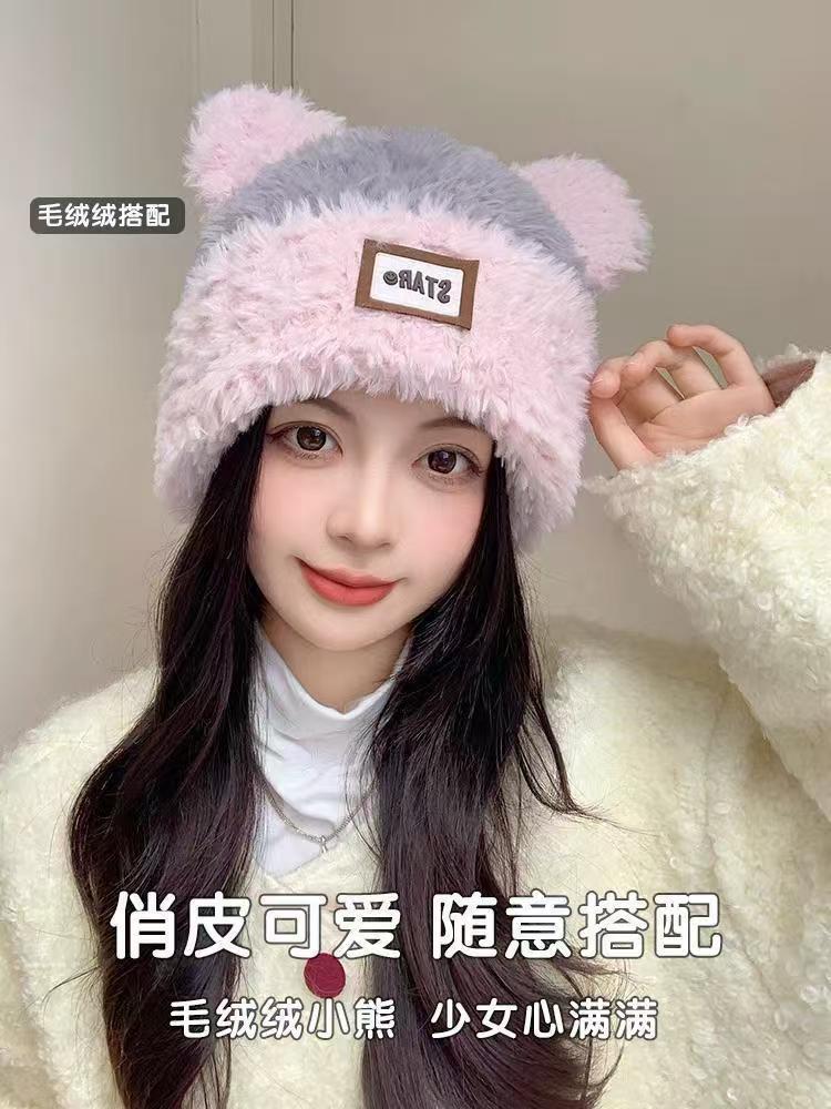 冬季毛绒针织帽女可爱小熊耳朵套头月子帽韩版百搭护耳甜美雷锋帽