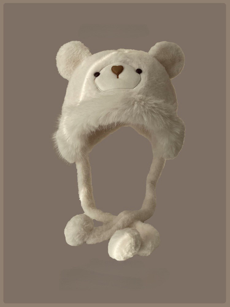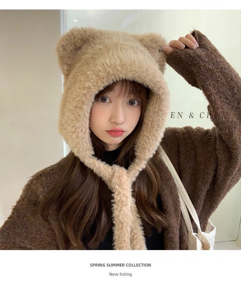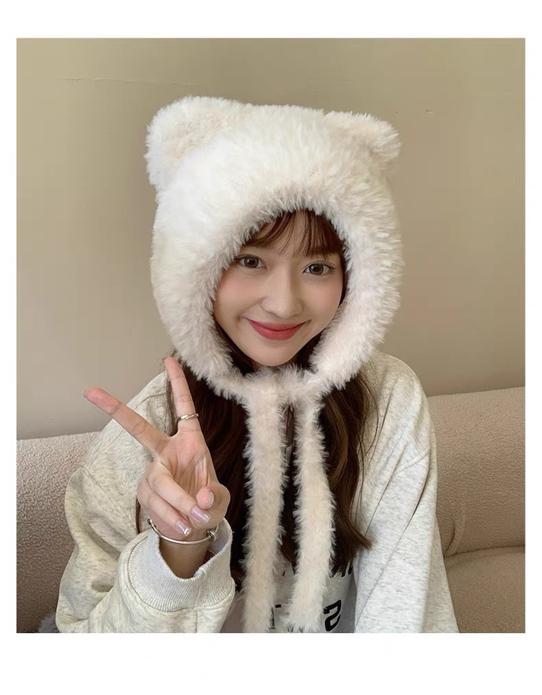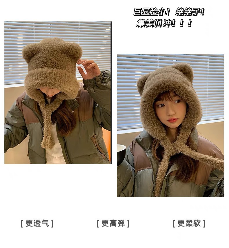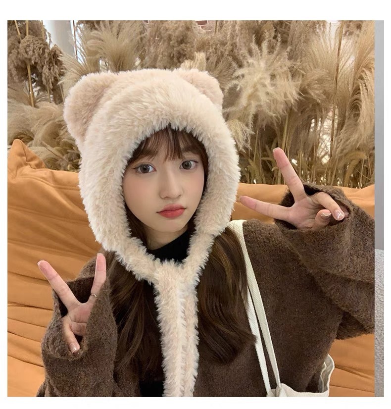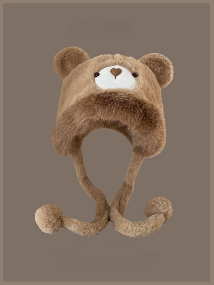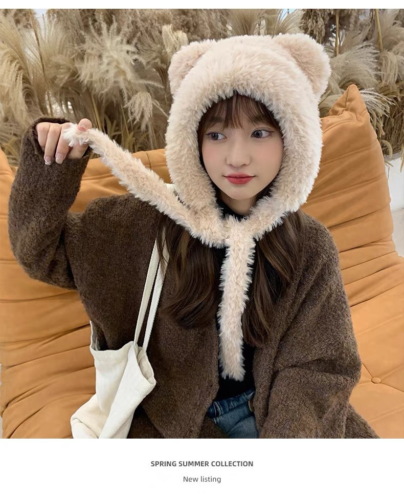 跨境小熊毛绒帽女冬天加厚保暖护耳套头帽日韩甜美潮流卡通针织帽