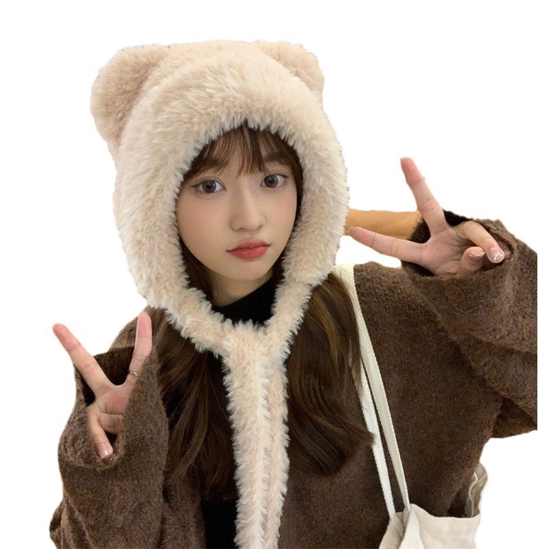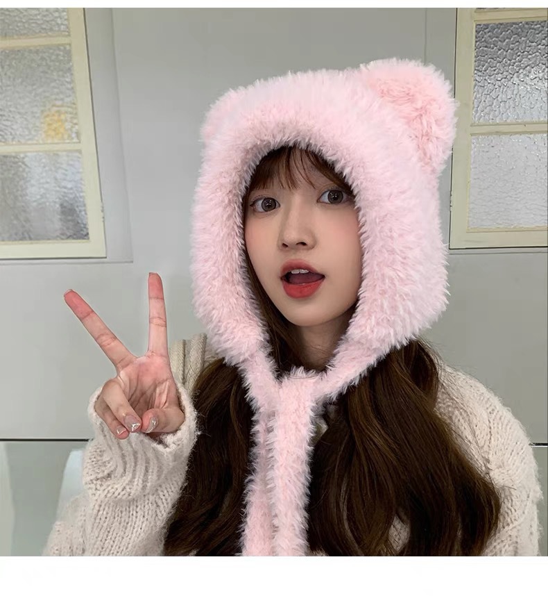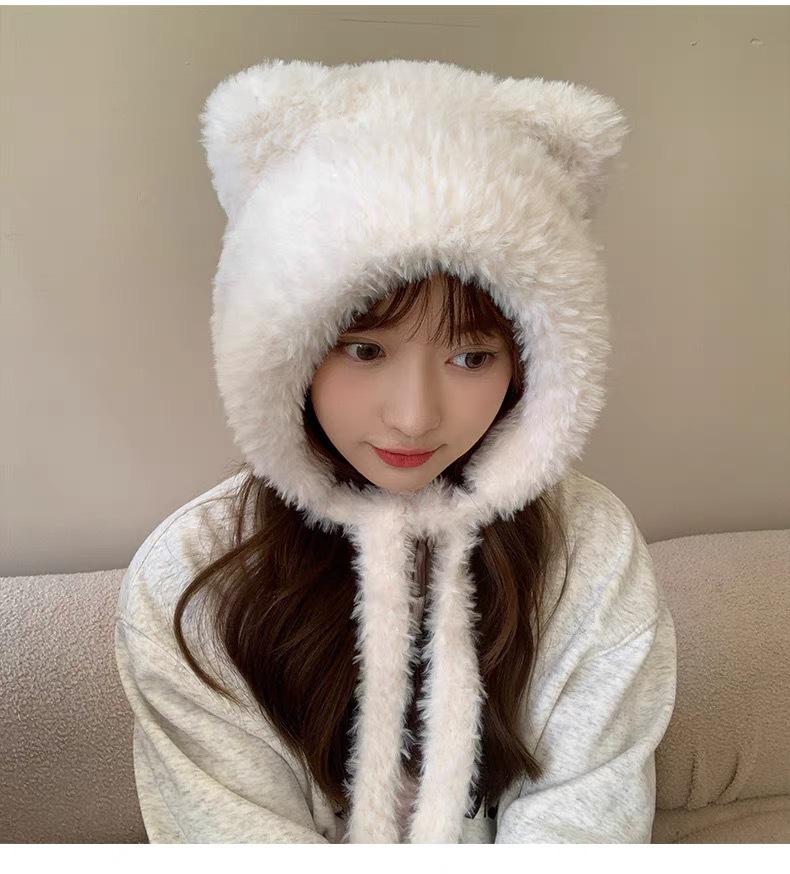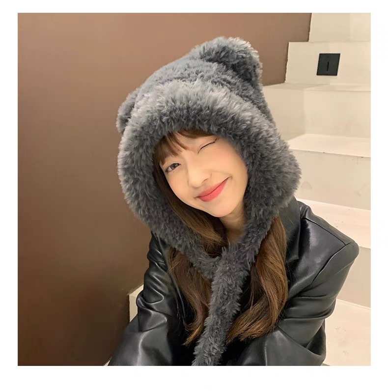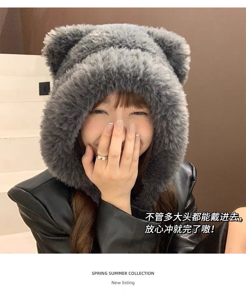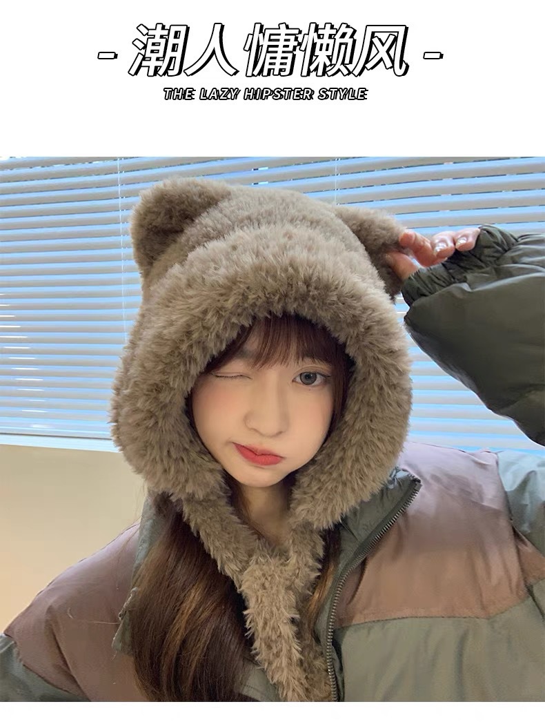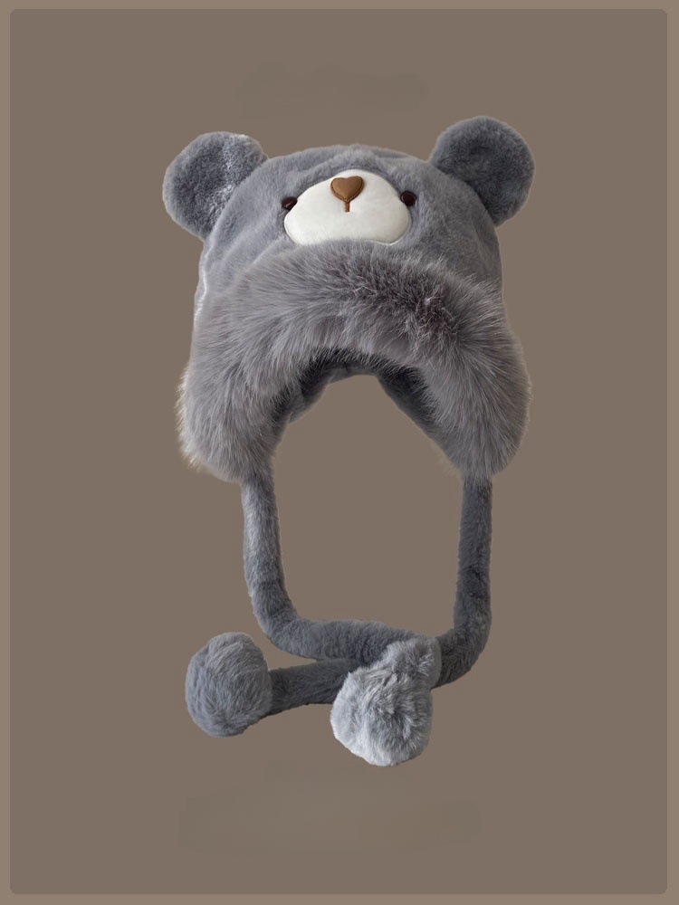 跨境小熊毛绒帽女冬天加厚保暖护耳套头帽日韩甜美潮流卡通针织帽