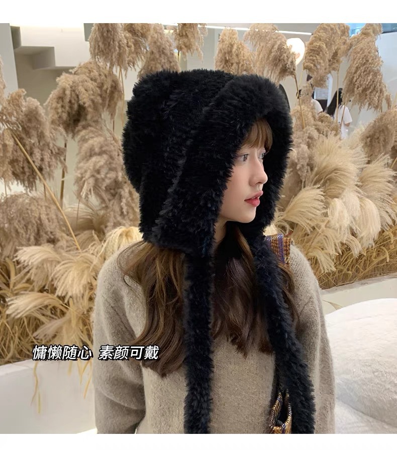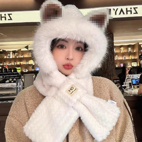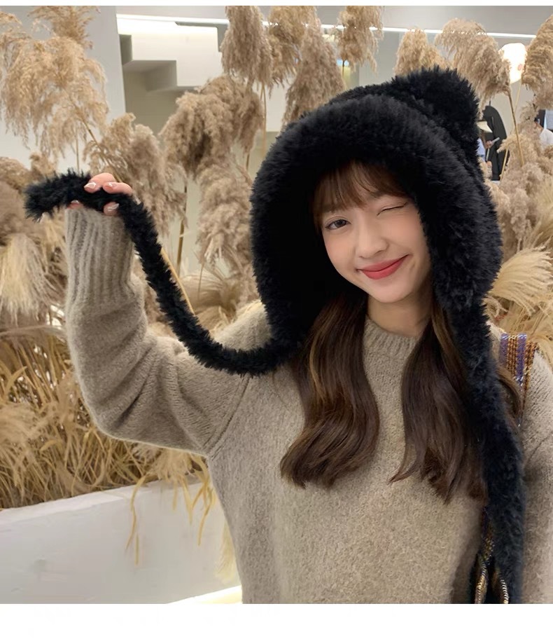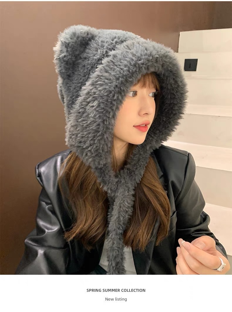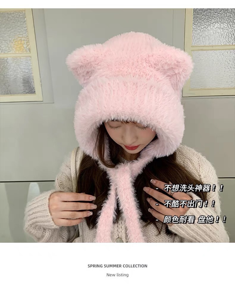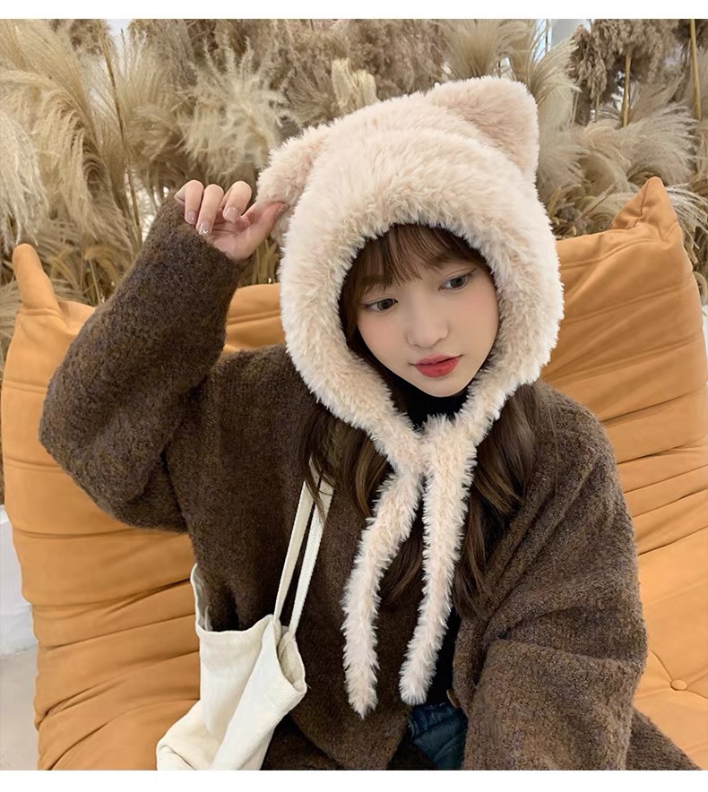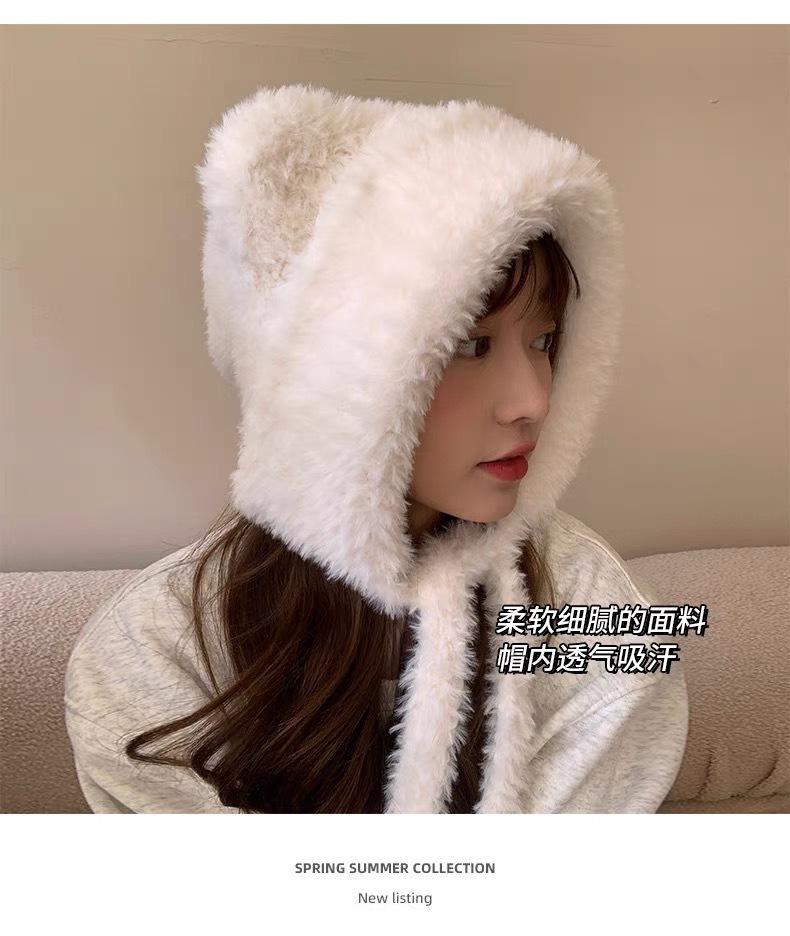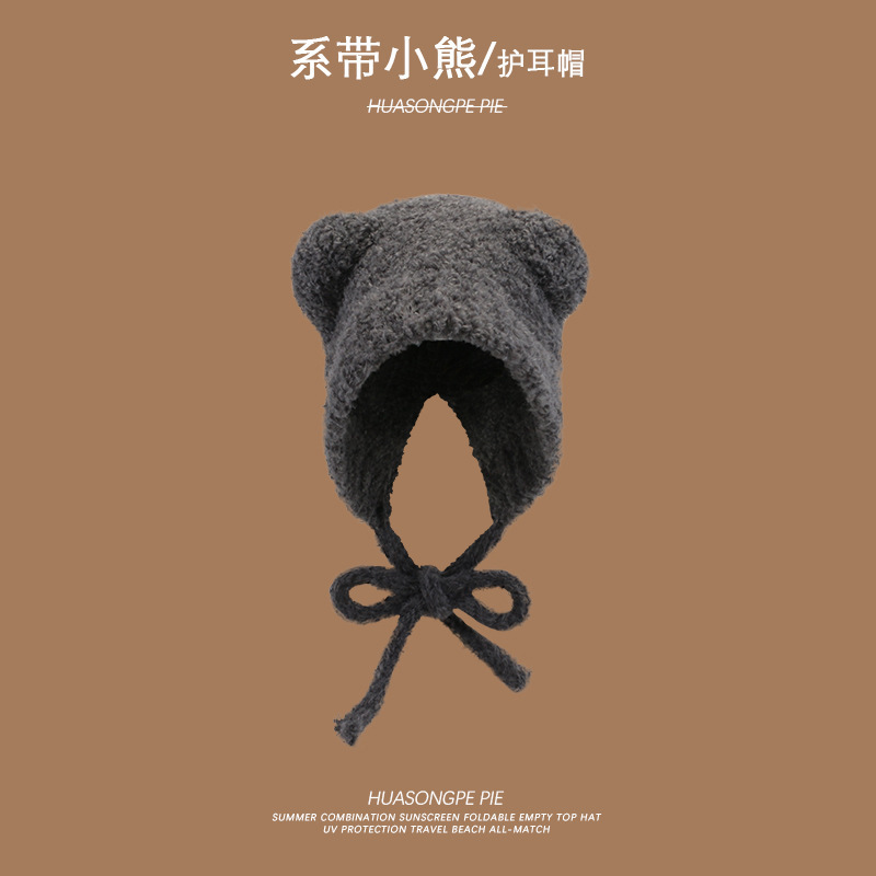 跨境小熊毛绒帽女冬天加厚保暖护耳套头帽日韩甜美潮流卡通针织帽