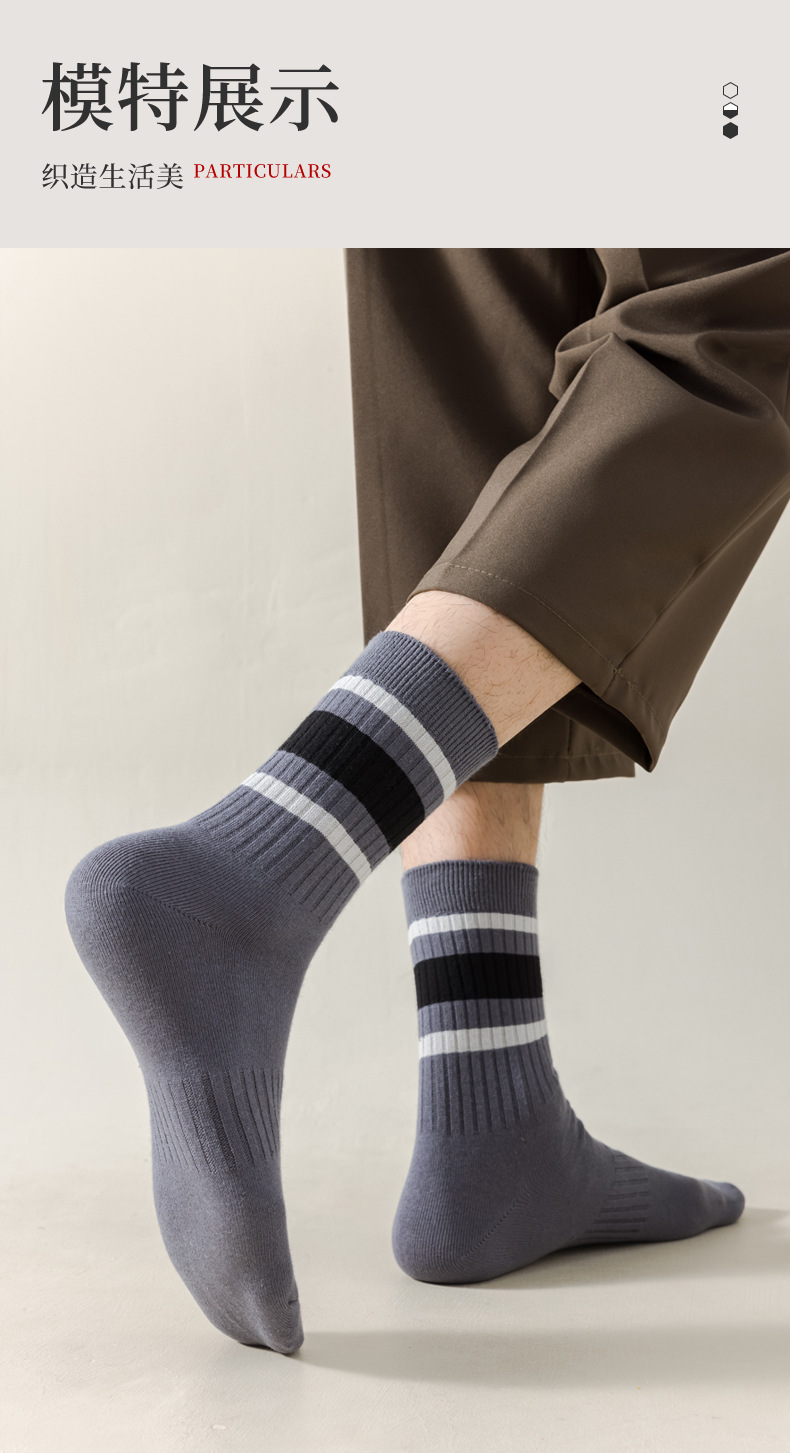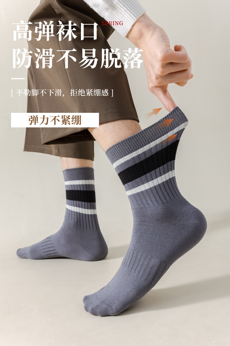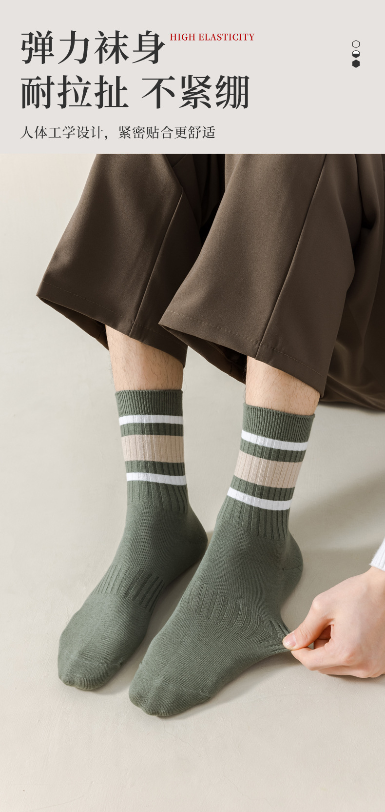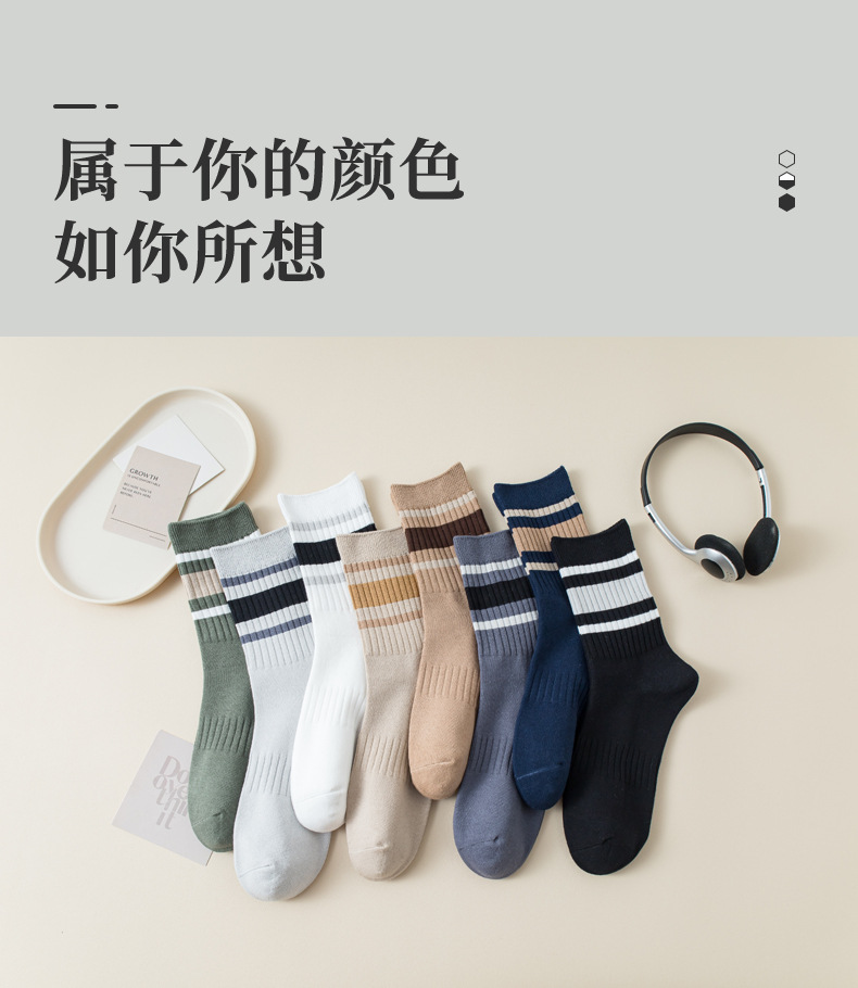 秋冬新款条纹袜子男士百搭双针中筒袜日系束腰运动男袜棉质长筒袜
