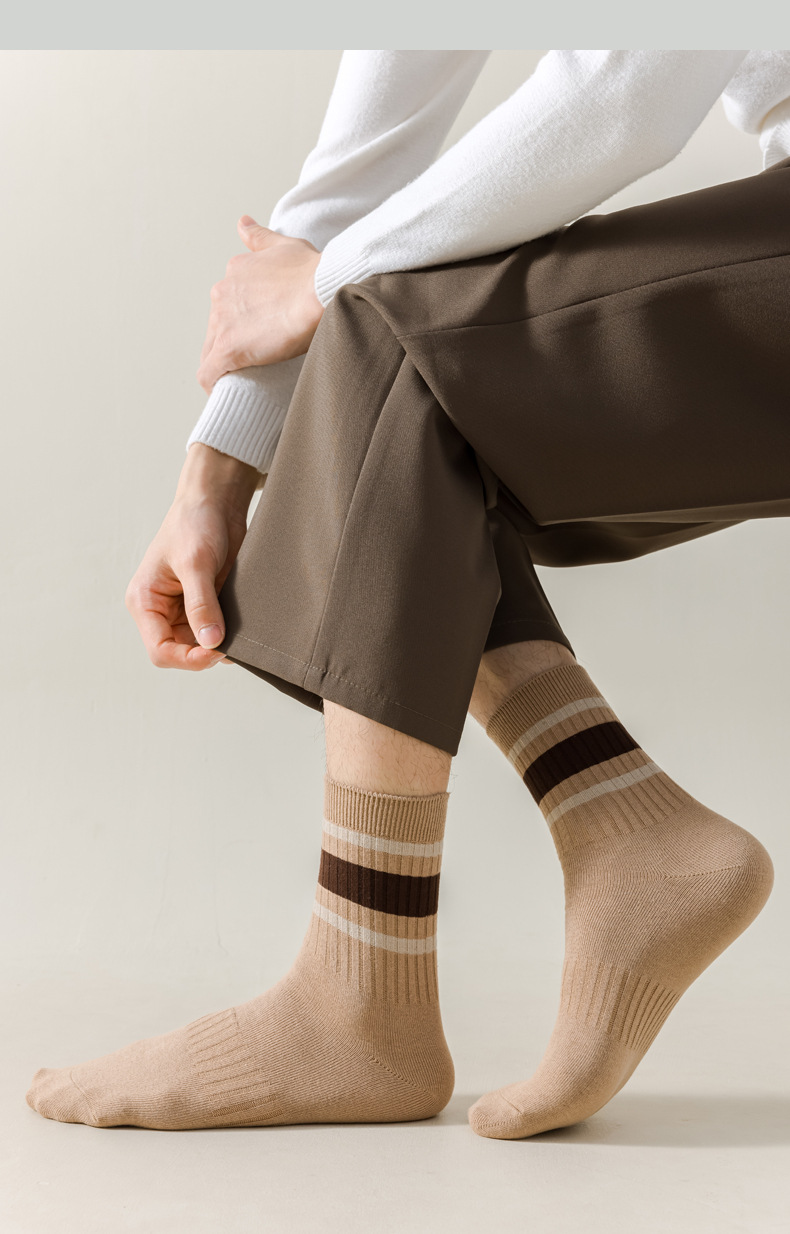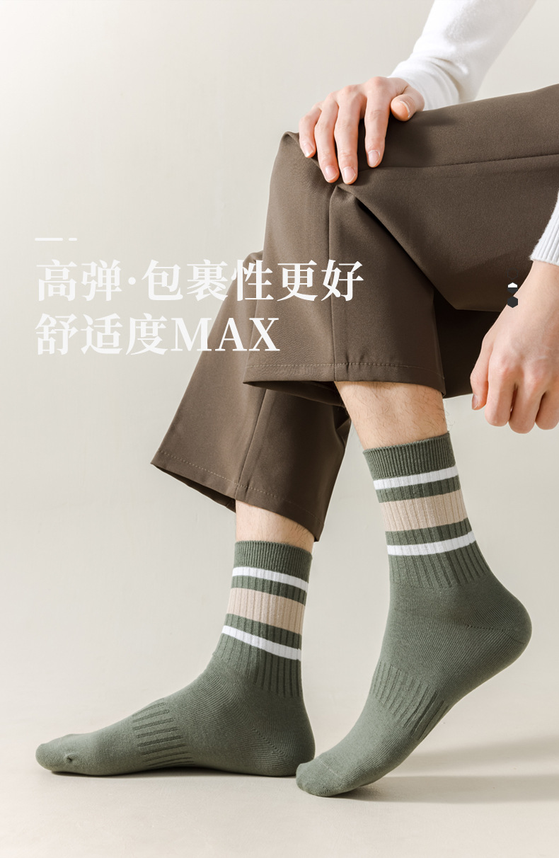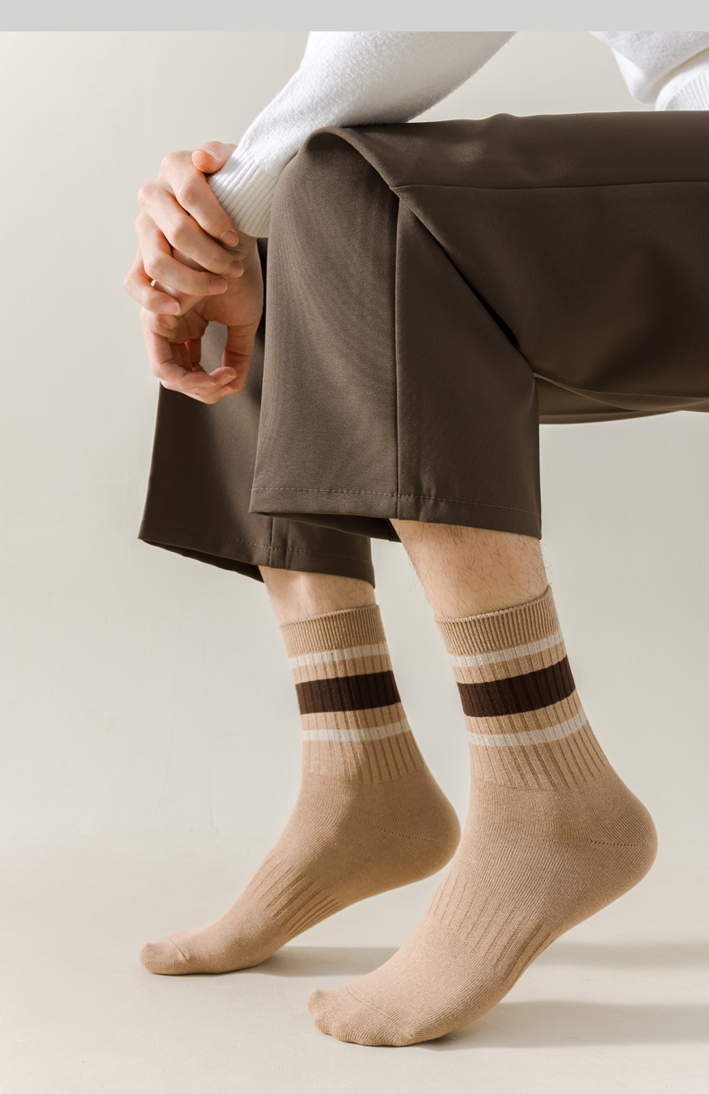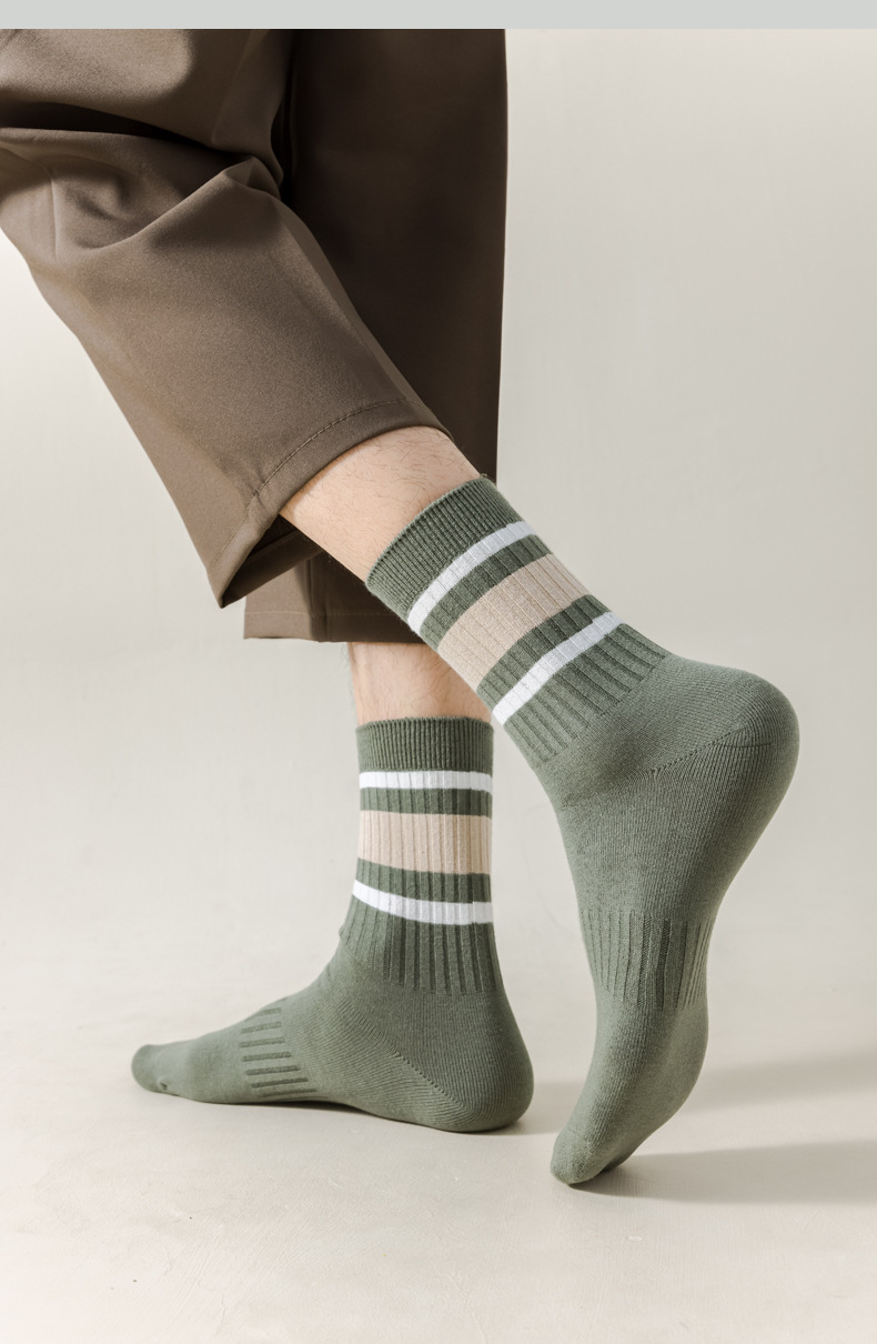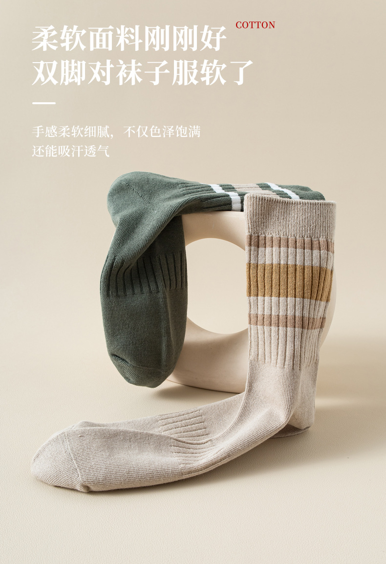秋冬新款条纹袜子男士百搭双针中筒袜日系束腰运动男袜棉质长筒袜
