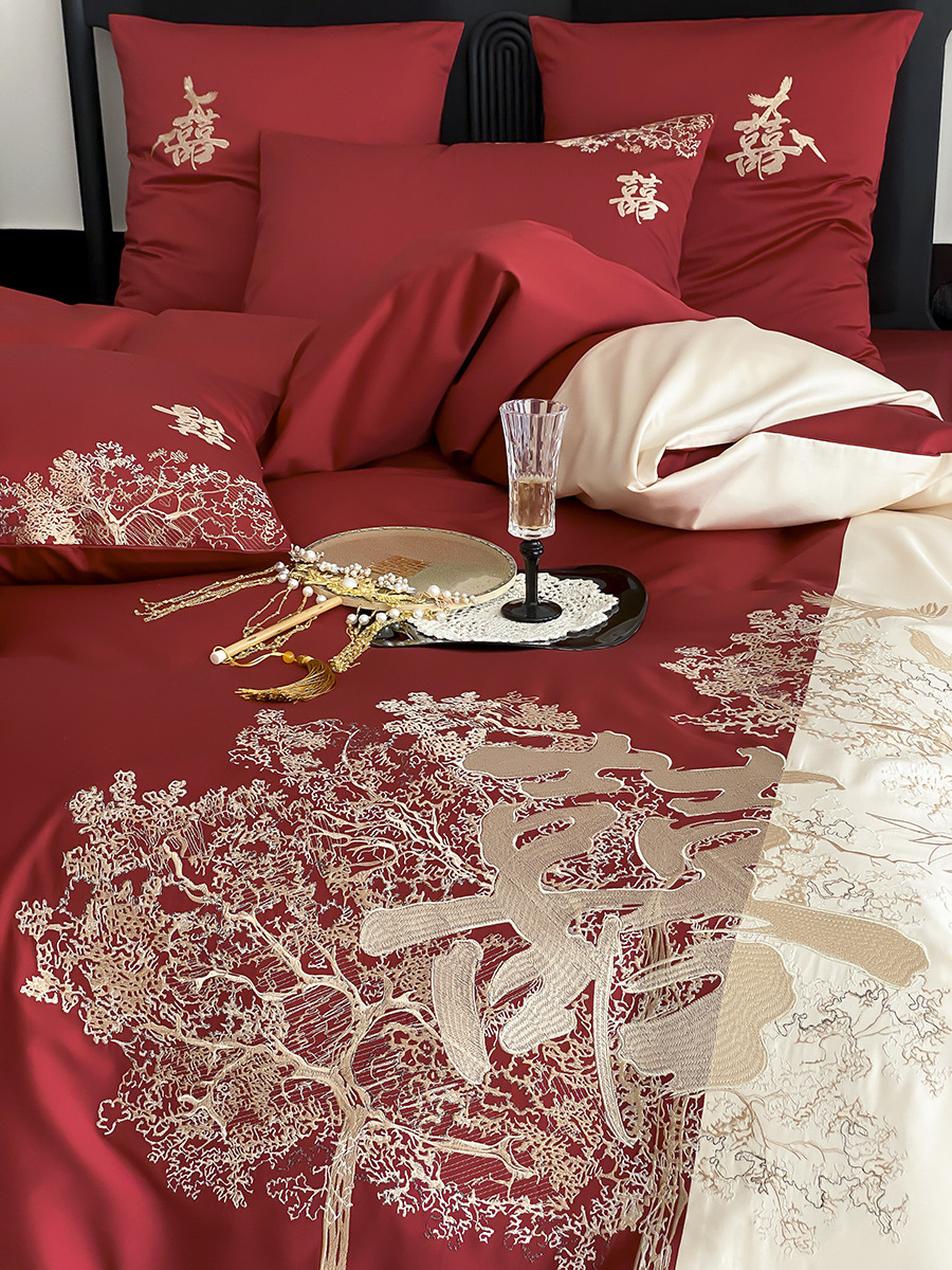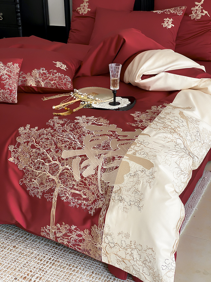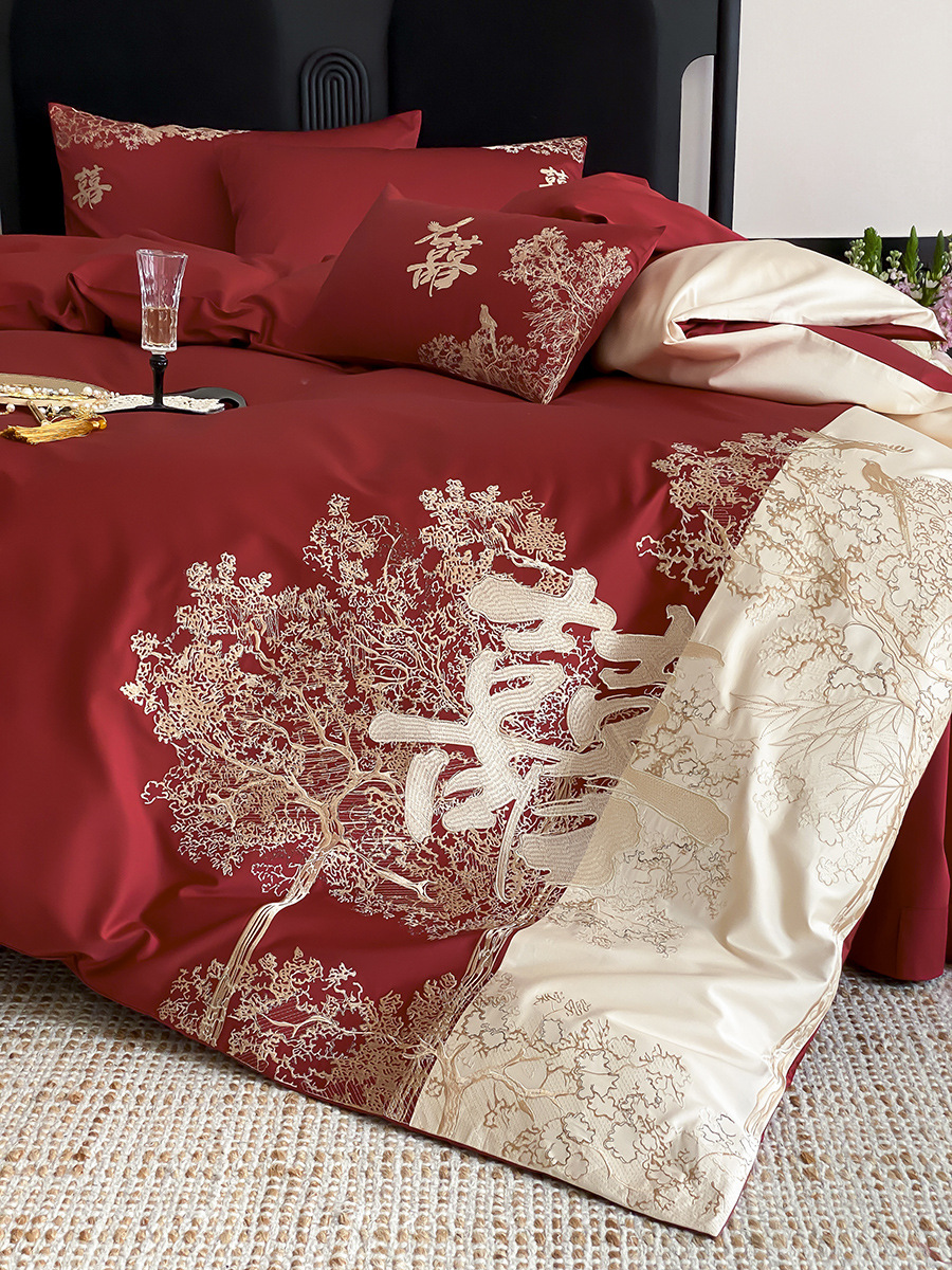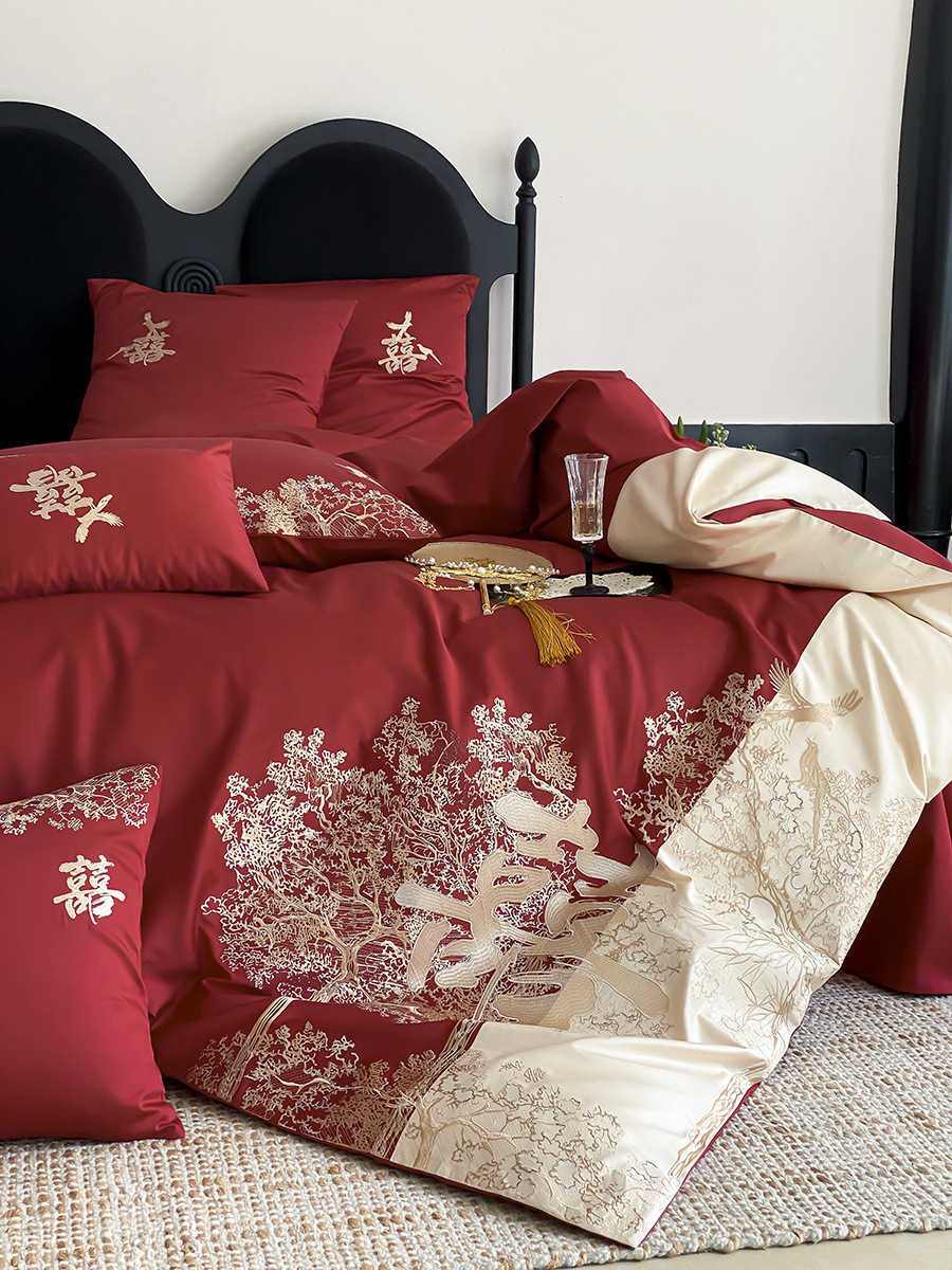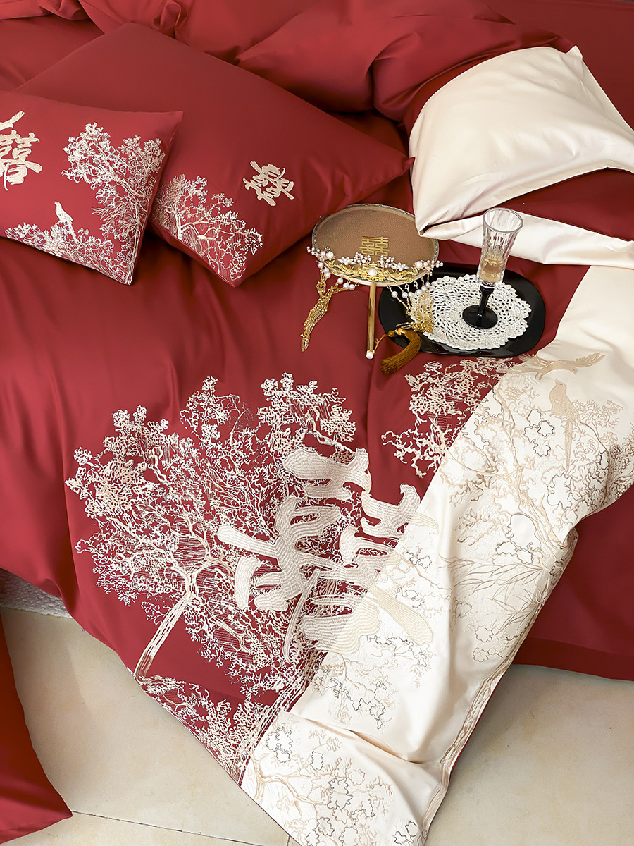 家纺轻奢新婚庆高支纯棉刺绣四件套红色中式婚嫁喜被床上用品