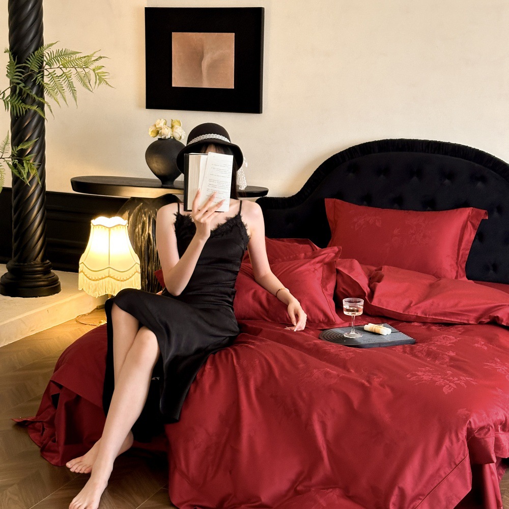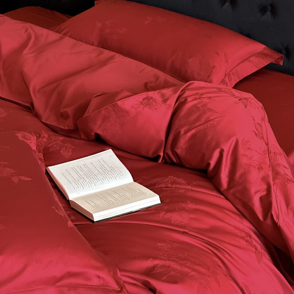尊贵优雅100支长绒棉四件套玫瑰提花浪漫被套全棉红色接亲床品