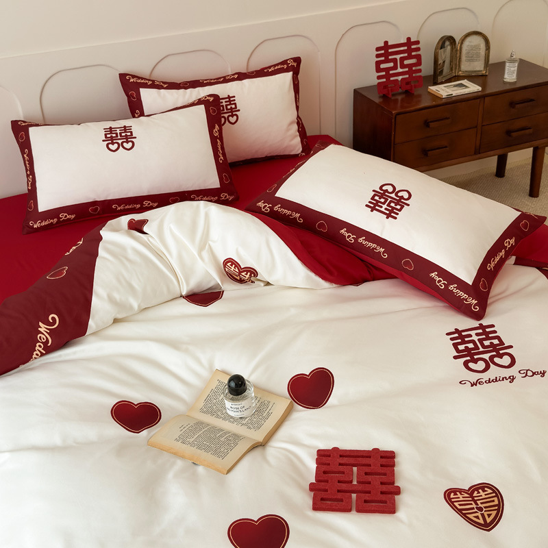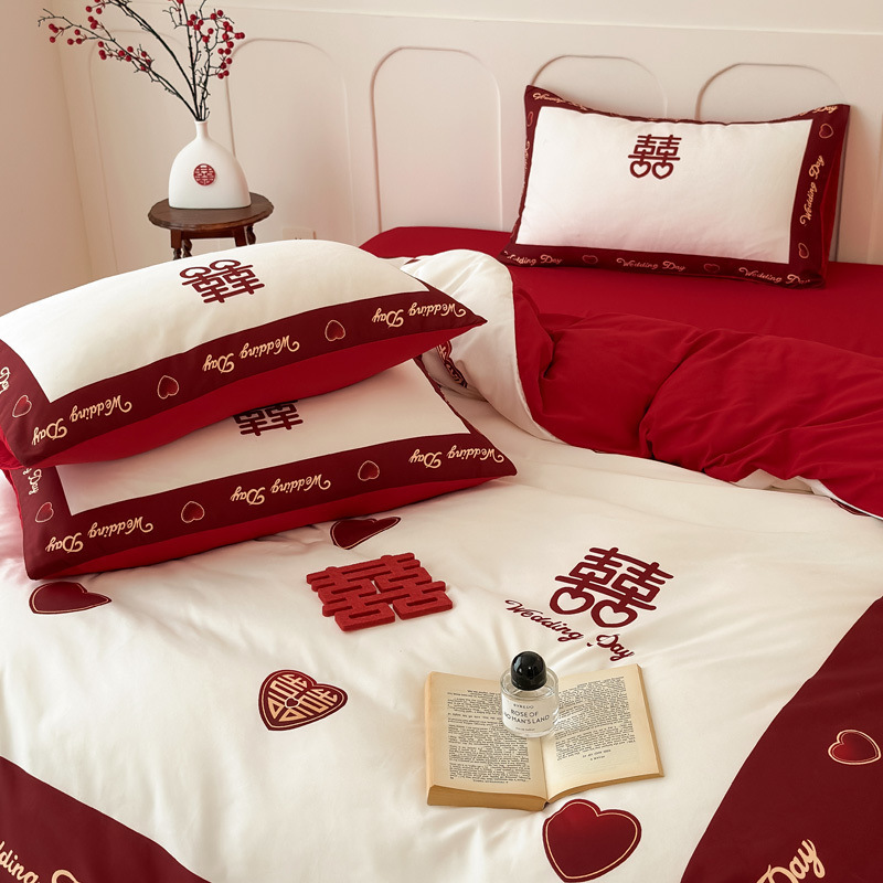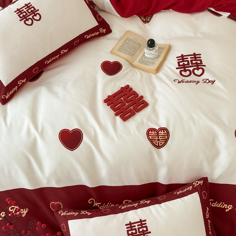 中式婚庆水洗棉喜庆四件套红床单床笠磨毛被套结婚房床上用品
