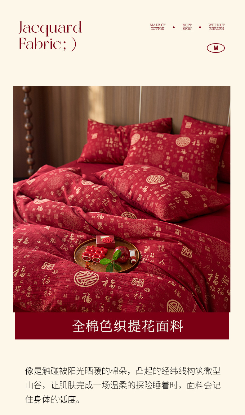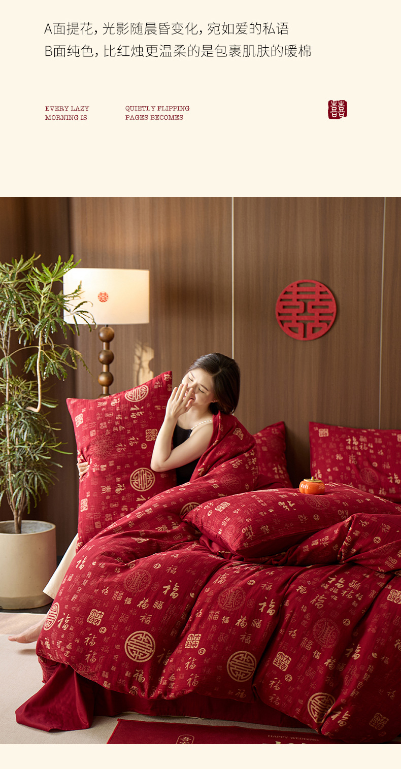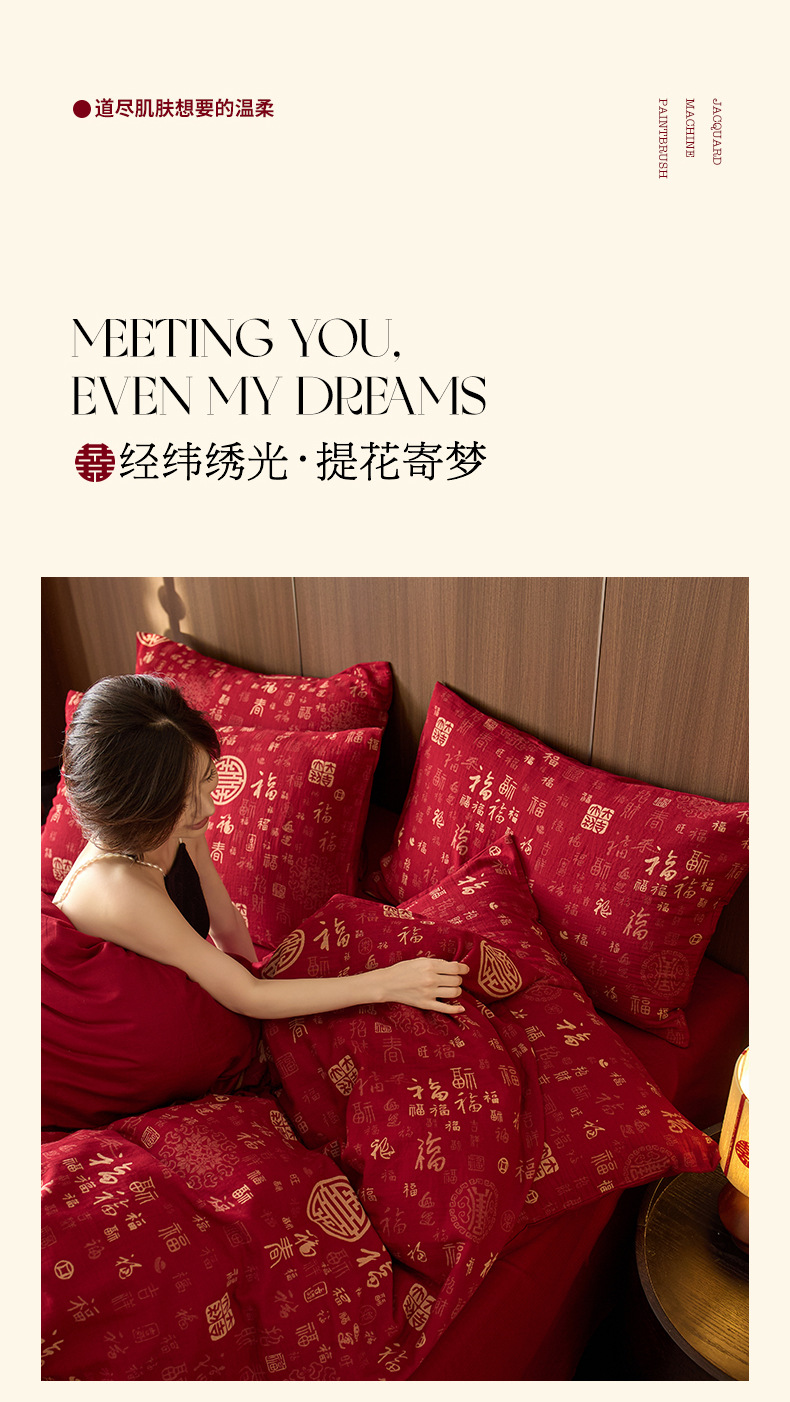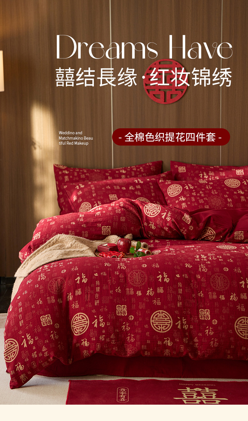 中式提花婚庆纯棉全棉床上四件套大红色婚房床单被套结婚陪嫁床品