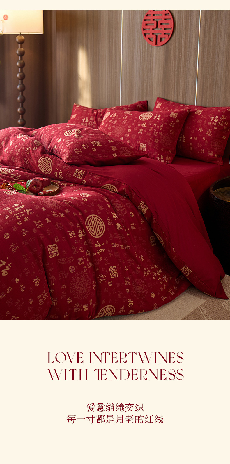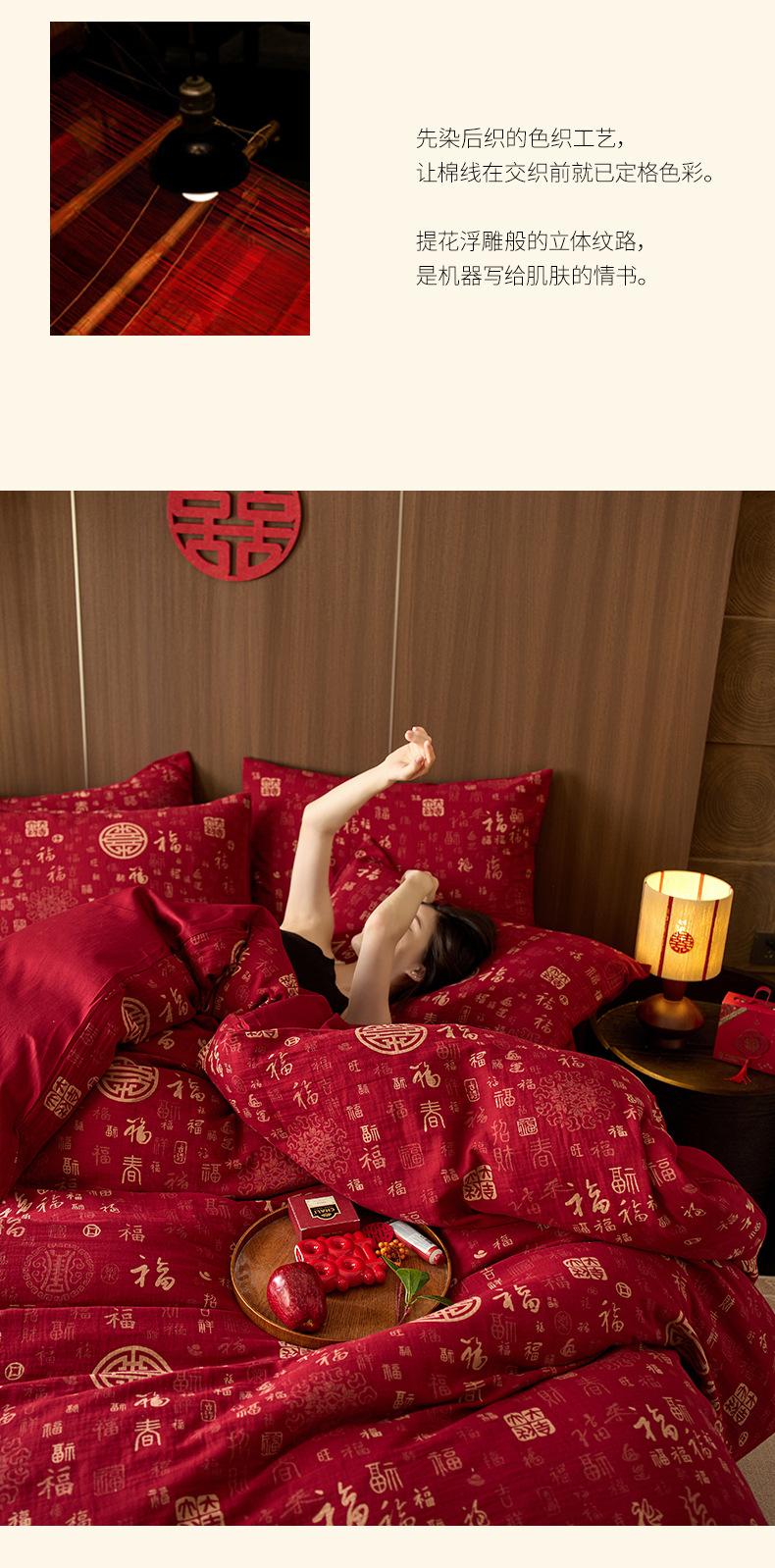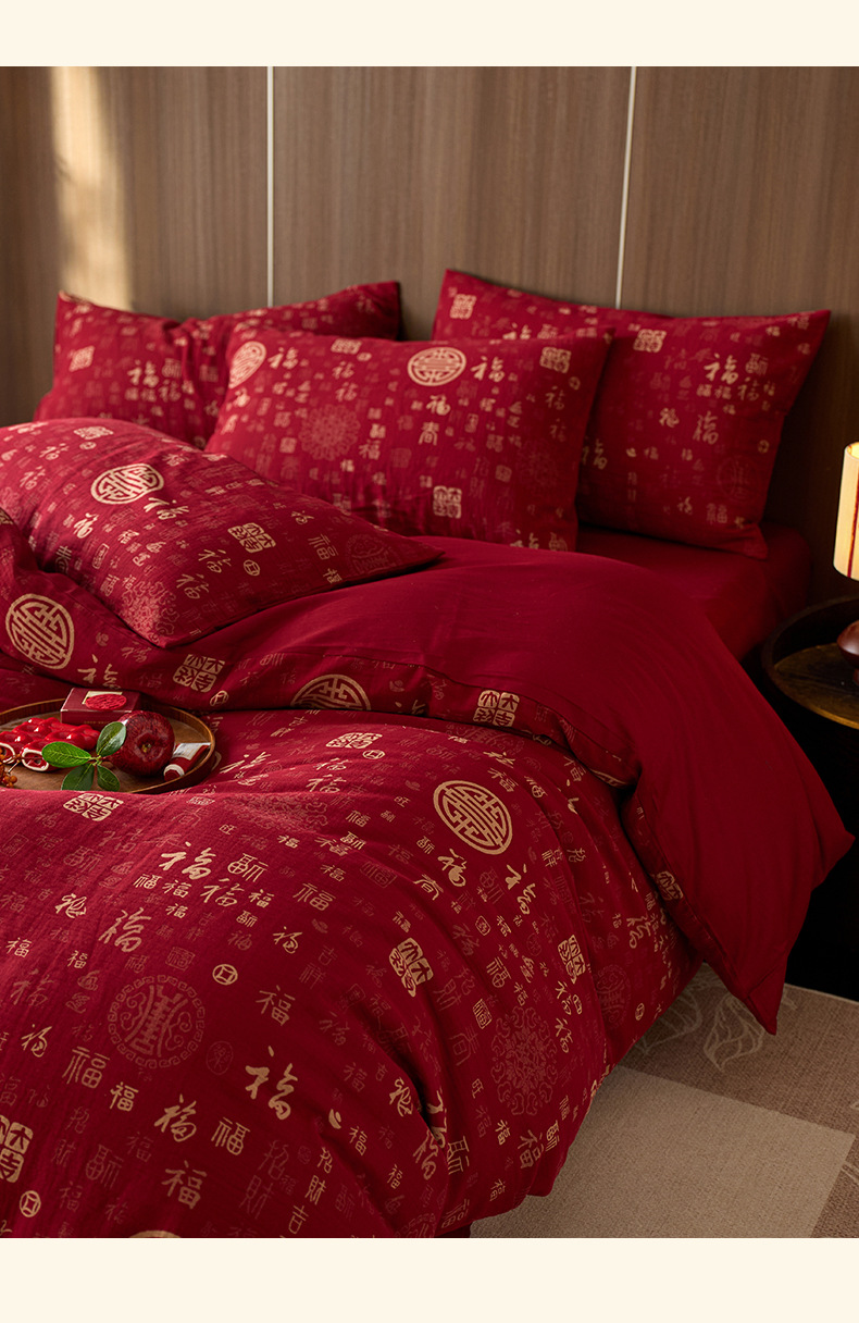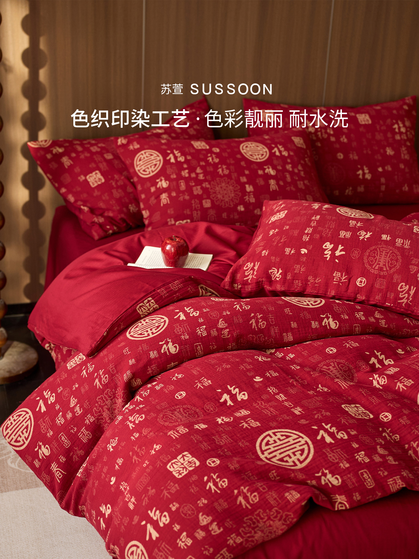 中式提花婚庆纯棉全棉床上四件套大红色婚房床单被套结婚陪嫁床品