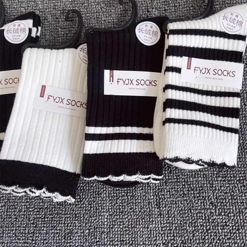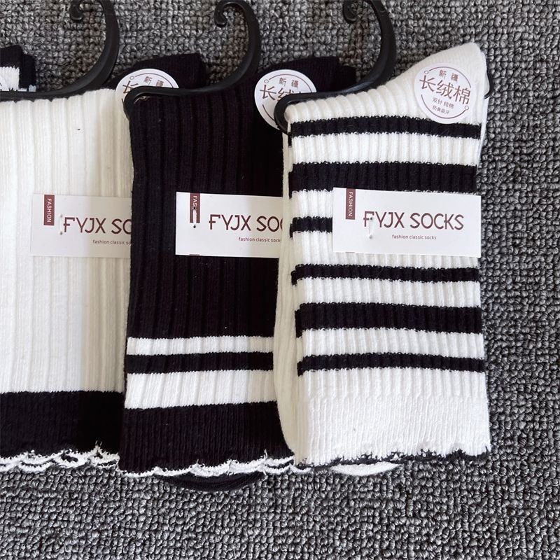 黑白条纹花边棉袜子女款长绒棉袜秋冬保暖ins中筒双针防臭女袜