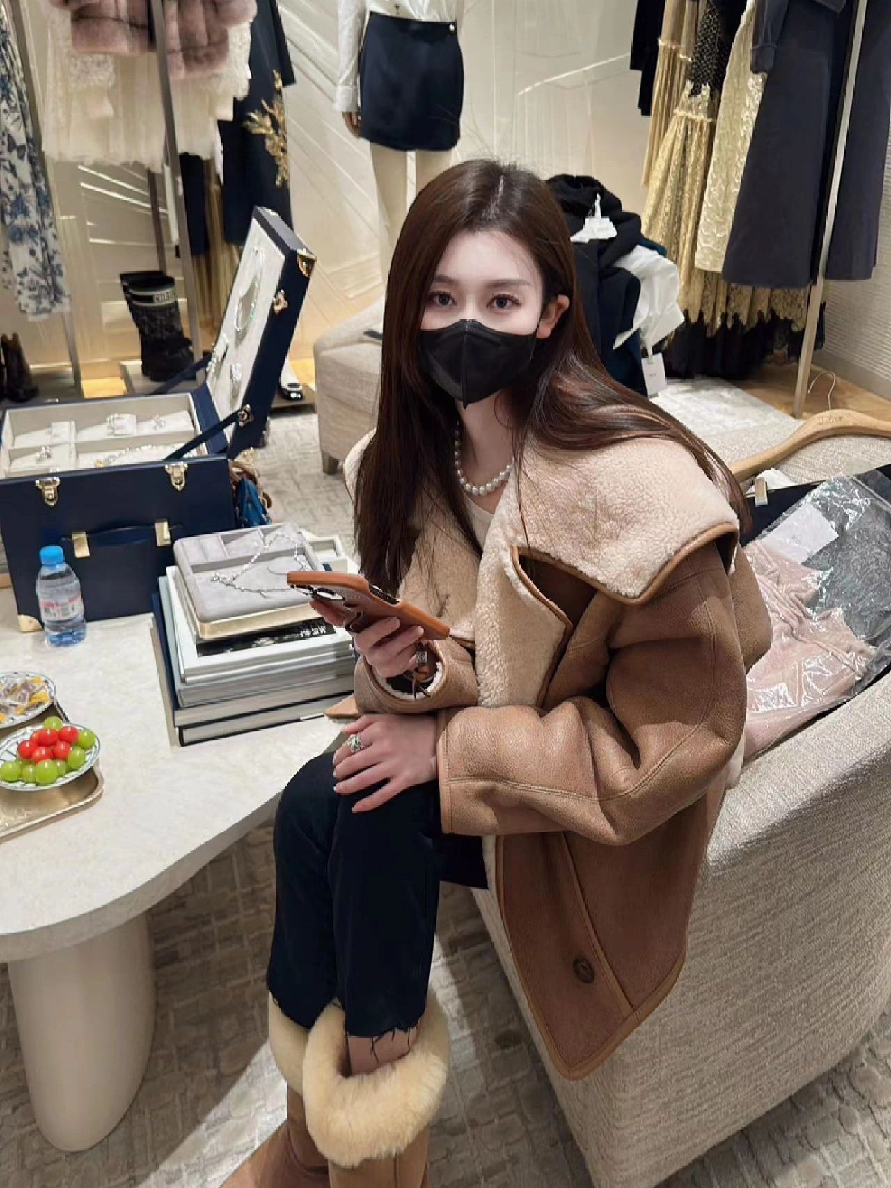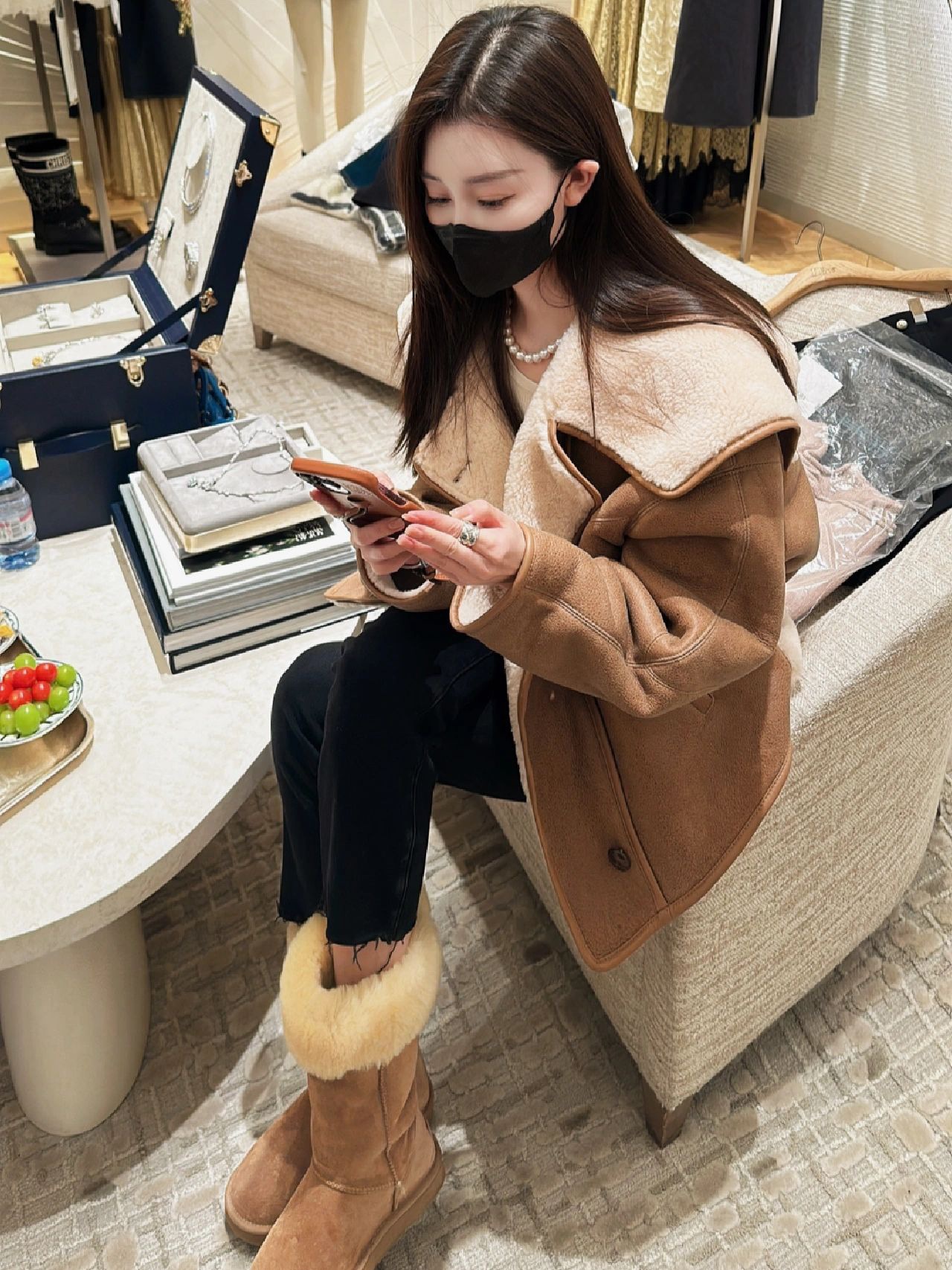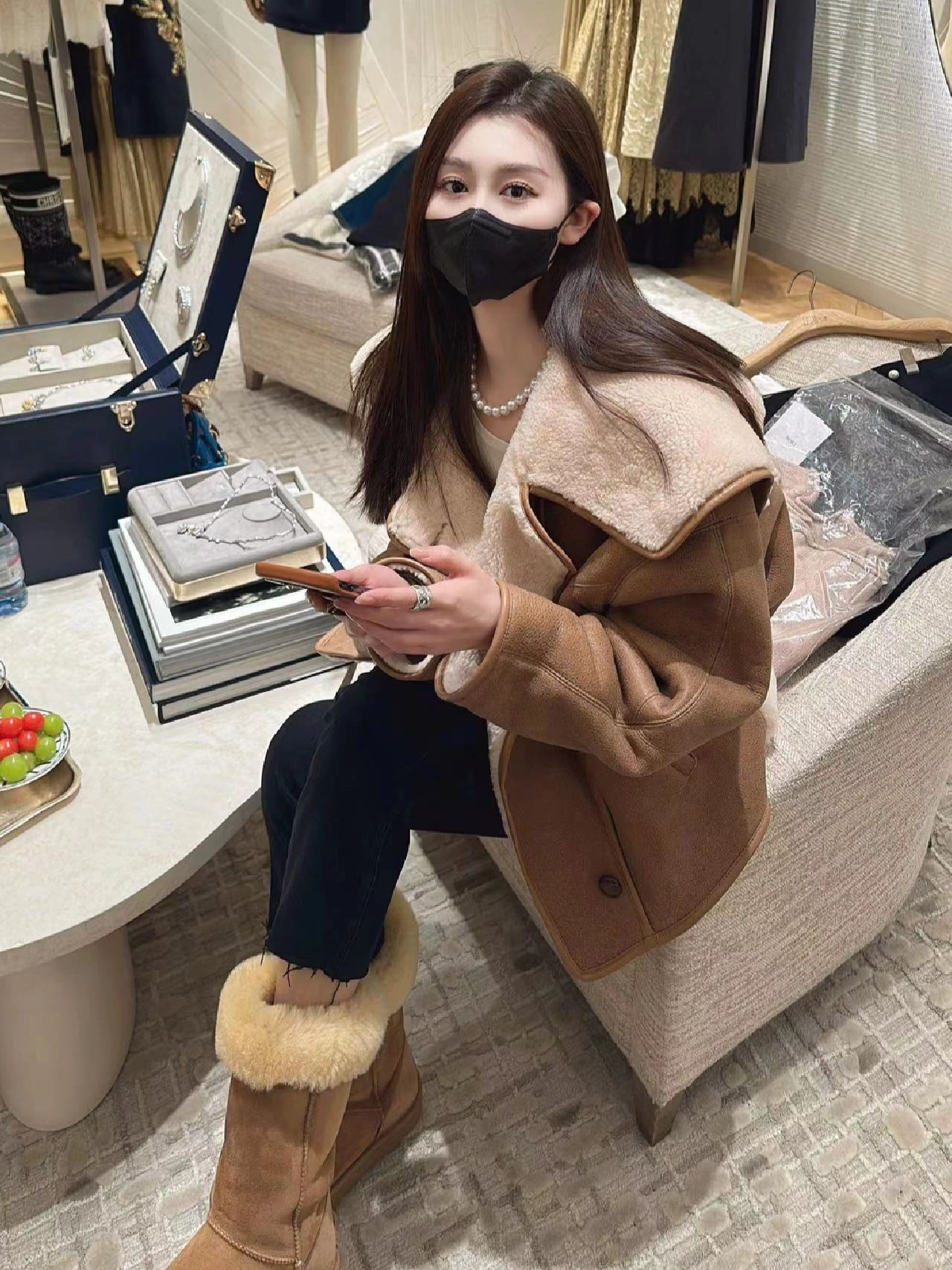 冬季复古简约皮毛一体加厚外套女浅咖色羊羔毛韩系大翻领夹克上衣