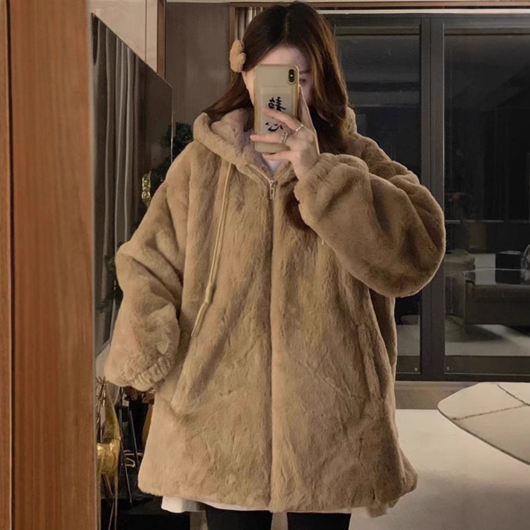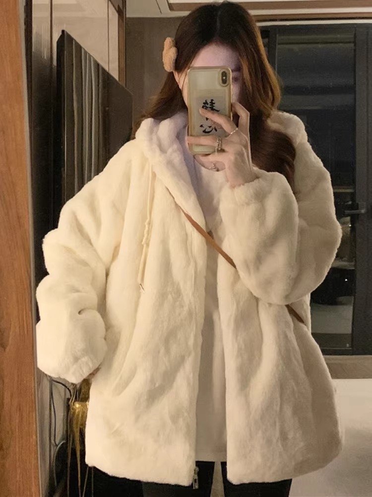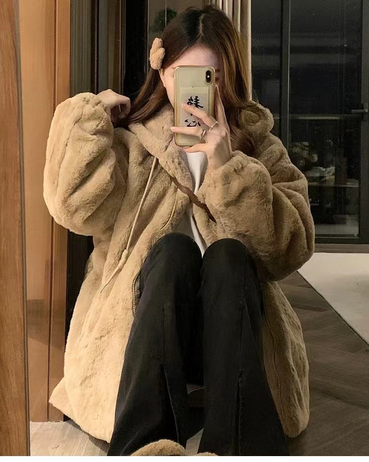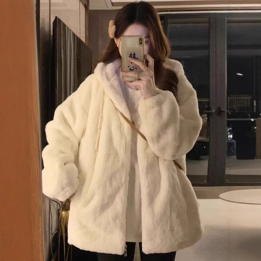 韩系毛茸茸羊羔毛连帽外套女2025秋冬季加绒加厚宽松毛绒棉衣保暖