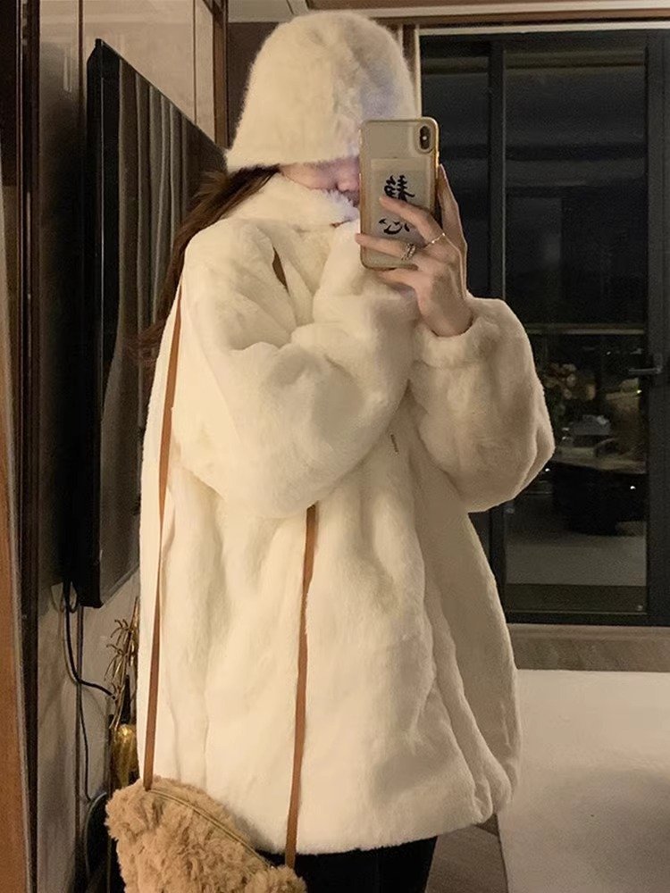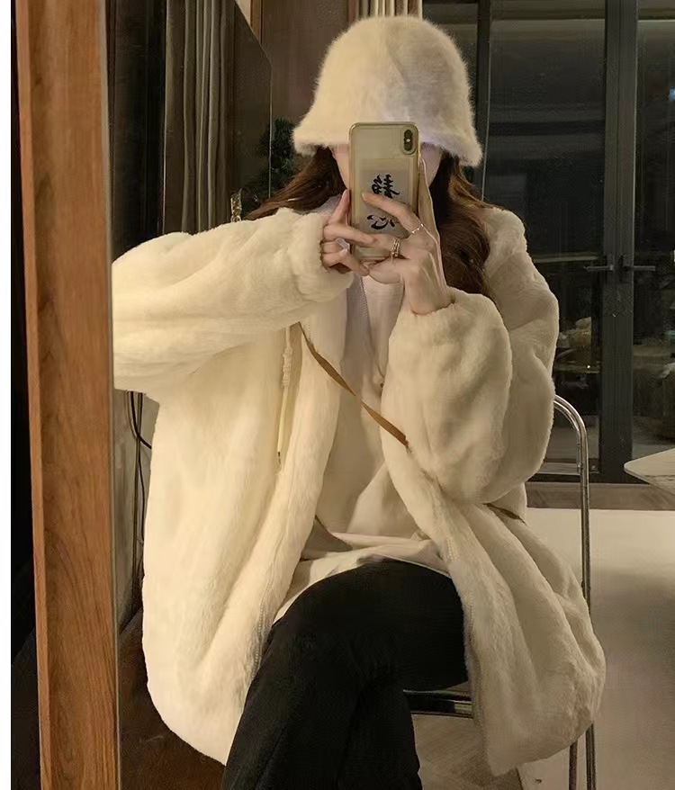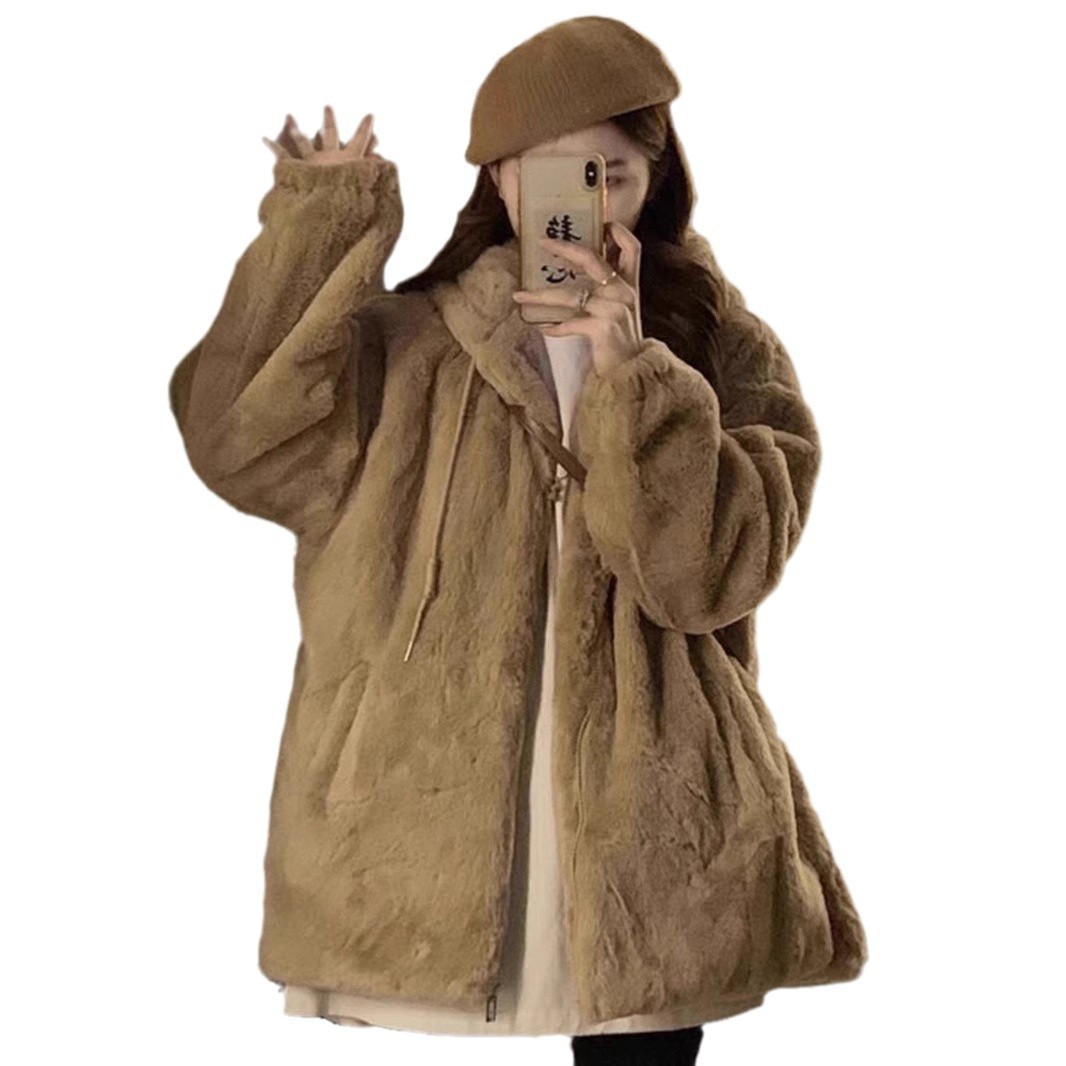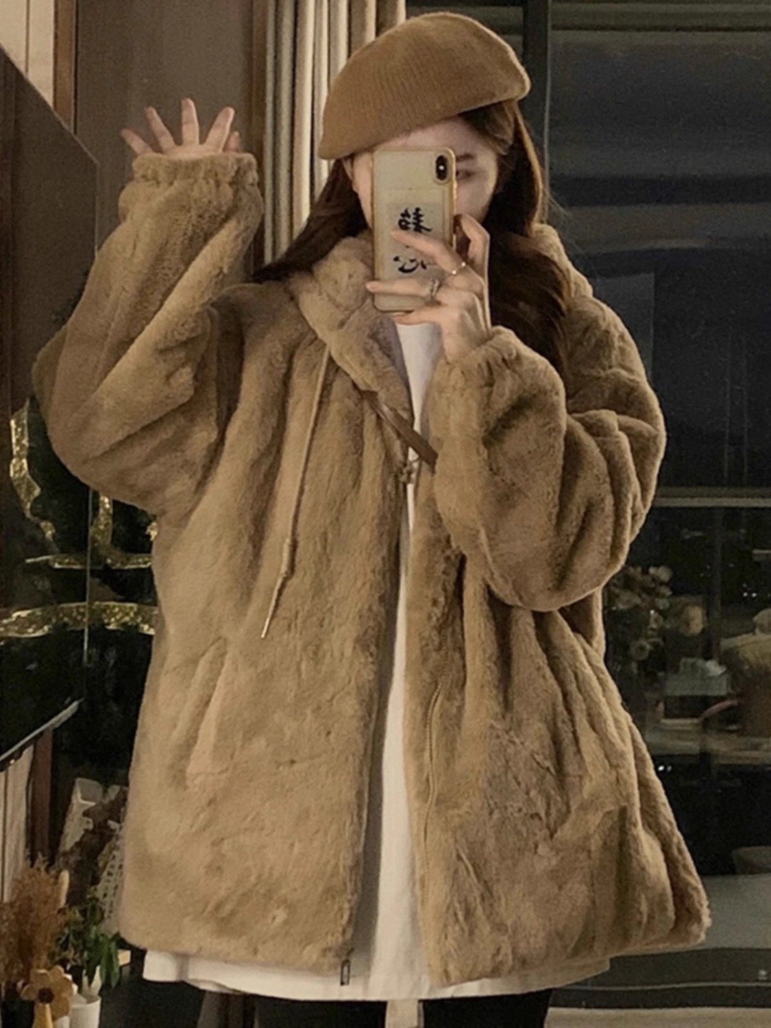 韩系毛茸茸羊羔毛连帽外套女2025秋冬季加绒加厚宽松毛绒棉衣保暖