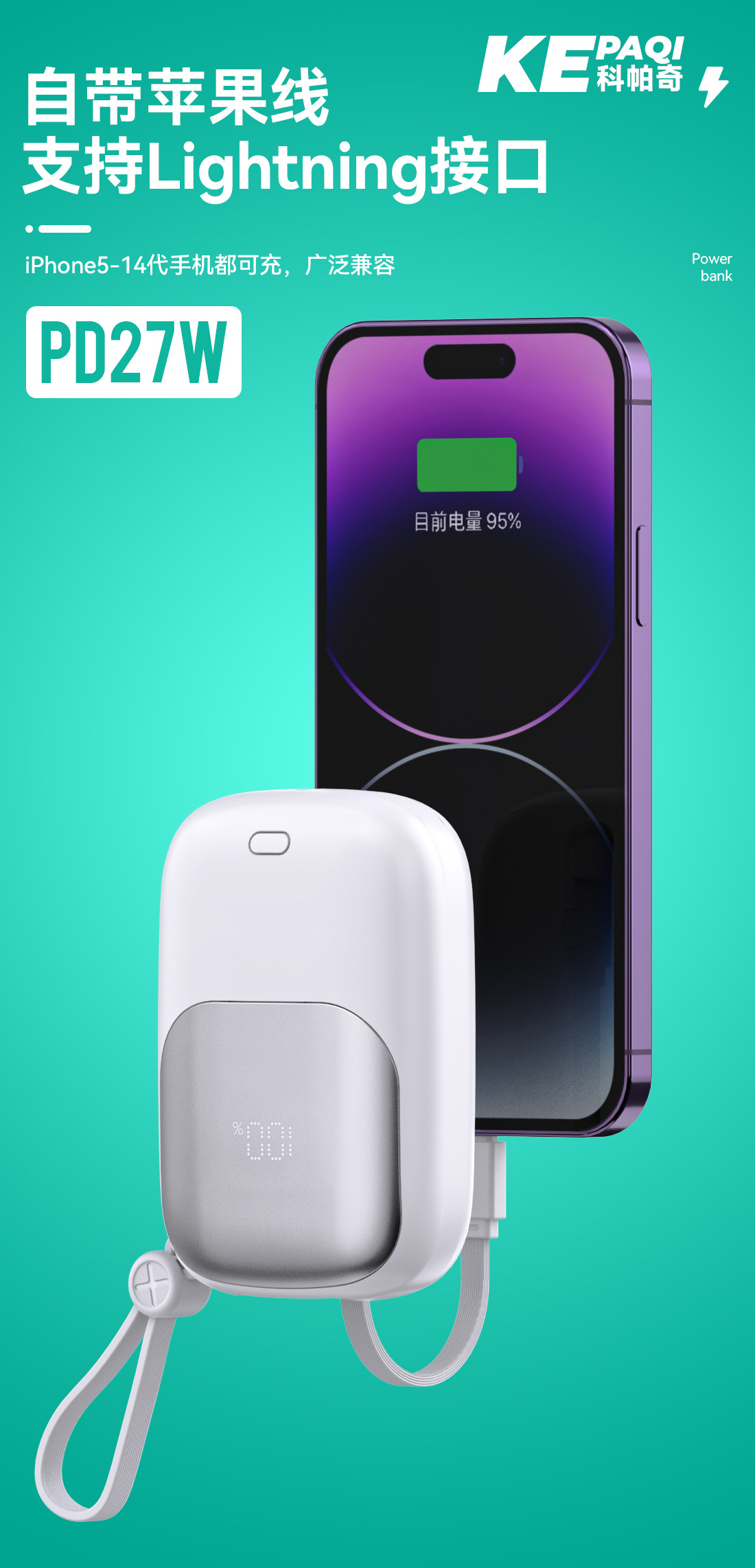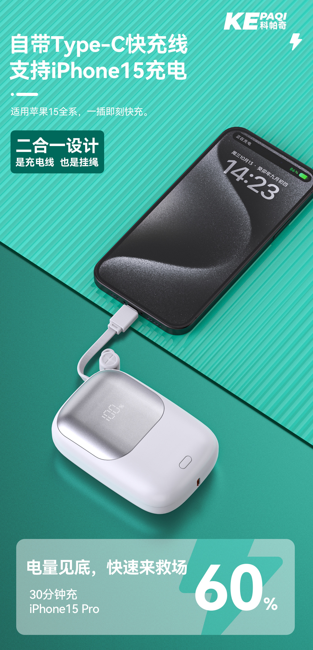 科帕奇3C认证1万毫安充电宝 自带Type-c快充线适用苹果15手机