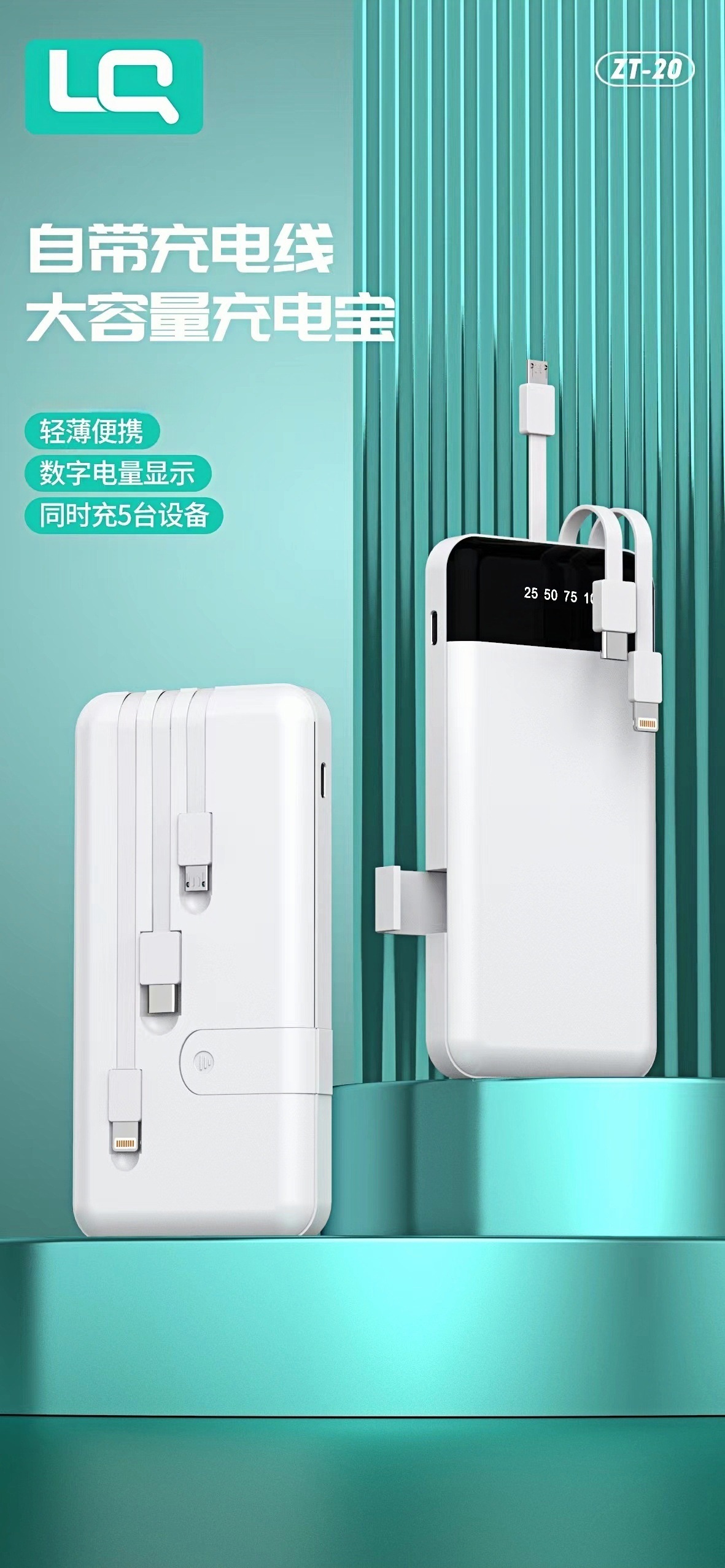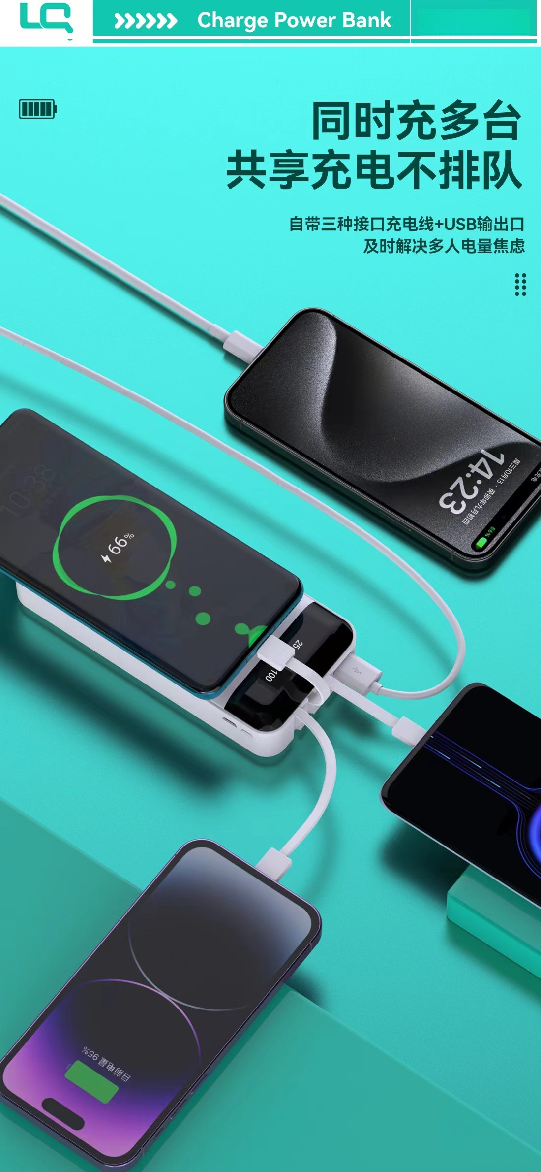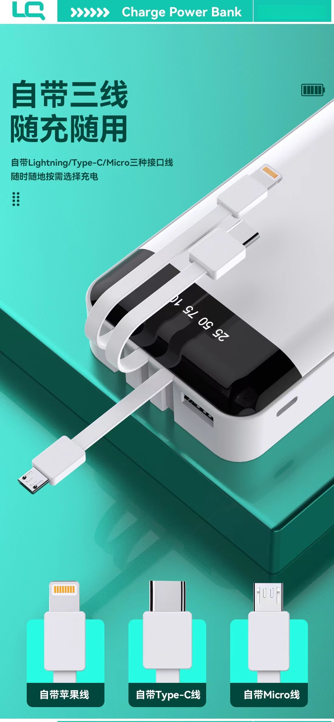 手机龙奇自带线三线10000毫安充电宝便携快充2万数显超大移动电源