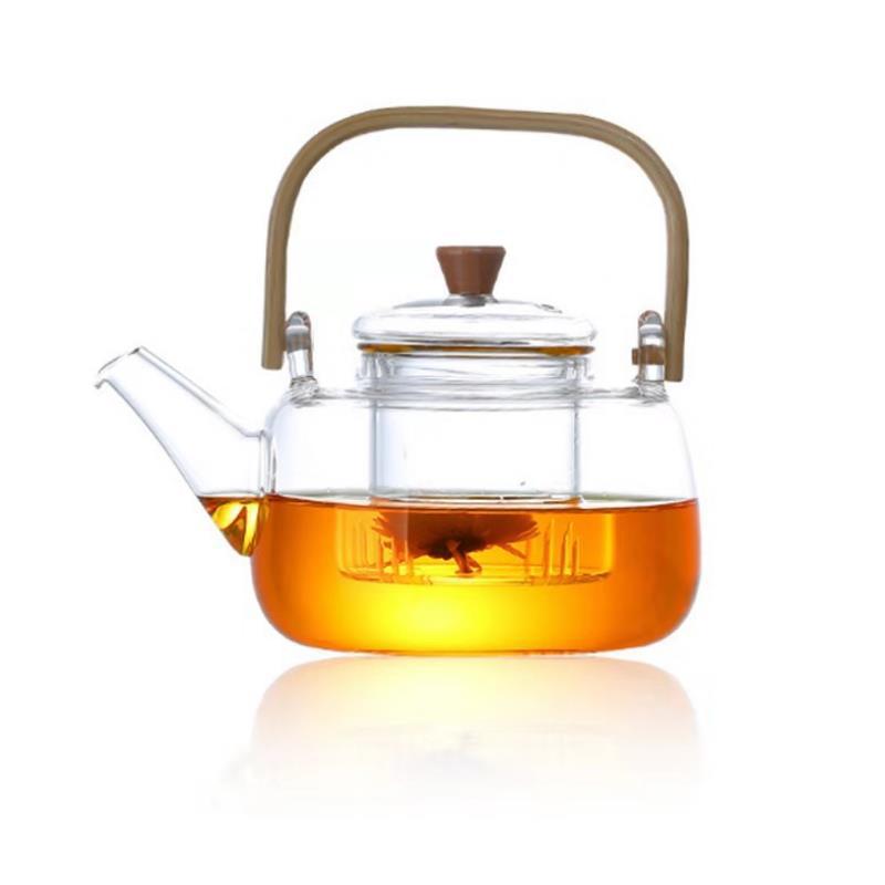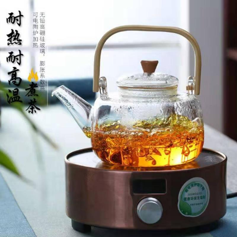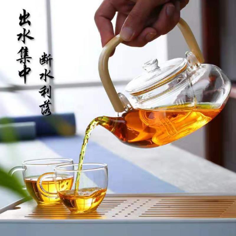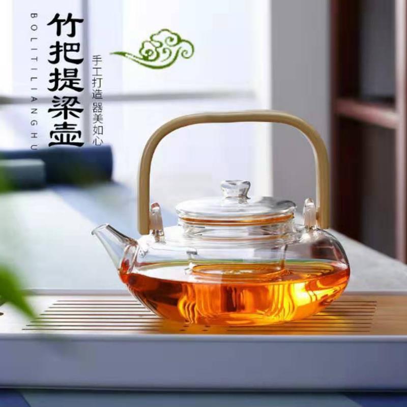 大号竹把提梁壶扁提梁茶壶 家用高硼硅玻璃花茶壶 可加热煮茶器