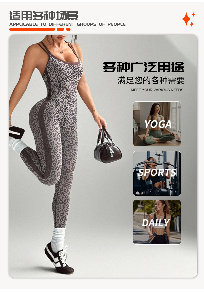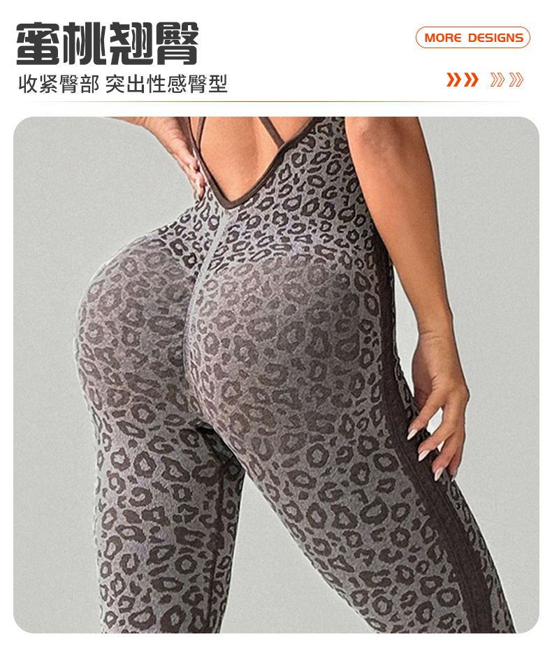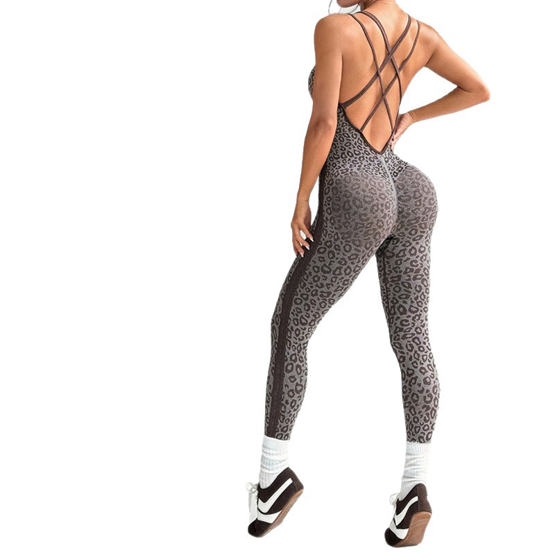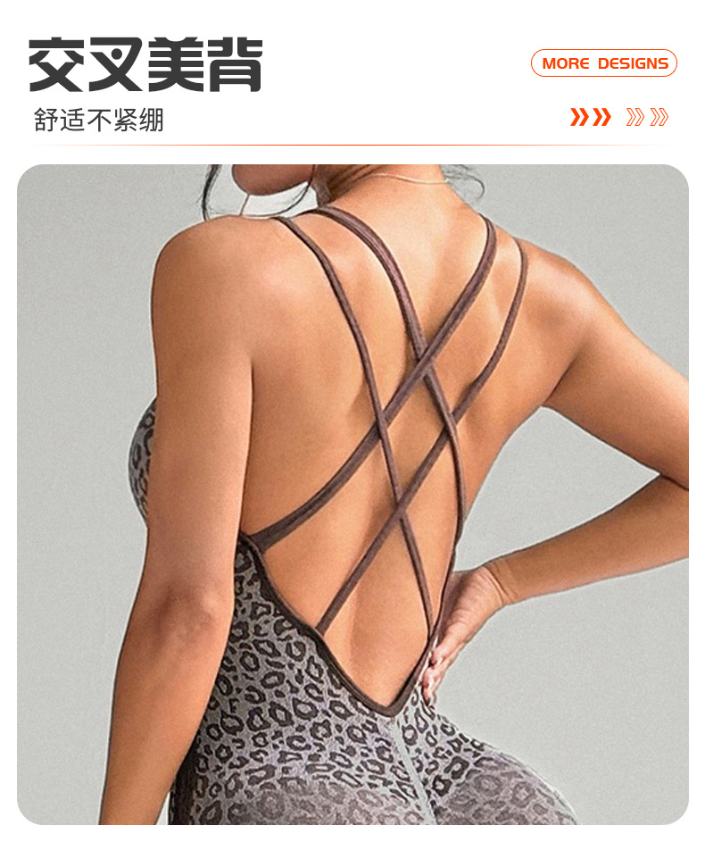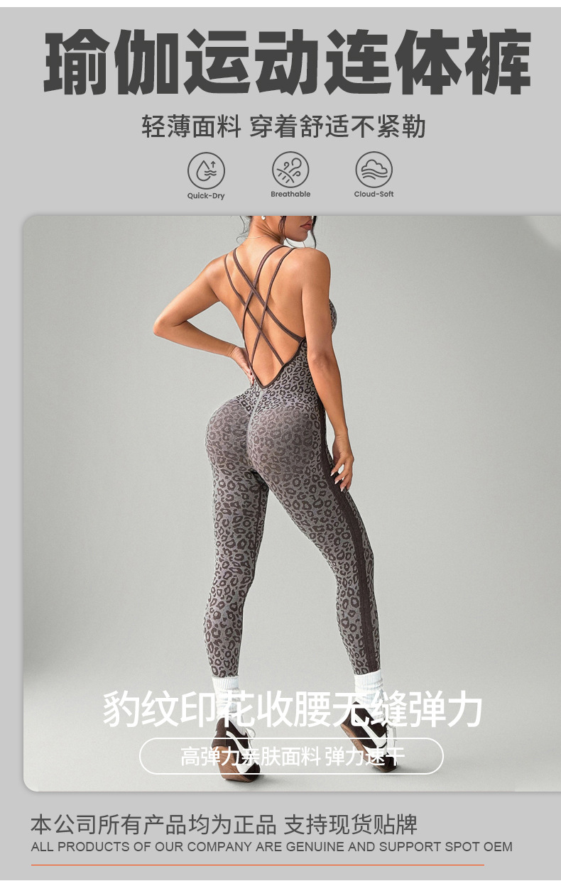 跨境磨砂豹纹印花连体裤女交叉吊带美背连身裤收腹提臀连体瑜伽服