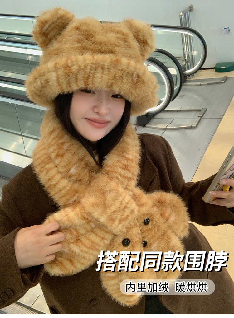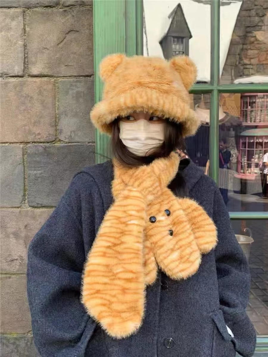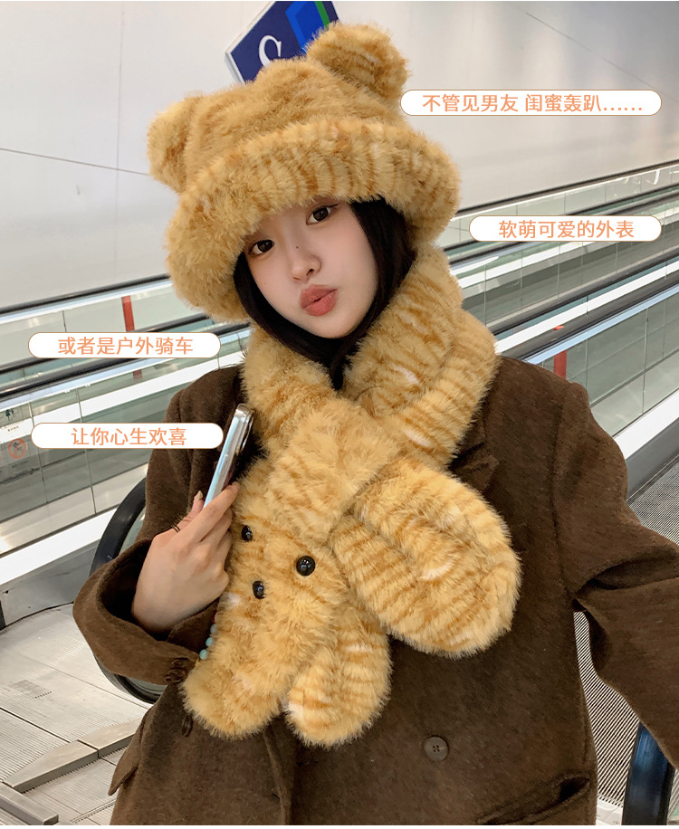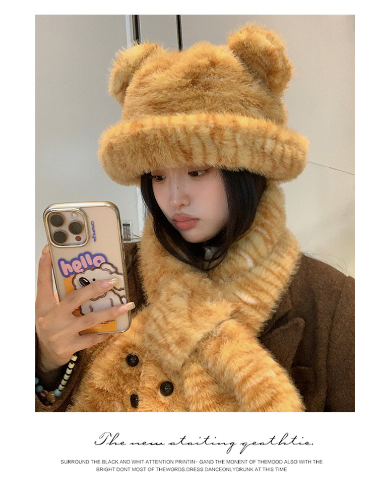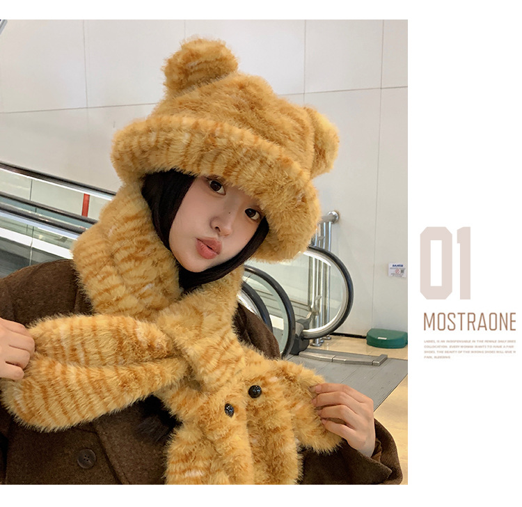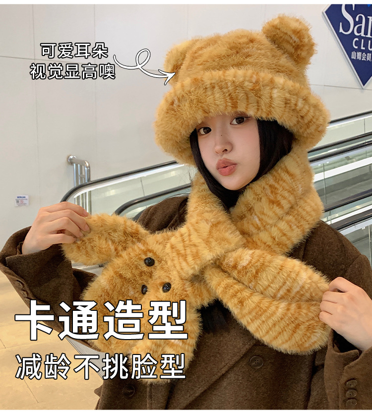 小老虎帽子围巾两件套女秋冬季可爱虎纹豹纹围脖加厚防寒毛绒虎头