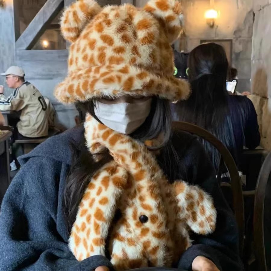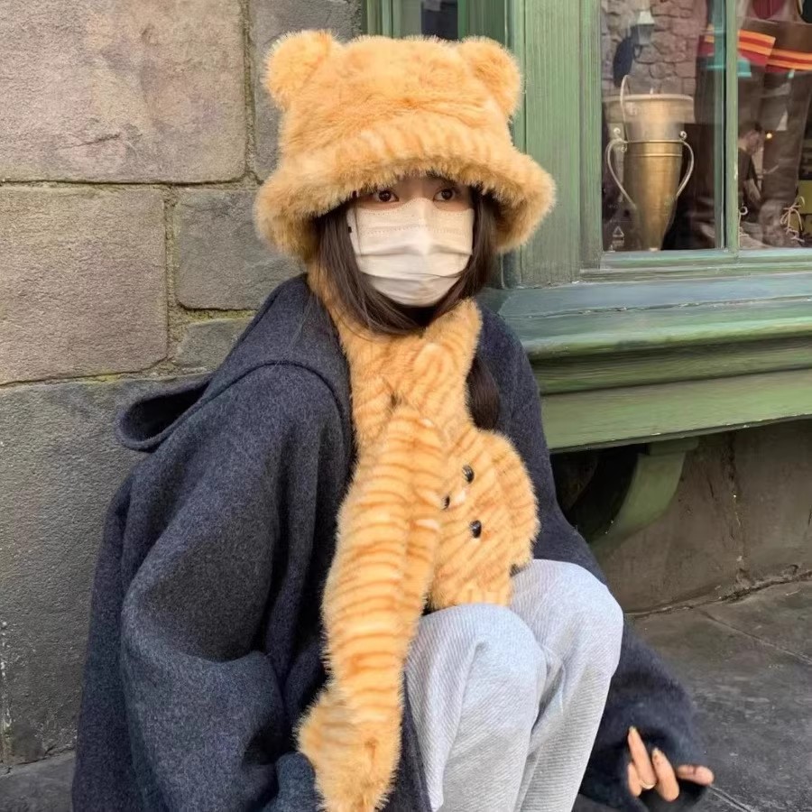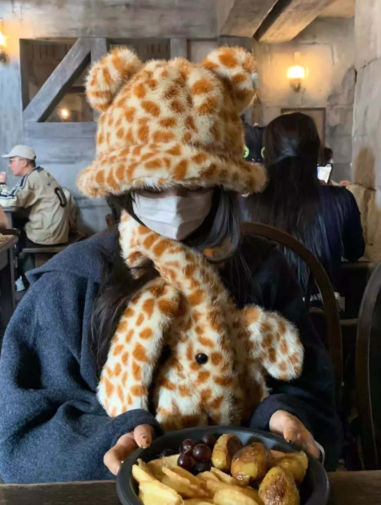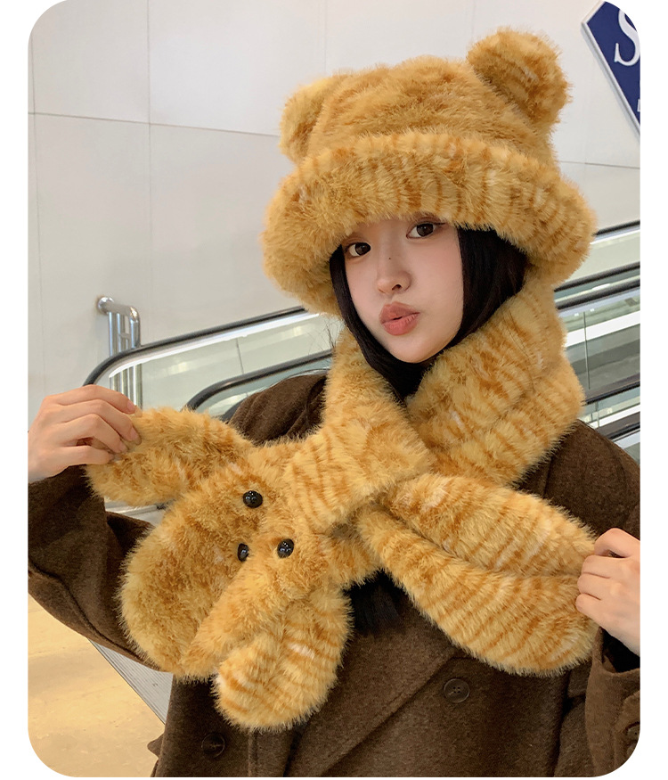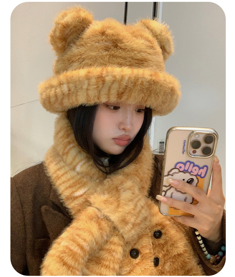 小老虎帽子围巾两件套女秋冬季可爱虎纹豹纹围脖加厚防寒毛绒虎头