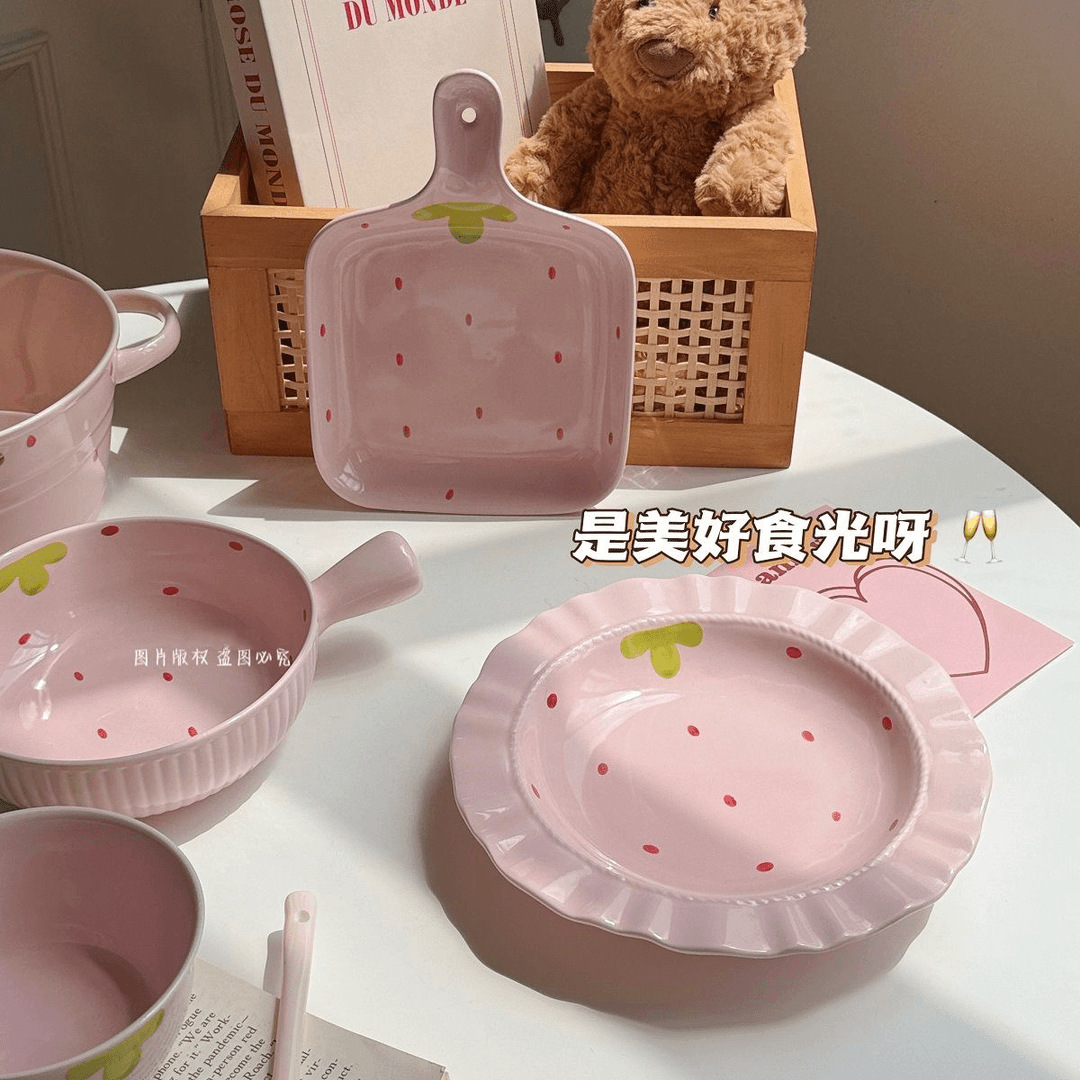 ins风草莓陶瓷碗碟家用手把盘子泡面碗2024年高颜值餐具碗碟套装