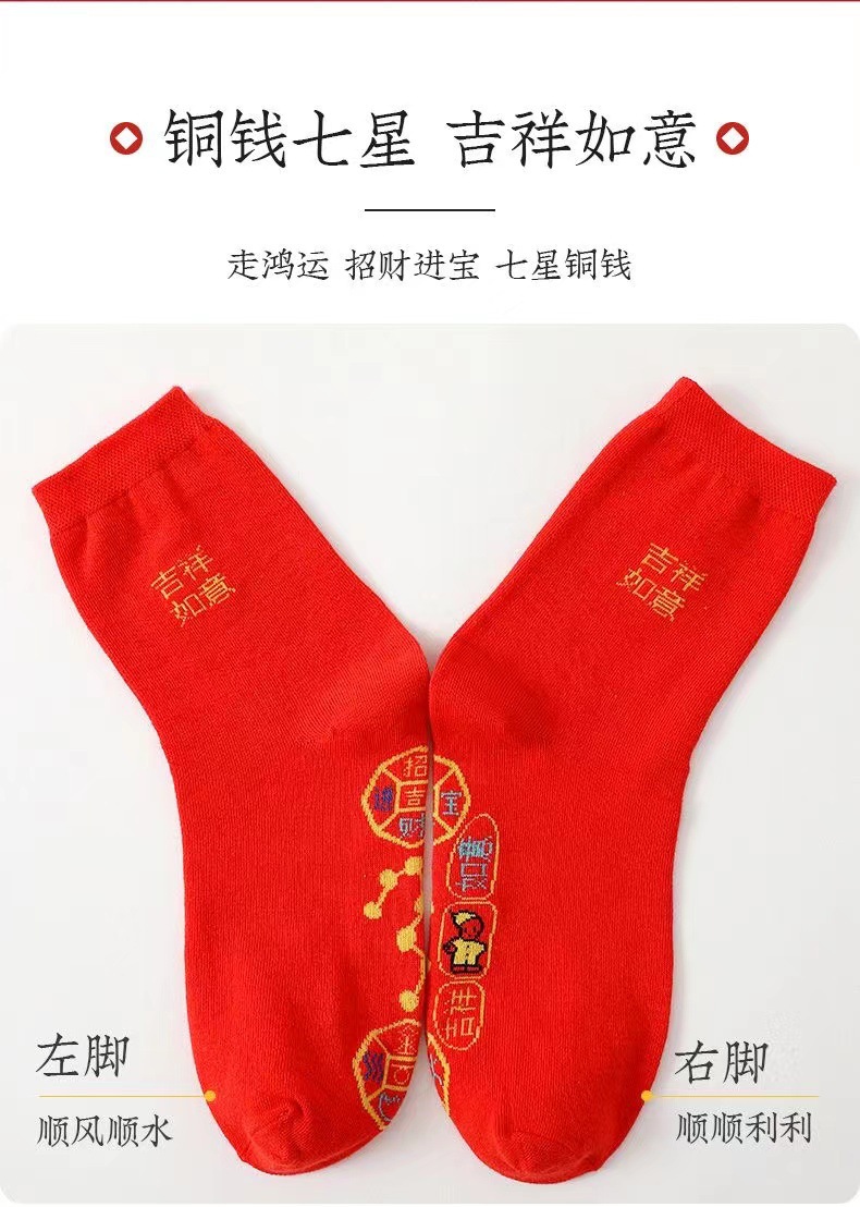 脚踏铜钱七星袜吉祥透气新年中筒男女同款秋冬保暖红袜子