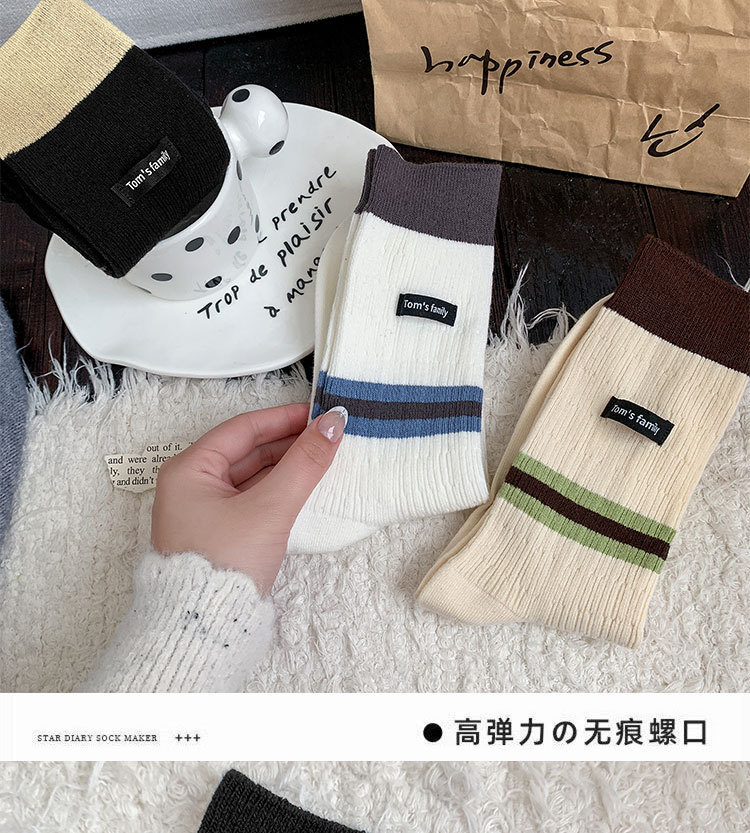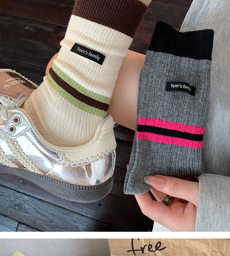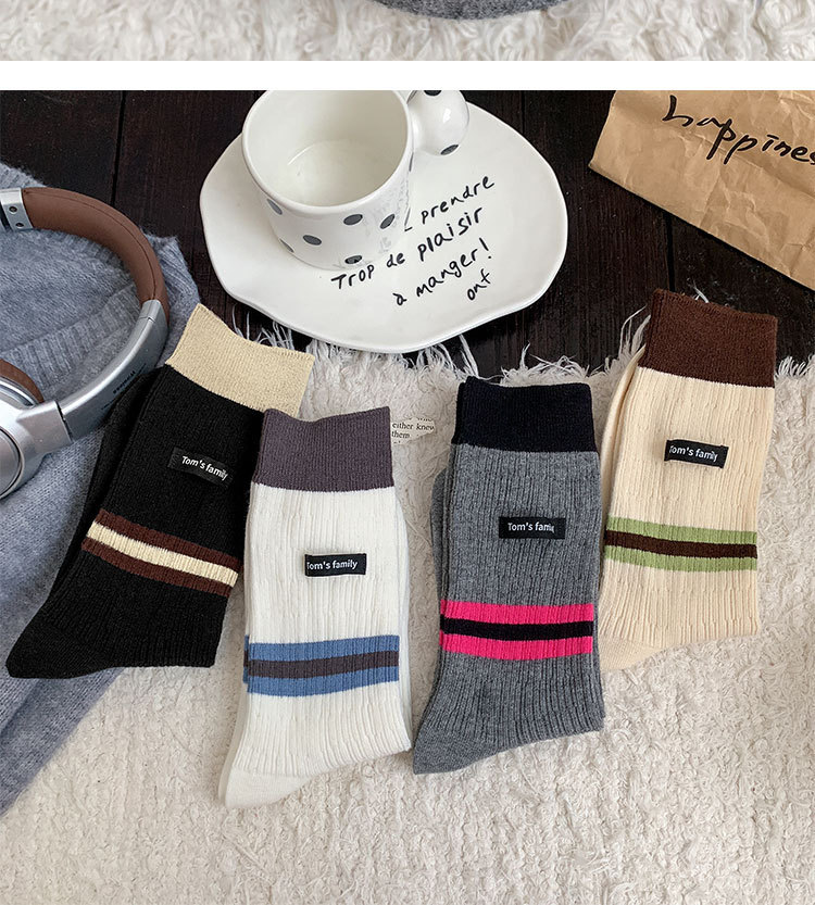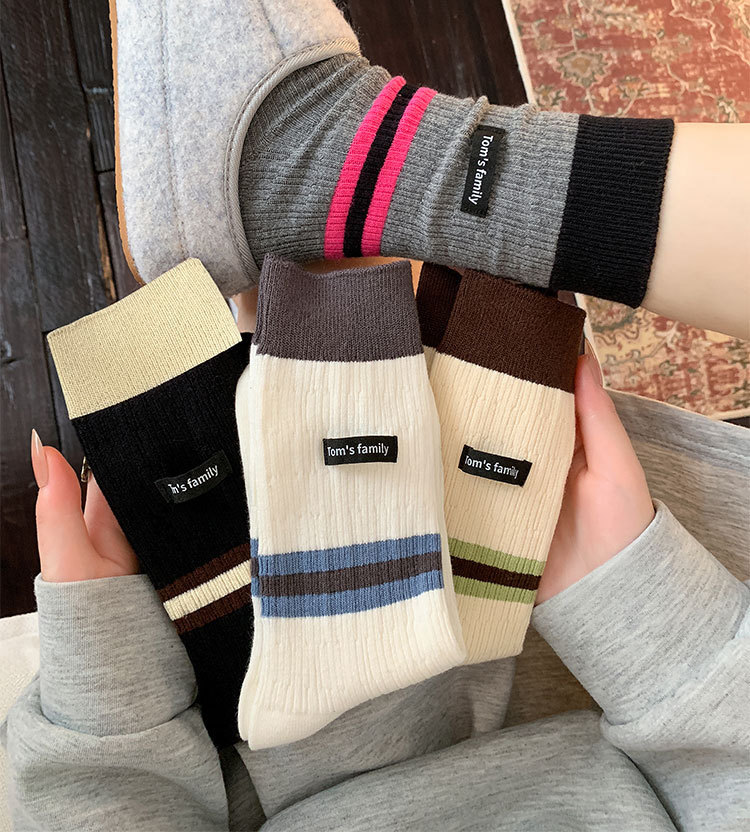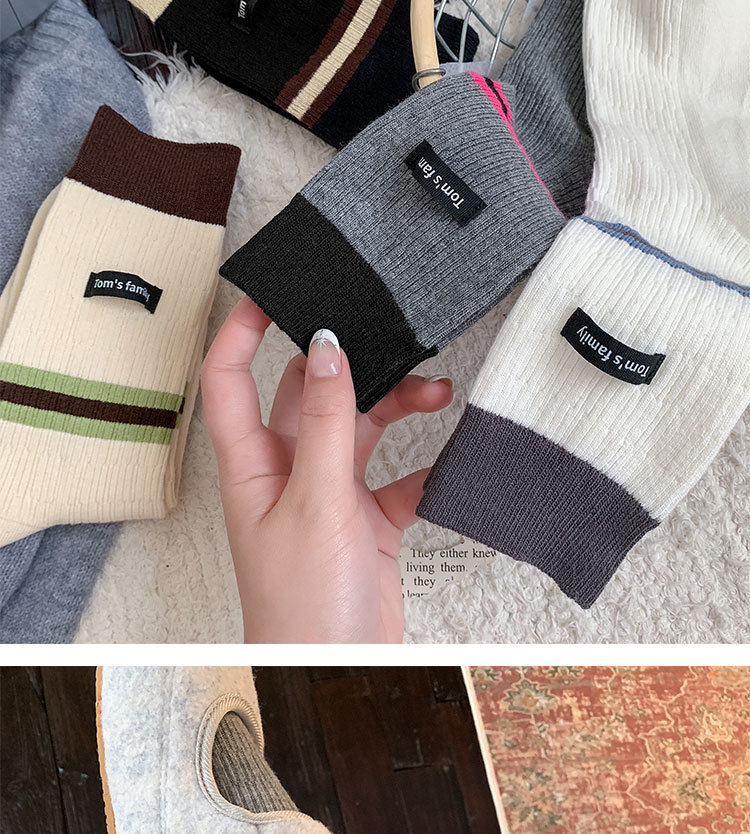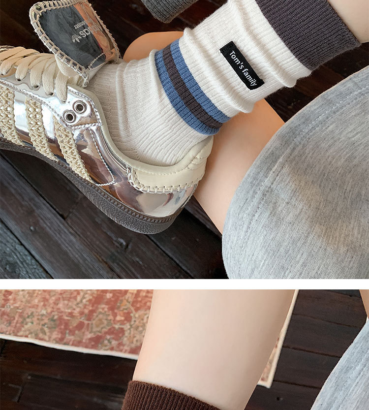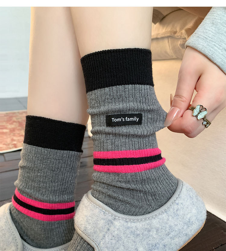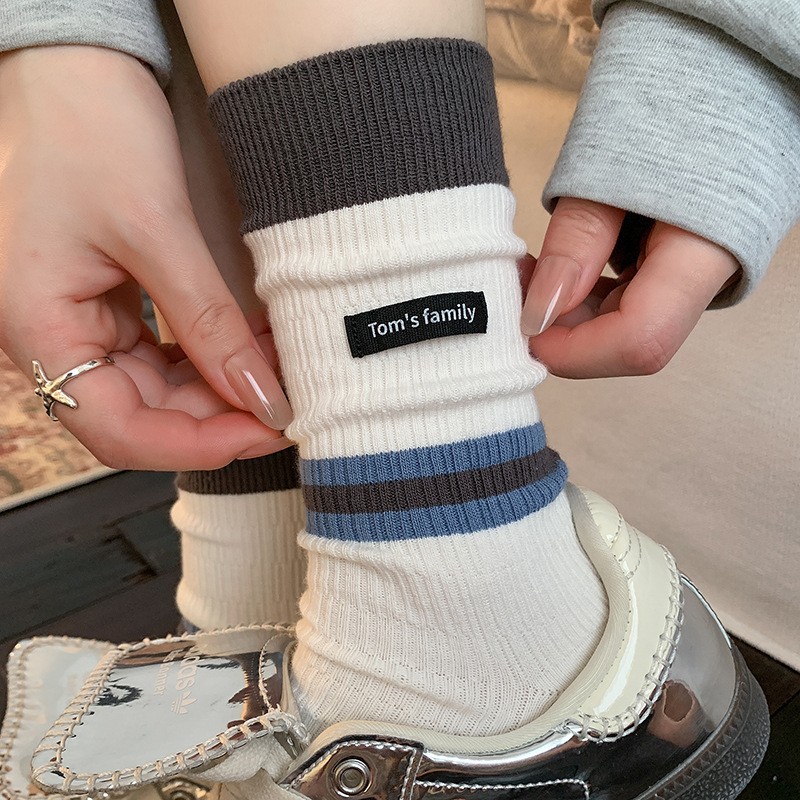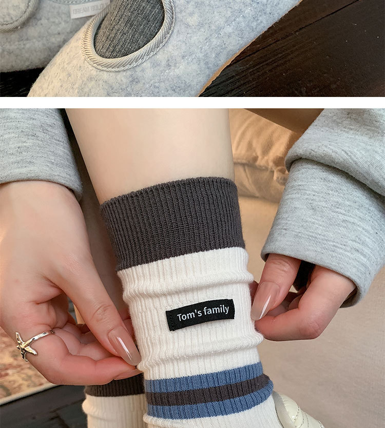 袜子女纯棉堆堆袜秋冬季ins潮美拉德拼色条纹布标字母全棉中筒袜