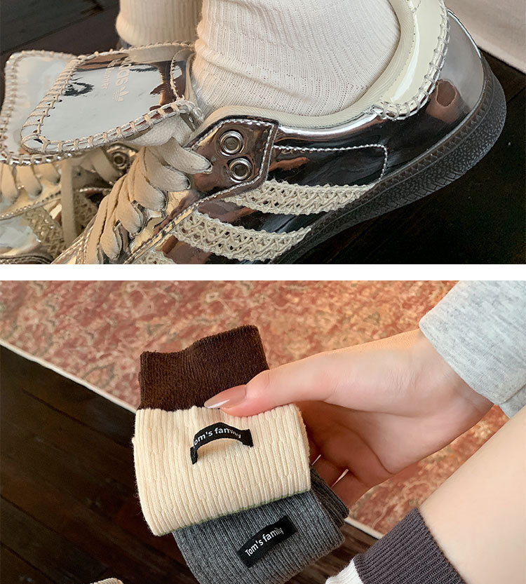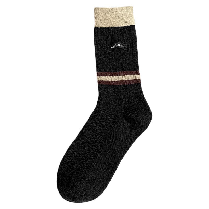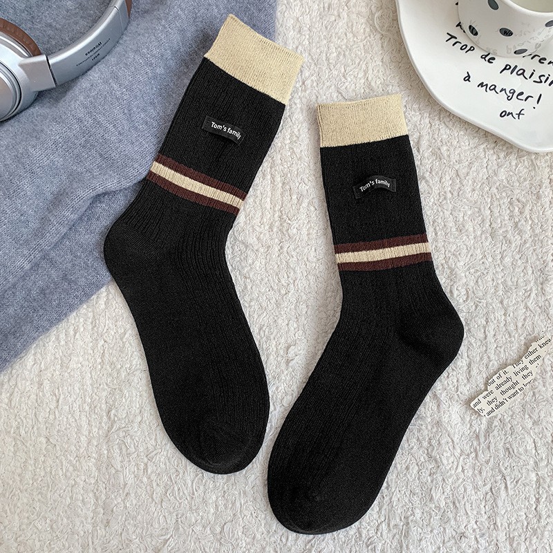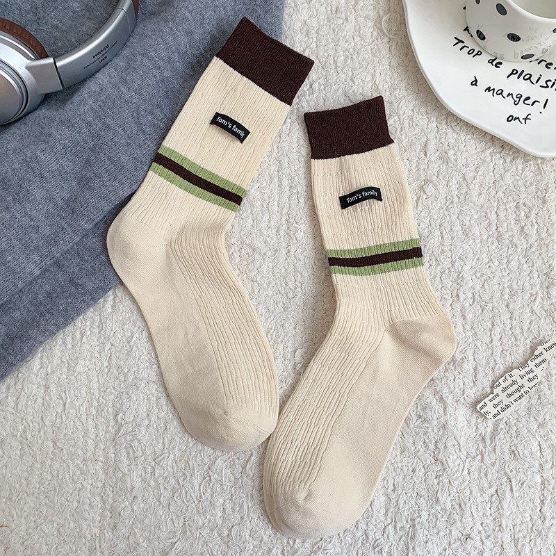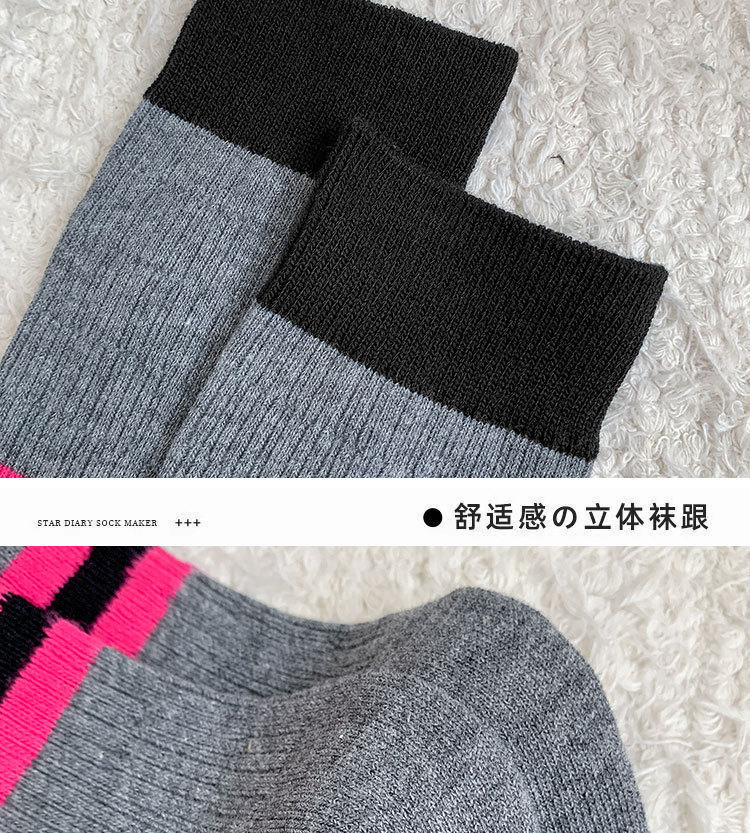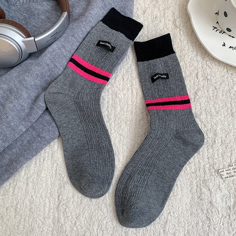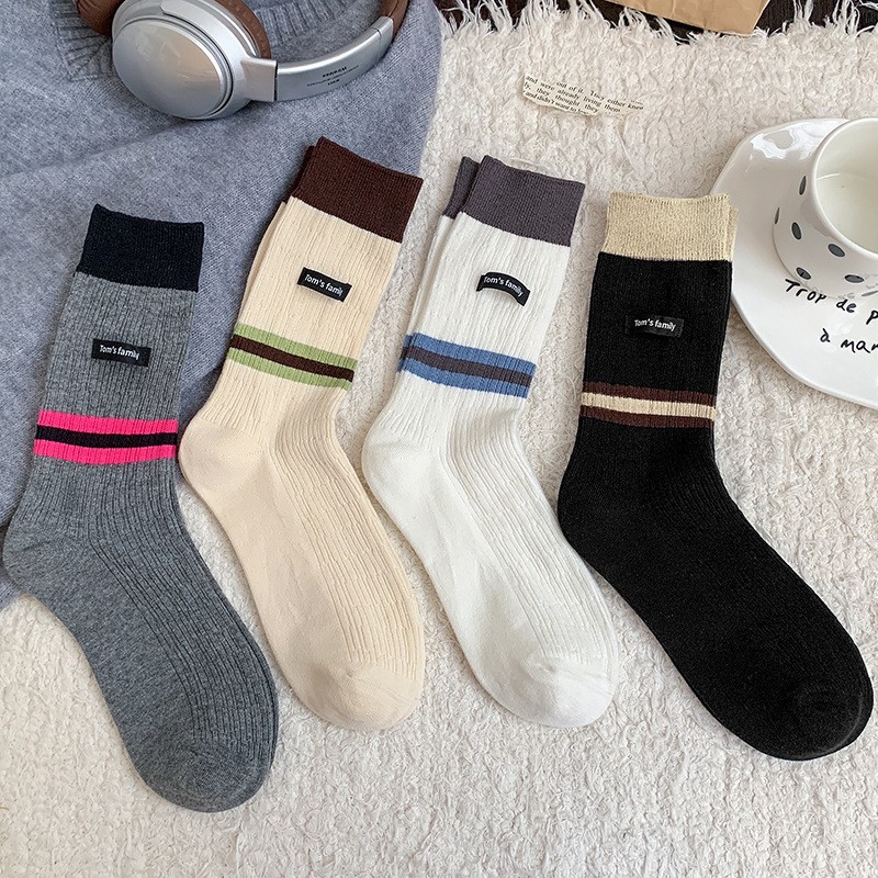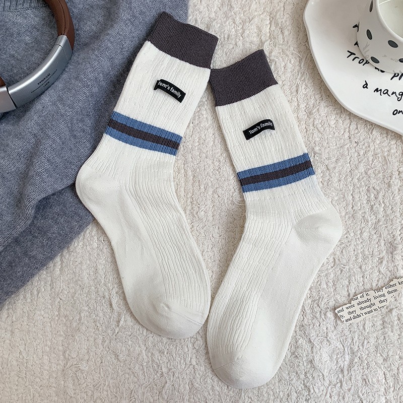 袜子女纯棉堆堆袜秋冬季ins潮美拉德拼色条纹布标字母全棉中筒袜
