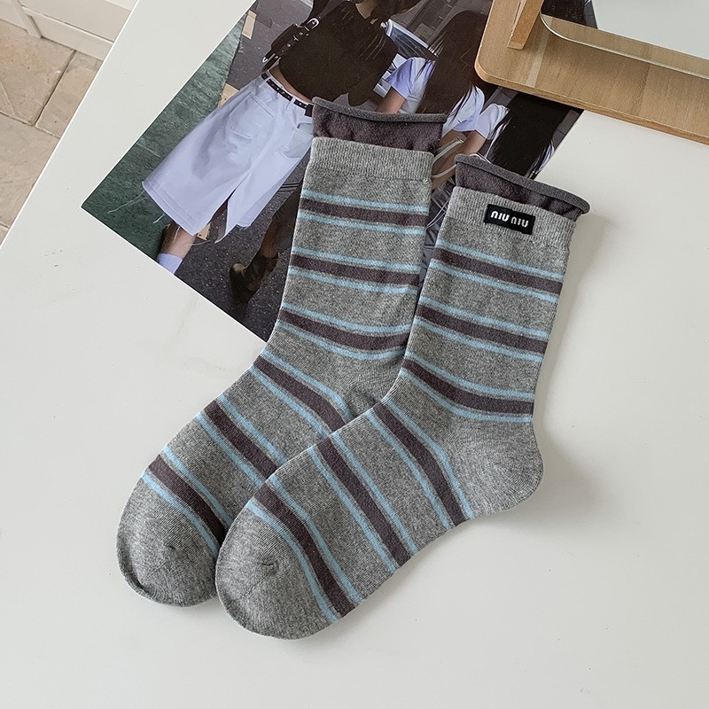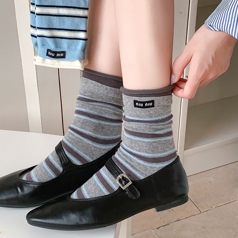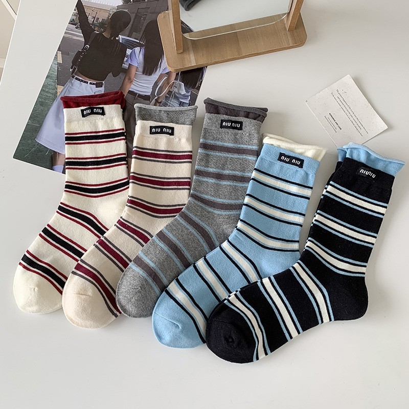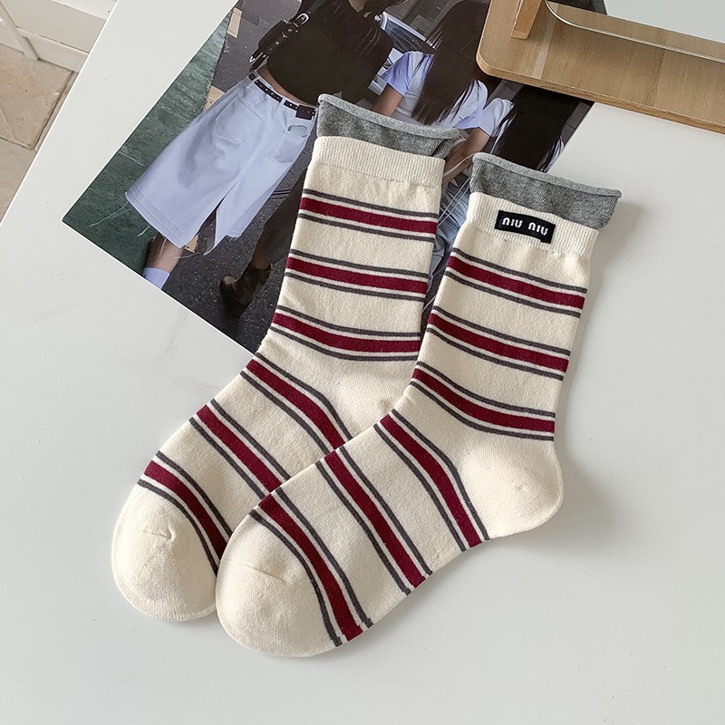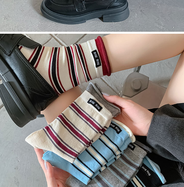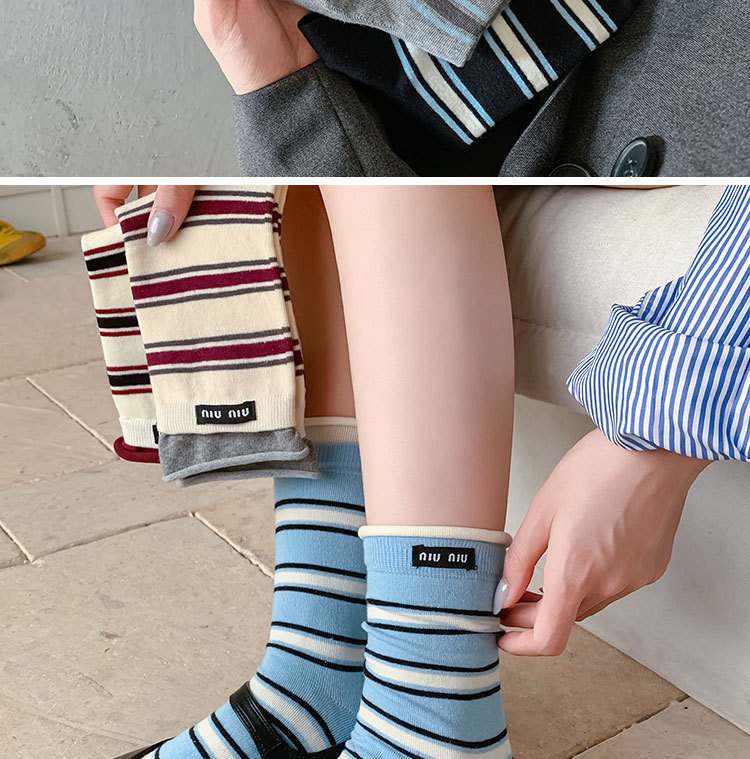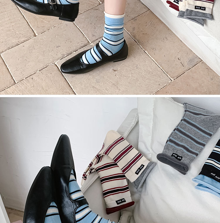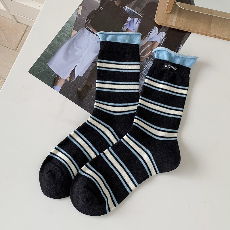 条纹袜子女堆堆袜春秋季薄款miu系双层口卷边ins潮流纯棉中筒袜女